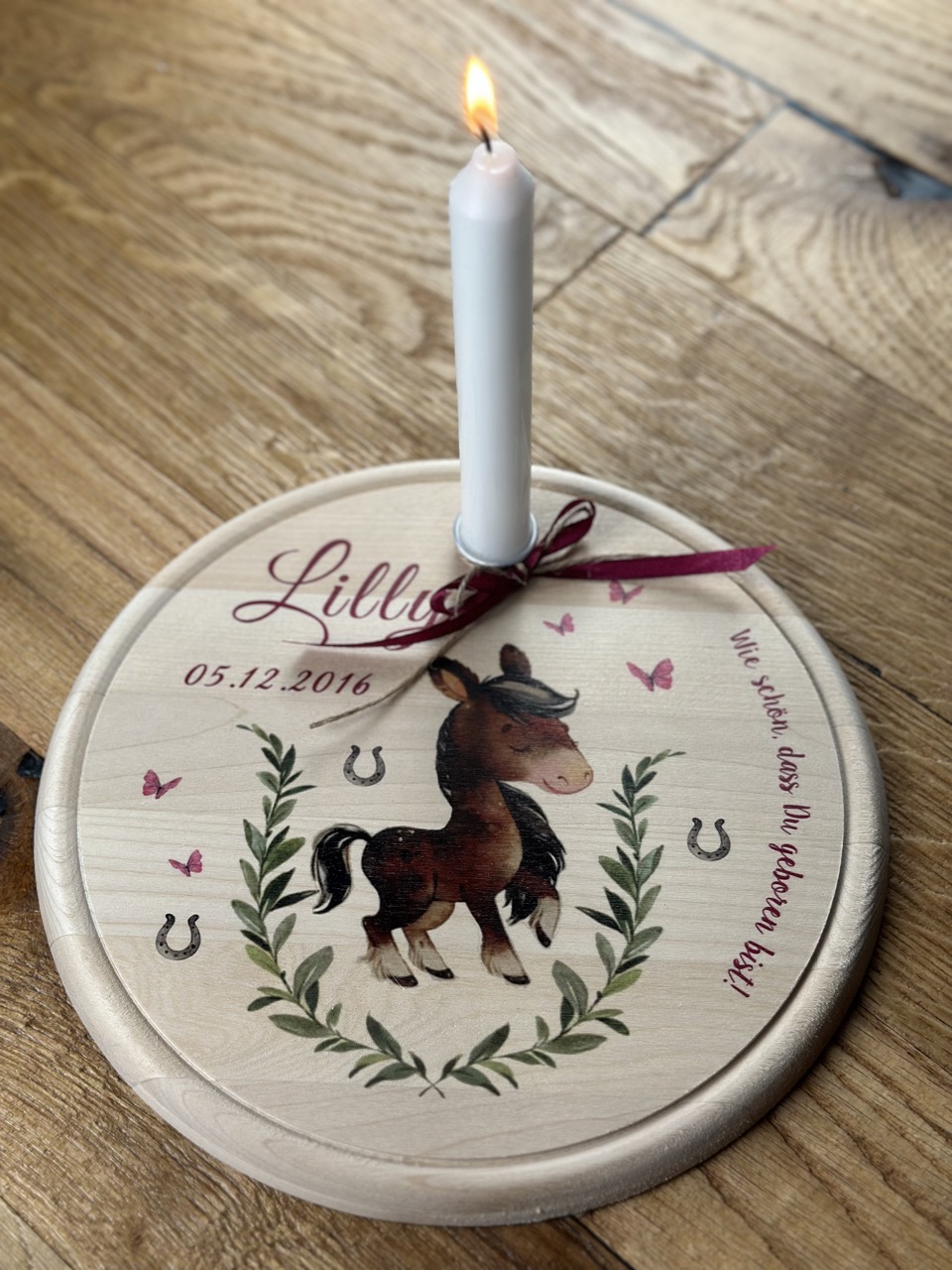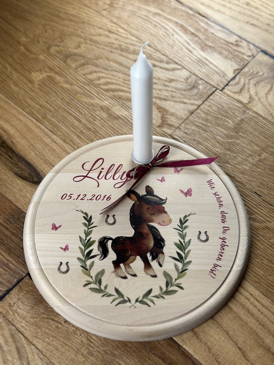 Unser runder Geburtstagsteller aus Holz mit dem Motiv Pferdchen in braun und pink ist nicht nur ein praktisches Utensil für die Geburtstagstafel, sondern auch eine wunderschöne Erinnerung an einen besonderen Tag. Sichern Sie sich jetzt diesen einzigartigen Teller und machen Sie den Geburtstag Ihres Kindes zu etwas ganz Besonderem!