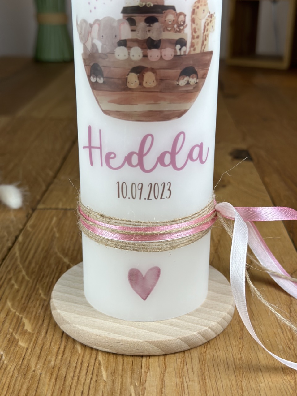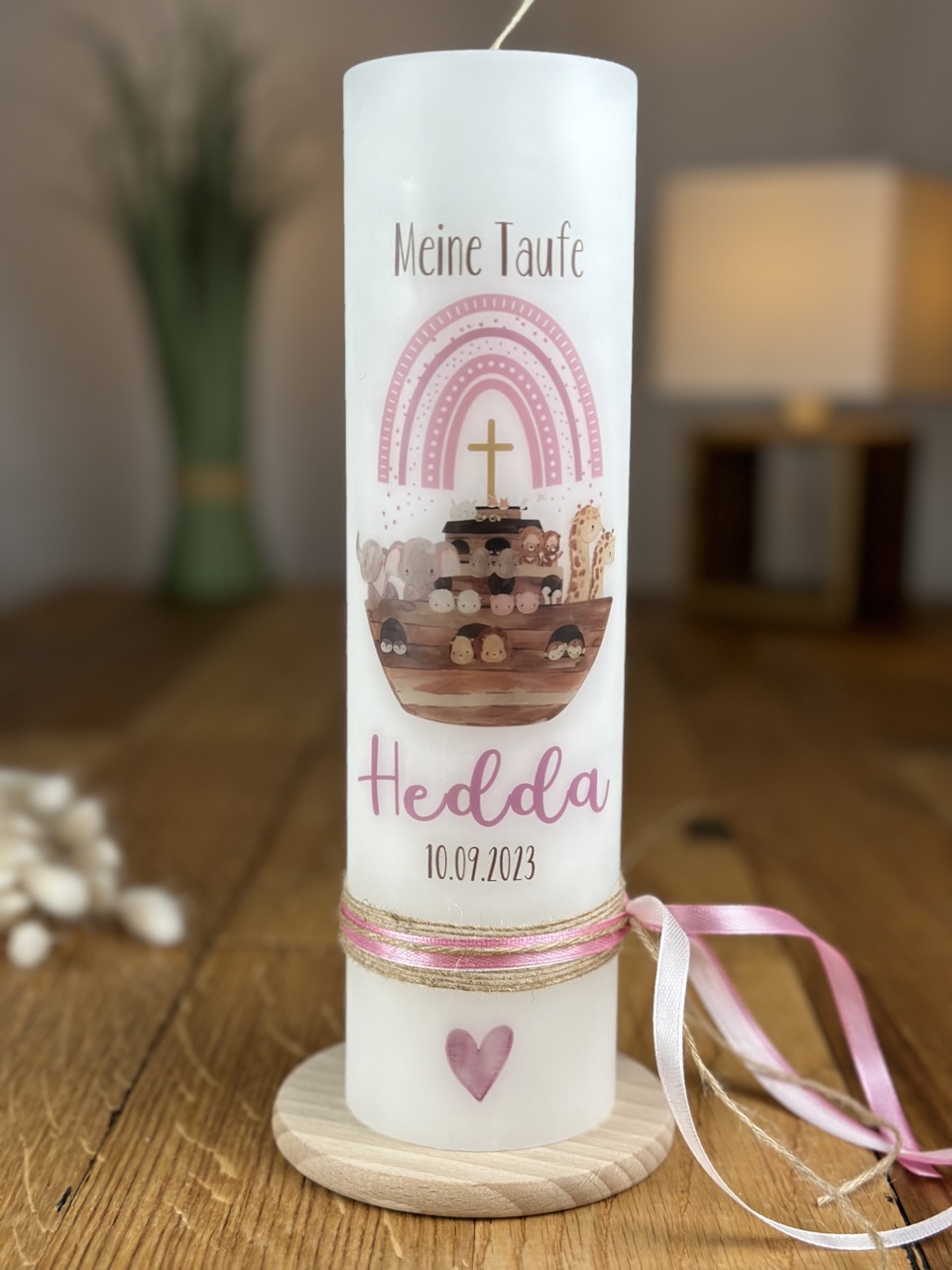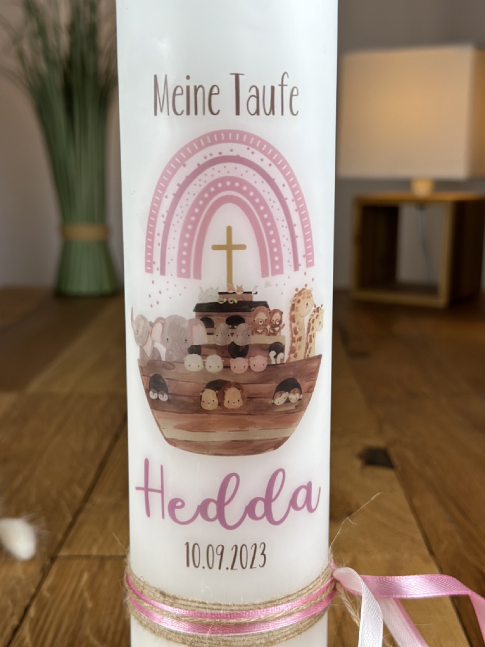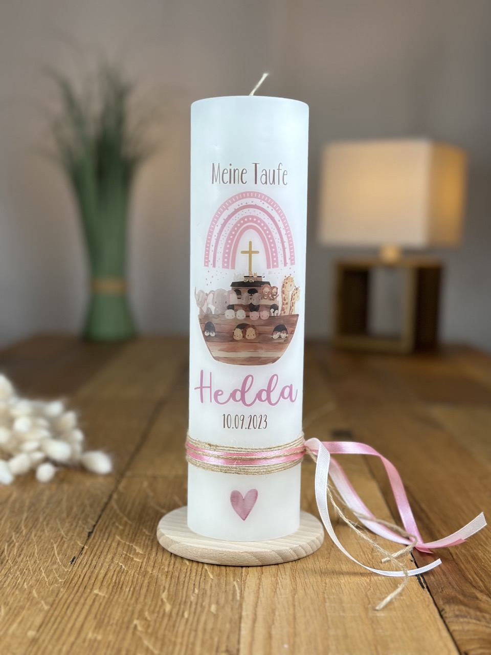 Diese bezaubernde Taufkerze mit dem Motiv der Arche Noah in zarten Rosatönen ist ein wundervolles Geschenk für den besonderen Anlass der Taufe. Die Arche Noah symbolisiert Hoffnung, Schutz und den Neuanfang im Glauben. Die sanften Rosatöne verleihen der Kerze eine frische und beruhigende Atmosphäre, die perfekt zu diesem feierlichen Ereignis passt. Handgefertigt und mit Liebe zum Detail gestaltet, ist diese Kerze nicht nur ein religiöses Symbol, sondern auch ein wertvolles Erinnerungsstück, das den Glauben und die Verbundenheit mit Gott für viele Jahre widerspiegelt.