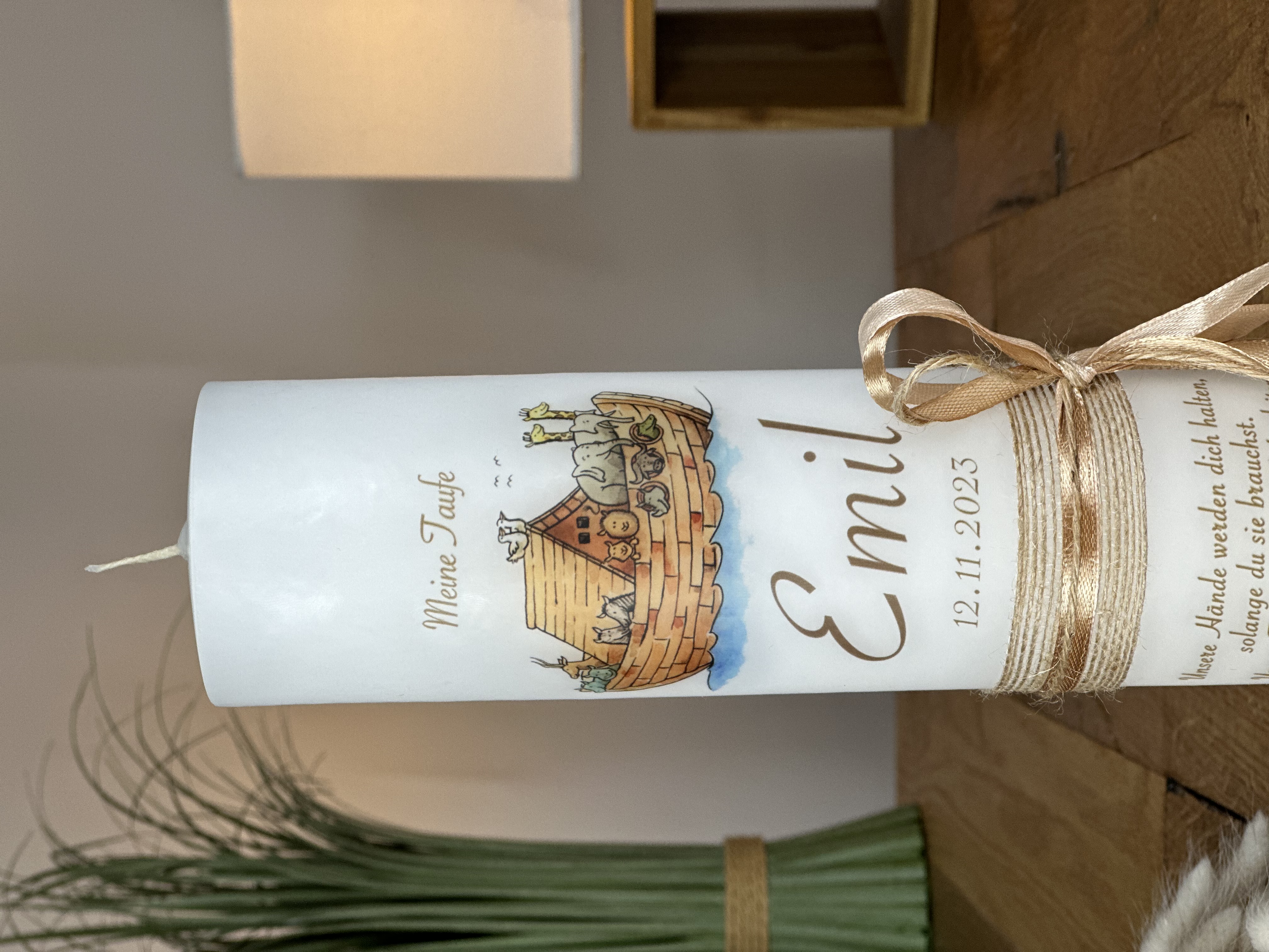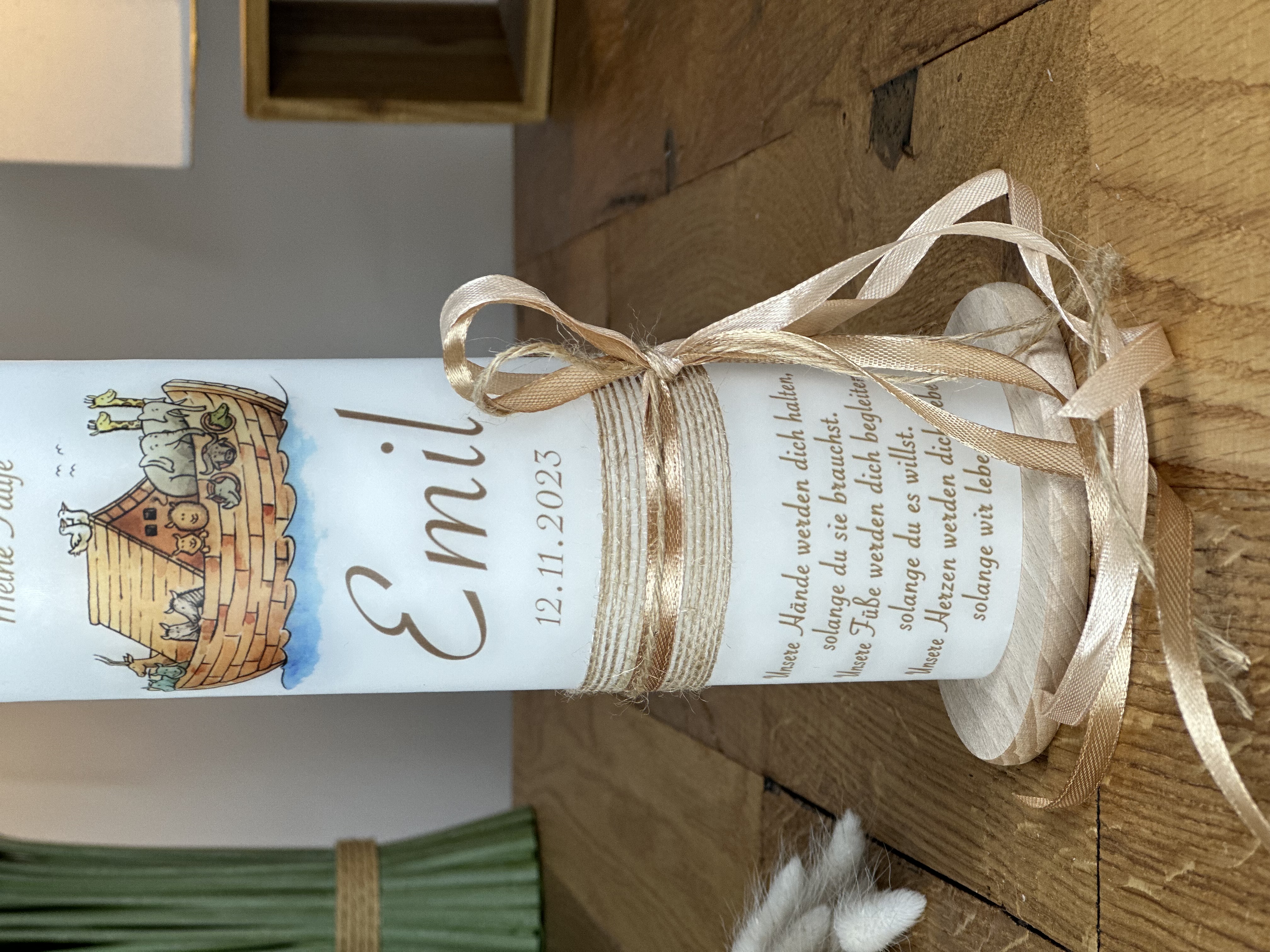 Kerze Arche Noah mit Juteband und Schlaufe seitlich in beige