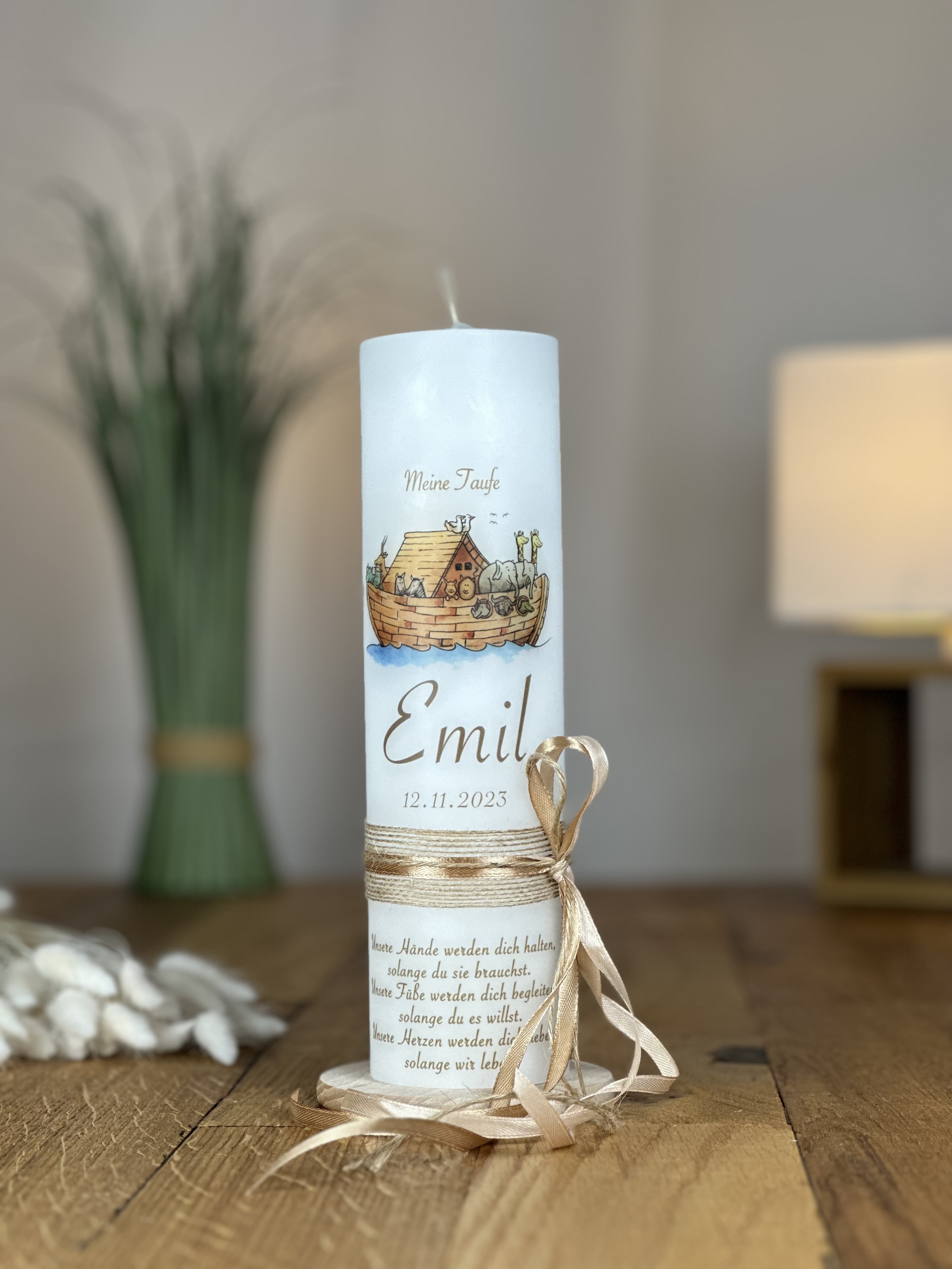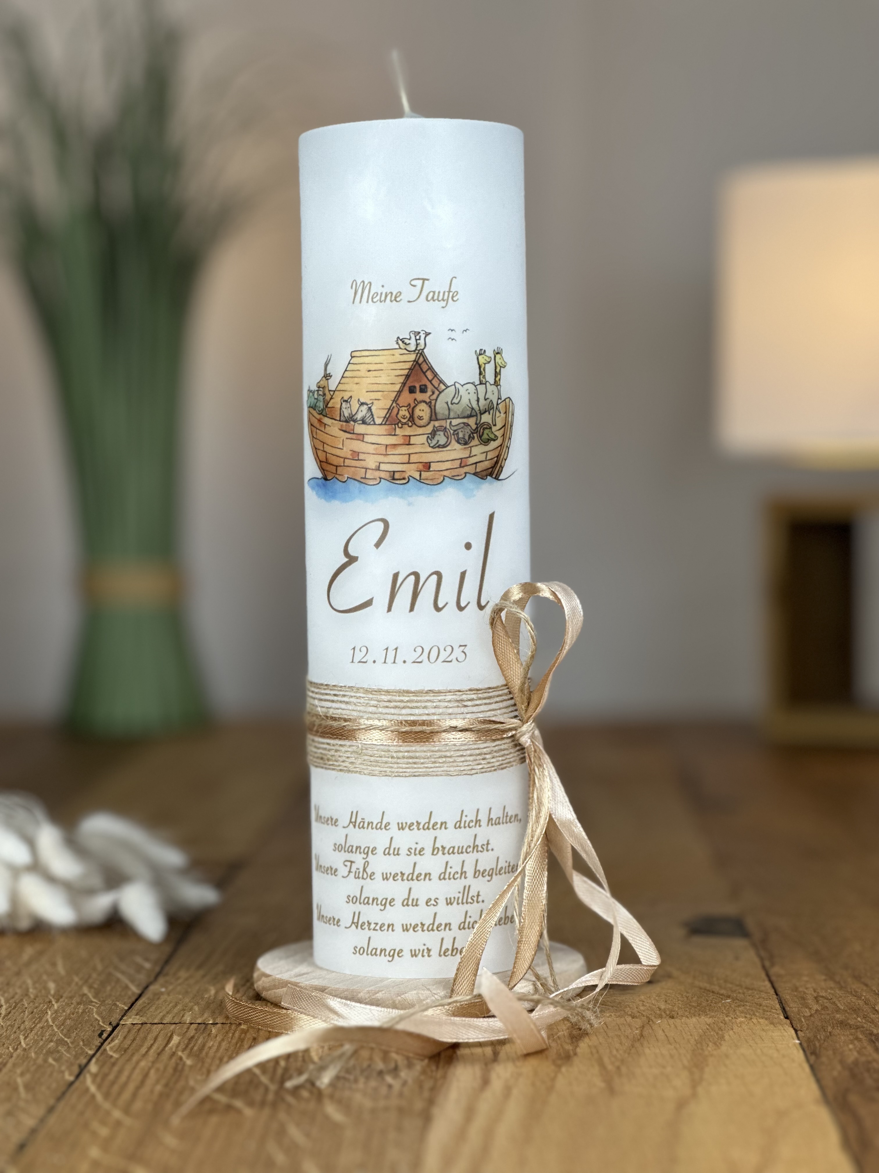Diese bezaubernde Taufkerze mit dem Motiv der Arche Noah ist ein wundervolles Geschenk für den besonderen Anlass der Taufe. Die Arche Noah symbolisiert Hoffnung, Schutz und den Neuanfang im Glauben. Die sanften verleihen der Kerze eine frische und beruhigende Atmosphäre, die perfekt zu diesem feierlichen Ereignis passt. Handgefertigt und mit Liebe zum Detail gestaltet, ist diese Kerze nicht nur ein religiöses Symbol, sondern auch ein wertvolles Erinnerungsstück, das den Glauben und die Verbundenheit mit Gott für viele Jahre widerspiegelt.