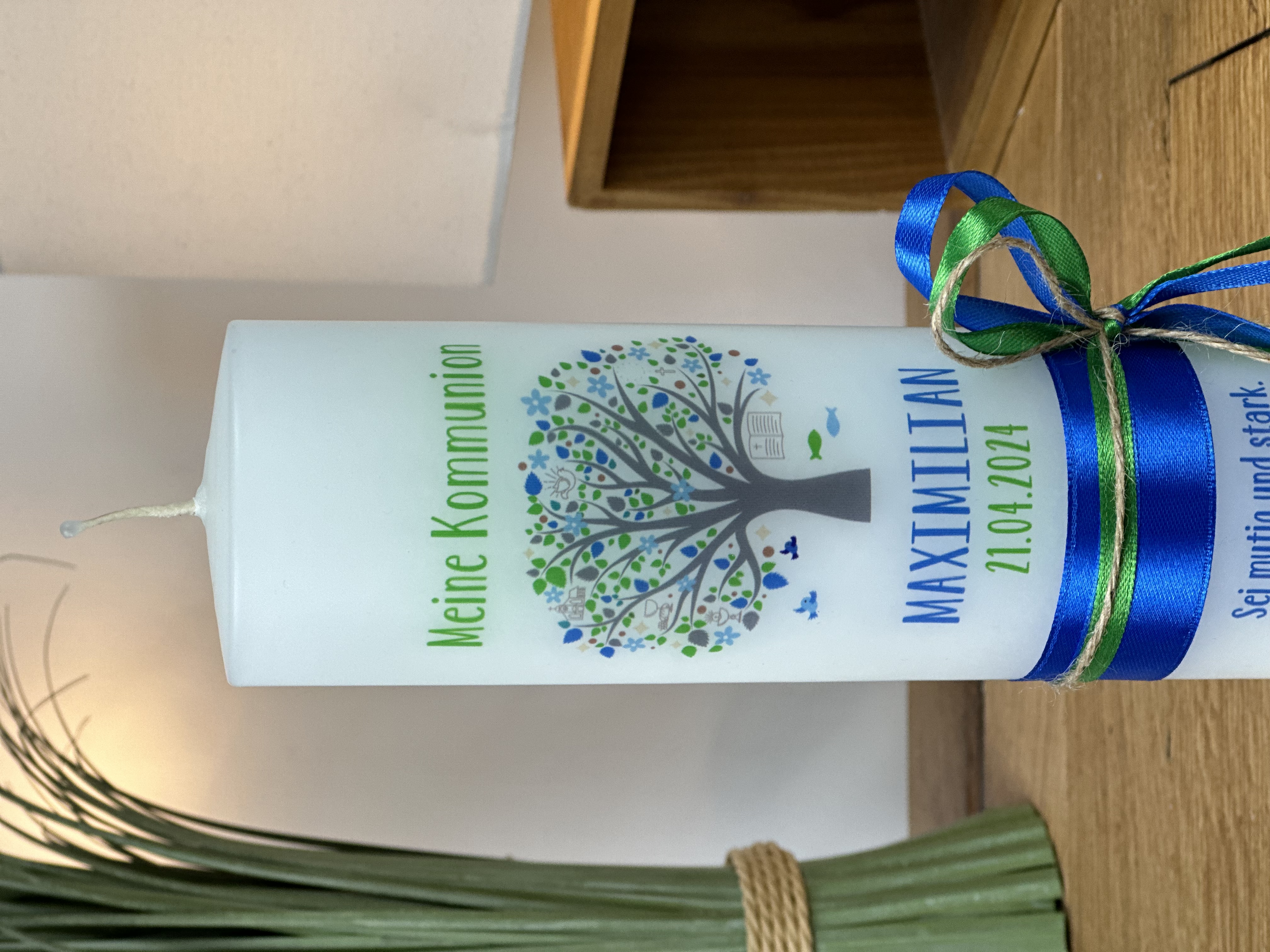 Diese Taufkerze ist nicht nur ein wunderschönes Dekorationsstück, sondern auch ein symbolisches Geschenk. Sie kann während der Tauffeier angezündet werden und symbolisiert den Weg des Kindes in ein neues Leben. Die Taufkerze "Baum der Kommuniona" in blau-grün ist somit ein einzigartiges Geschenk, das die Bedeutung der Taufe auf besondere Weise widerspiegelt.
