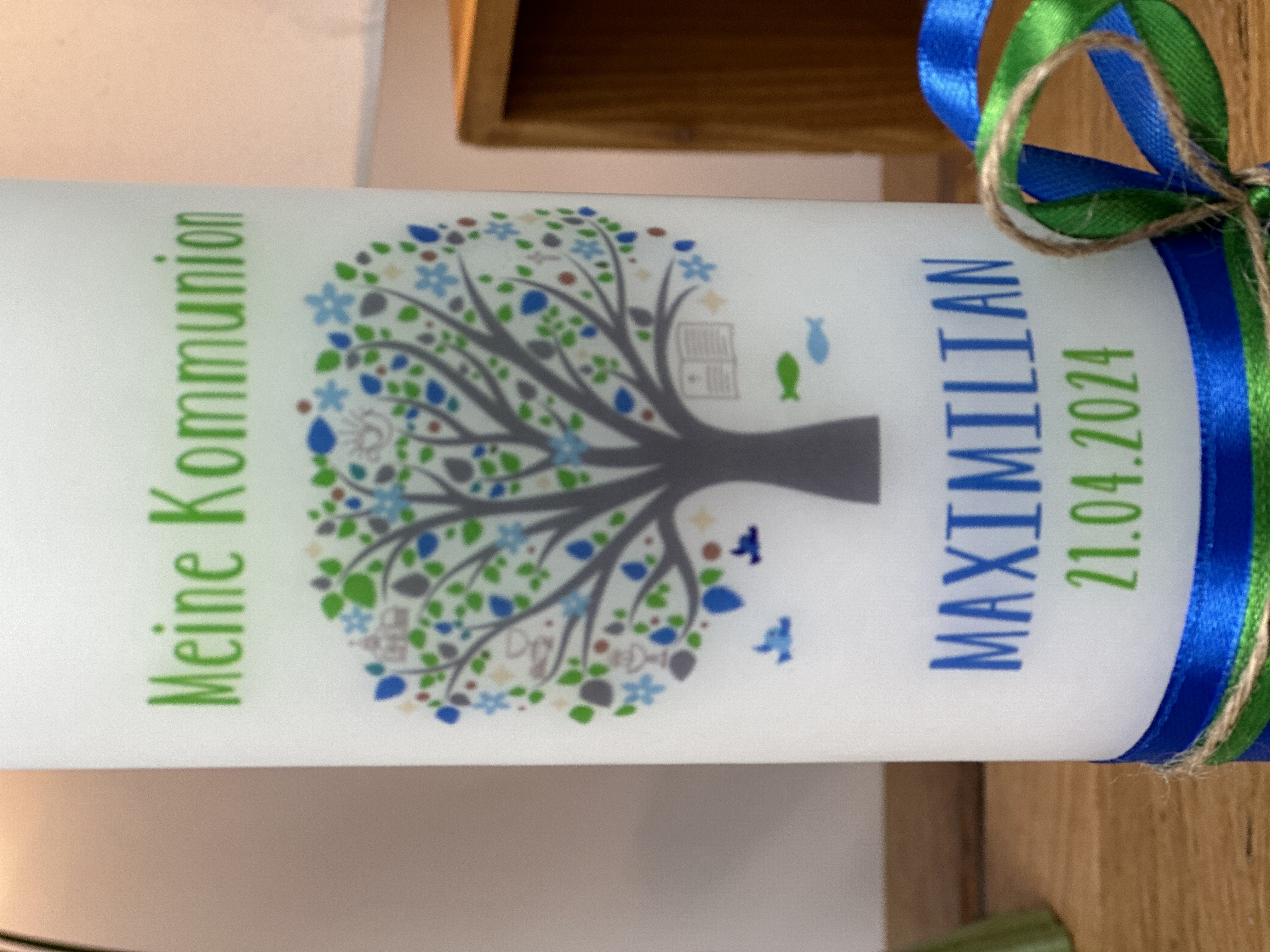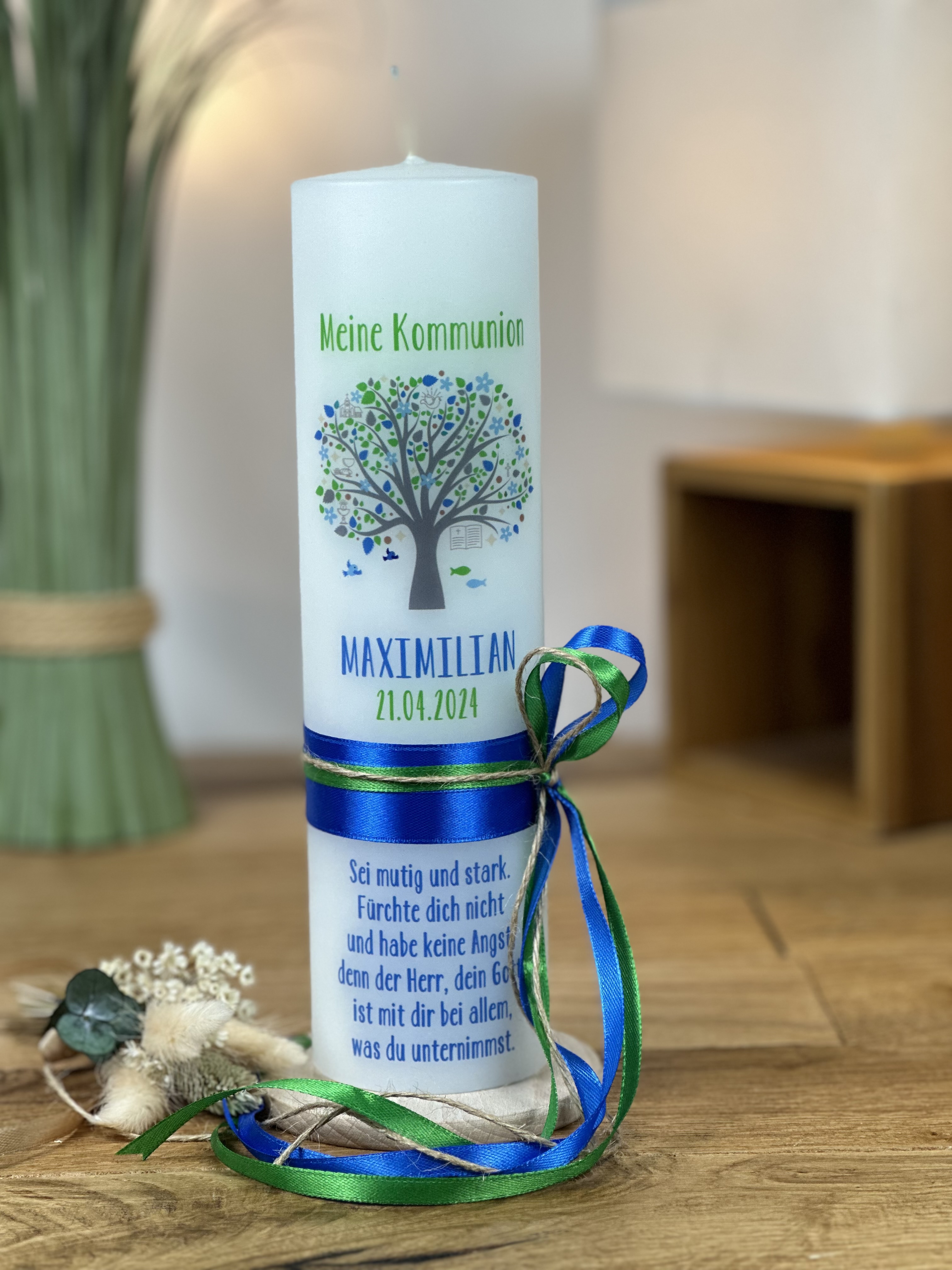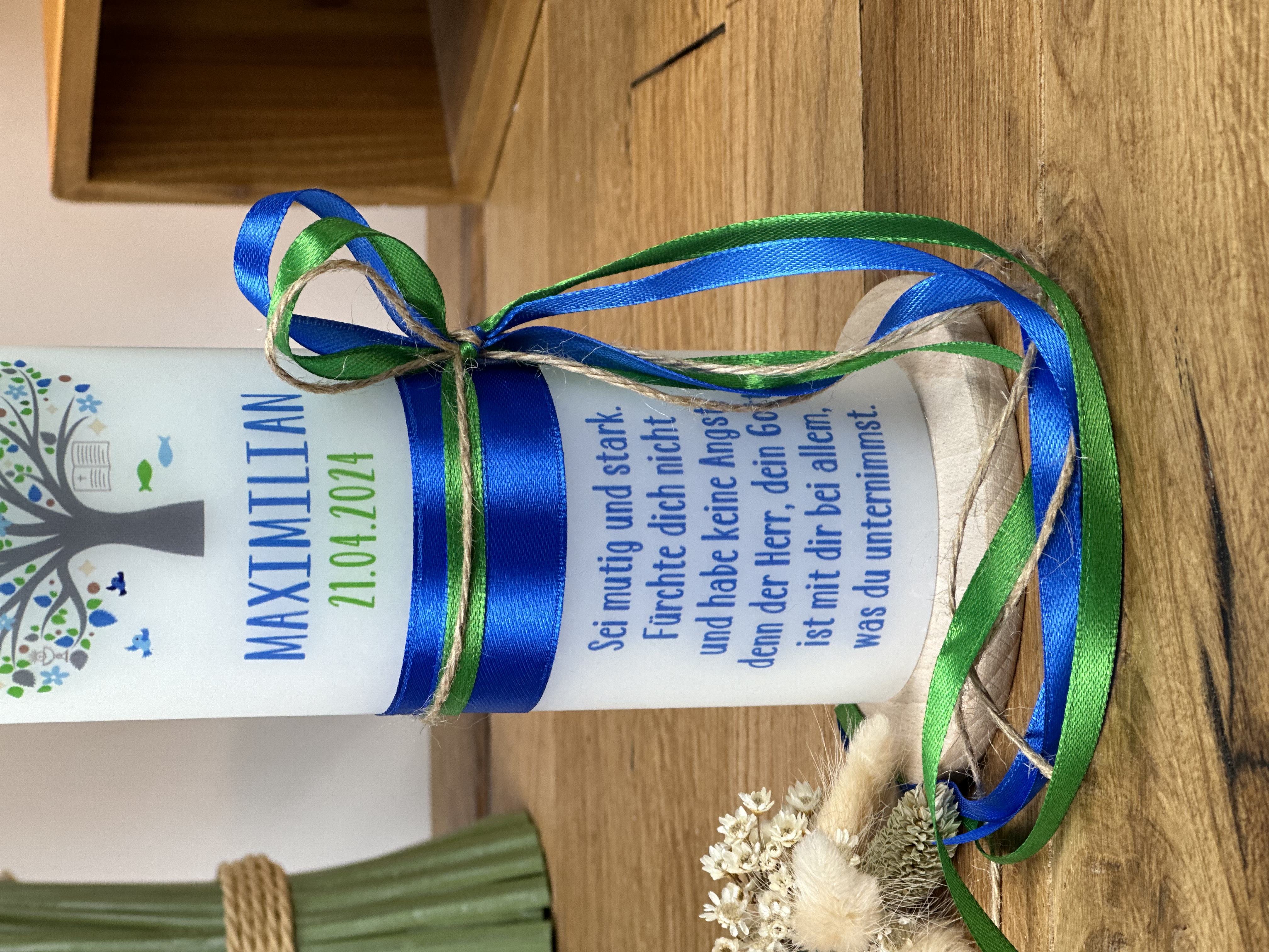 ist eine wunderschöne und einzigartige Kerze, die perfekt für die Taufe für Jungs als auch Mädchen geeignet ist. Mit ihrem Blau und Grüntöne strahlt diese Kerze eine liebevolle und sanfte Atmosphäre aus.