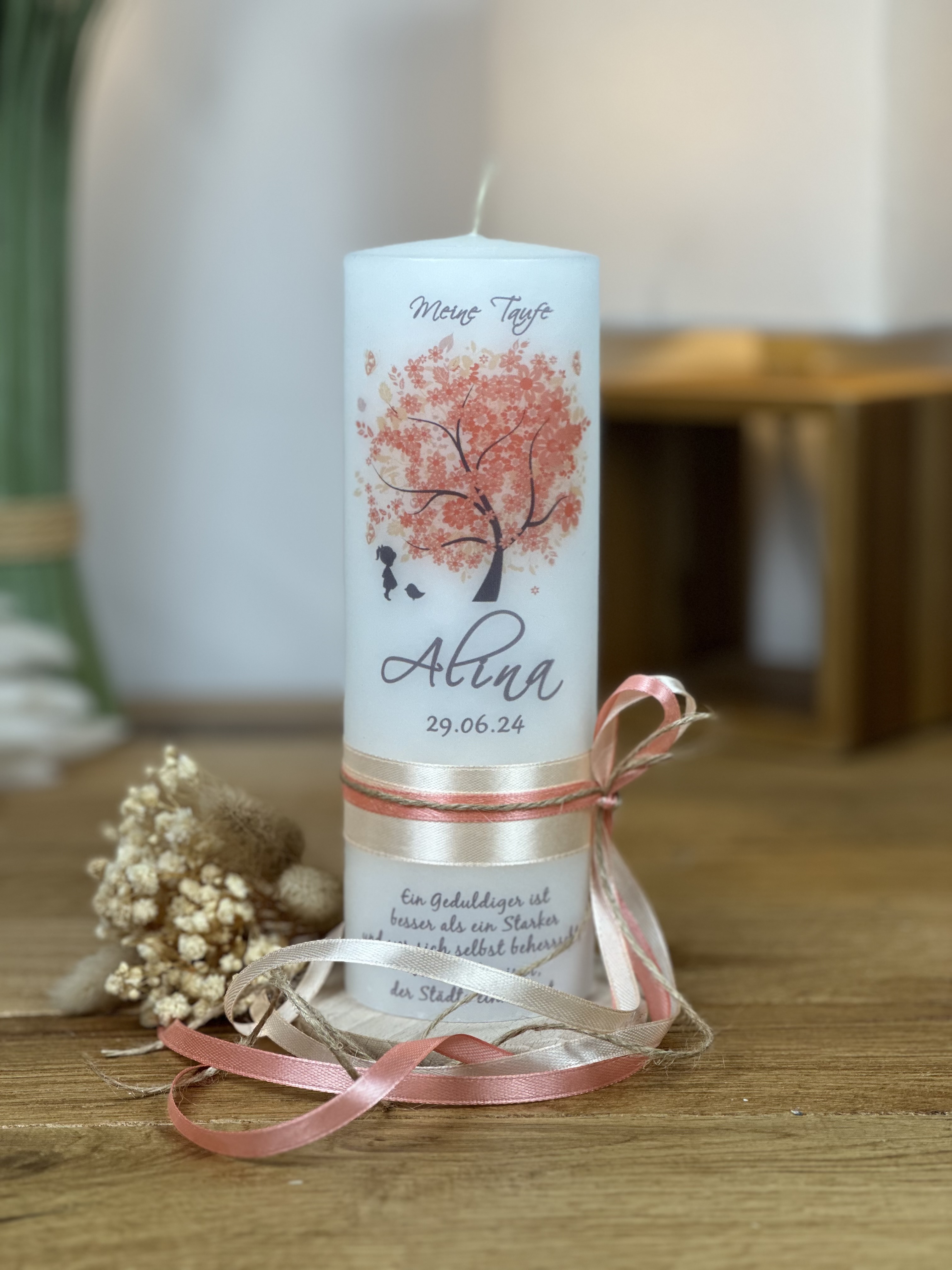 Die Taufkerze "Baum des Lebens mit schüchternem Mädchen"