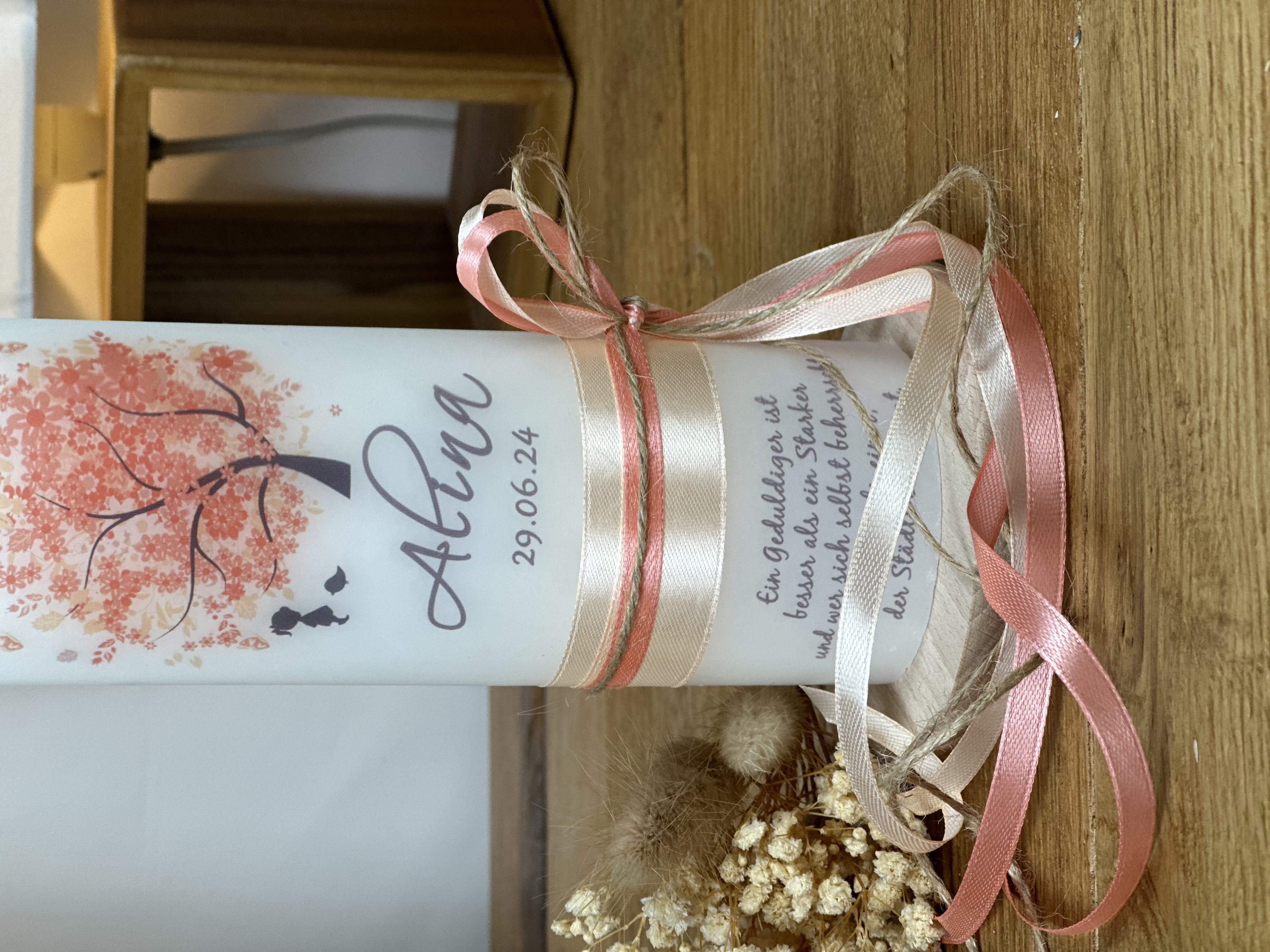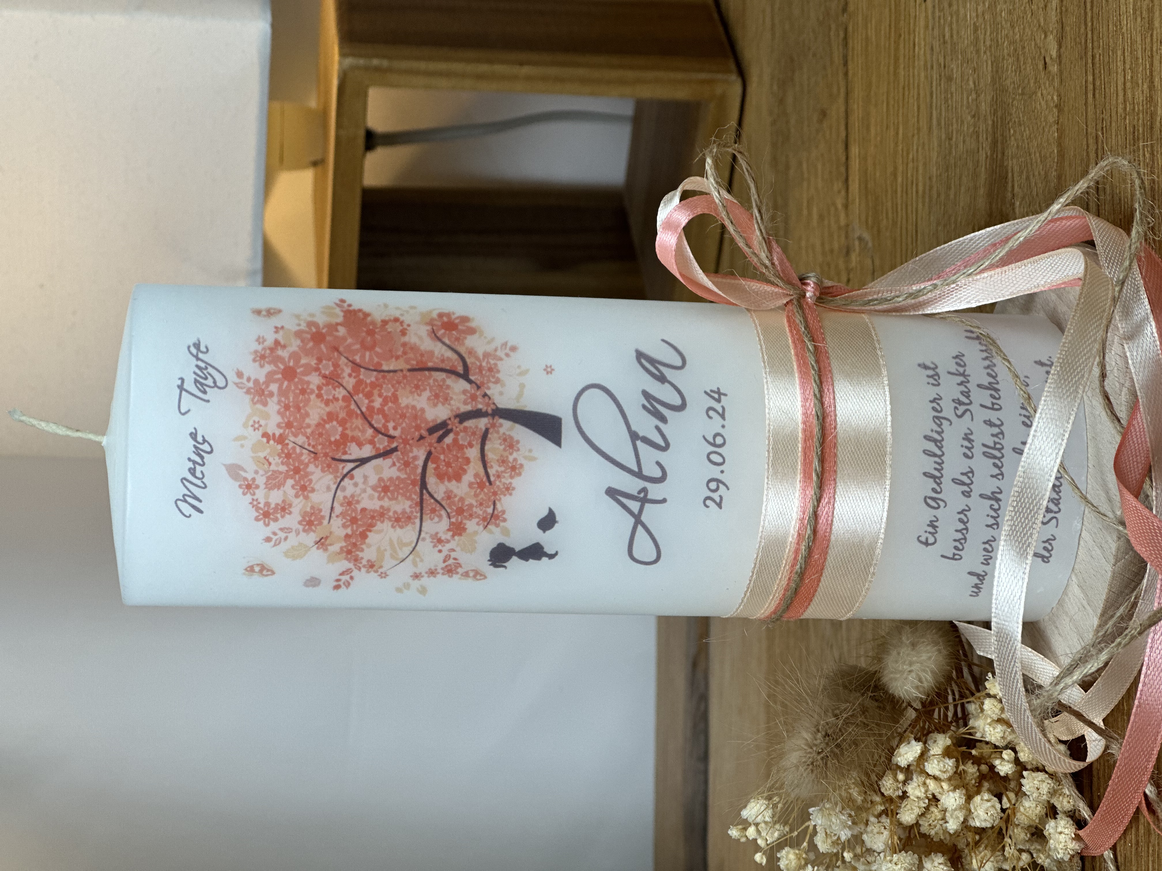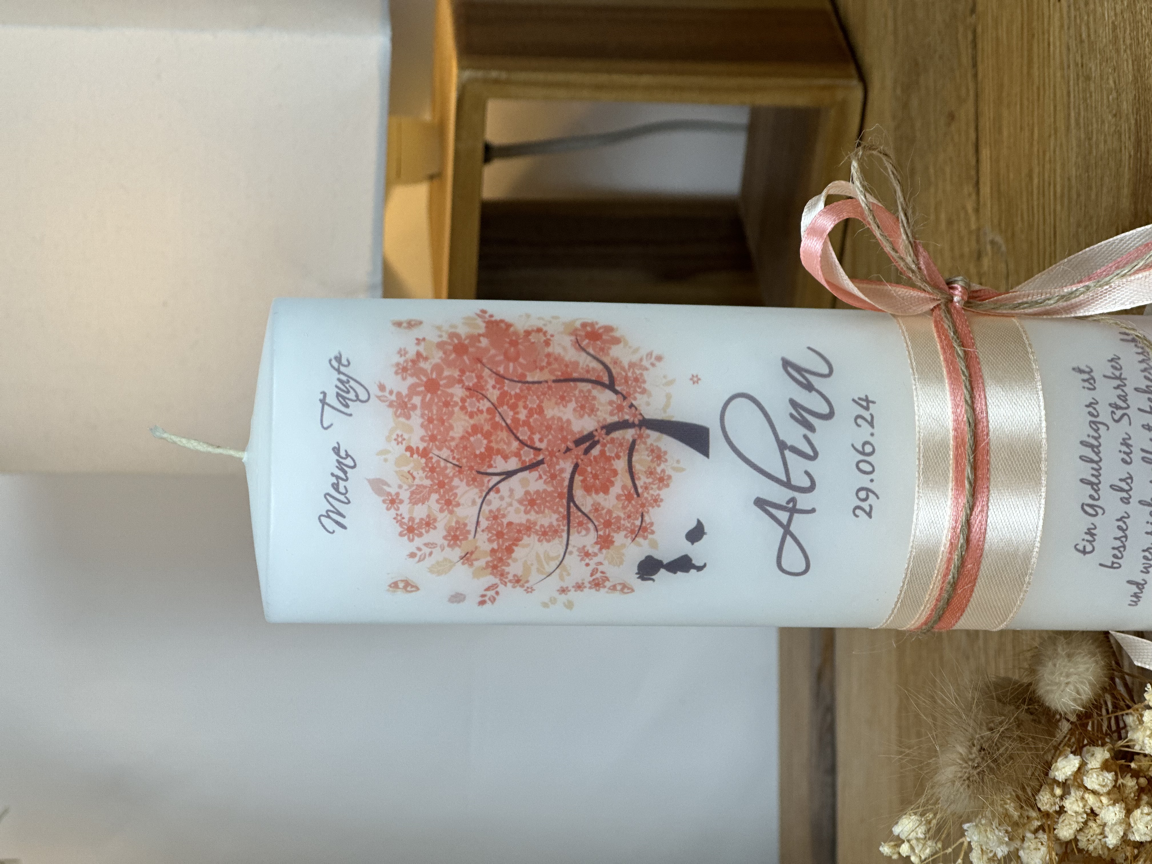 Die Taufkerze "Baum des Lebens" ist eine wunderschöne und einzigartige Kerze, die perfekt für die Taufe eines kleinen Mädchens geeignet ist. Mit ihrem zarten Aprikot und dem Motiv eines schüchternem Mädchens strahlt diese Kerze eine liebevolle und sanfte Atmosphäre aus.