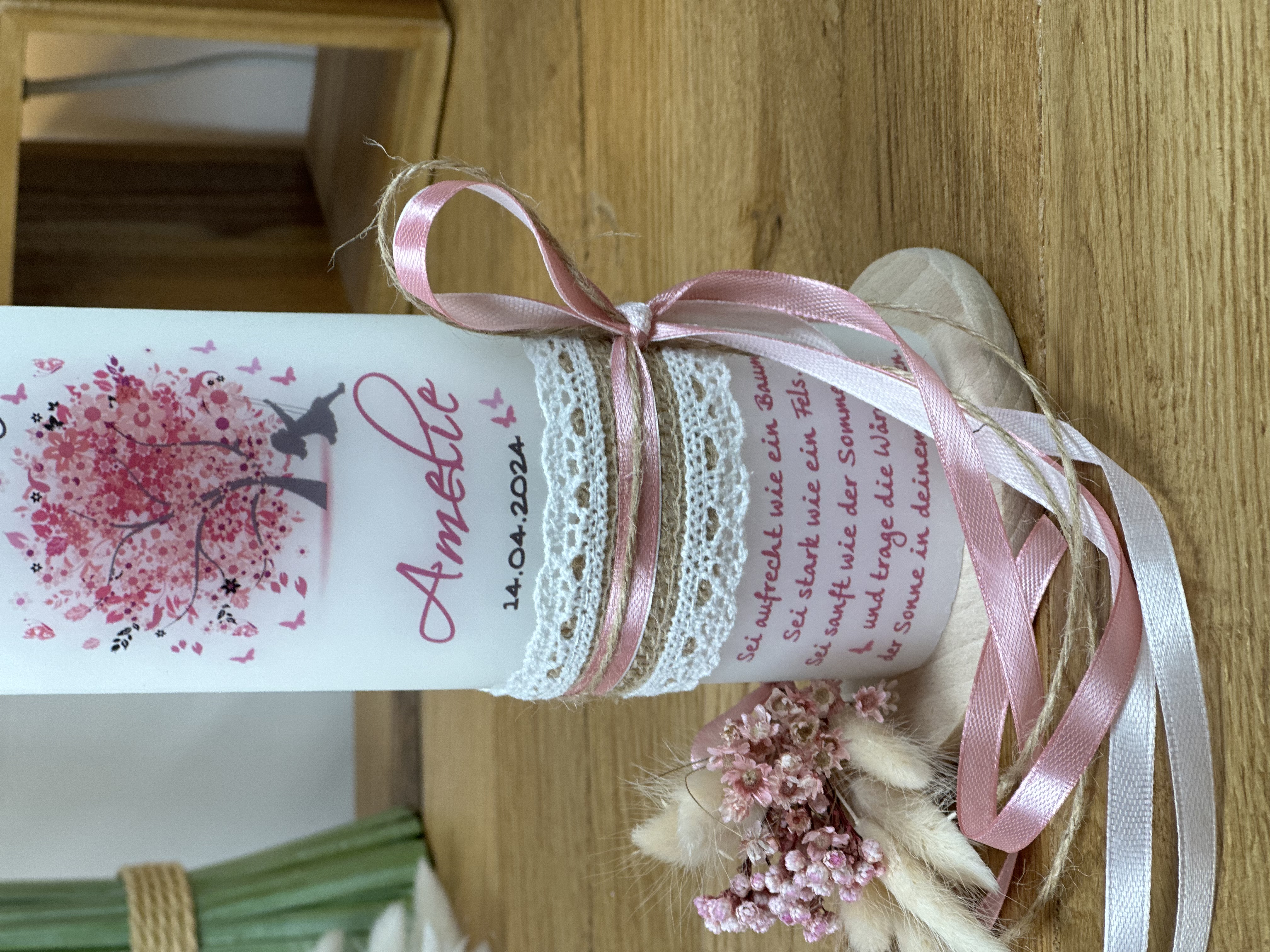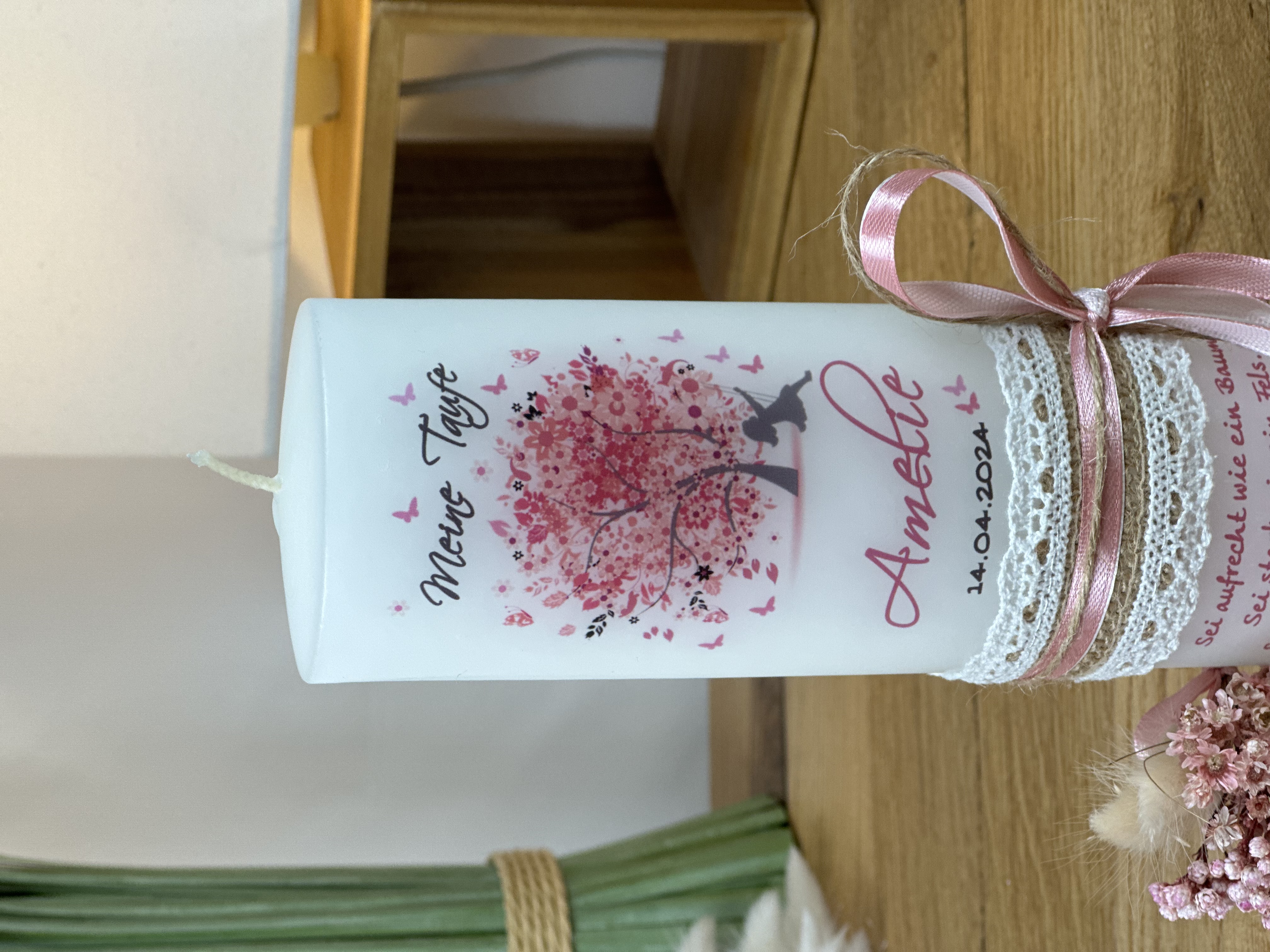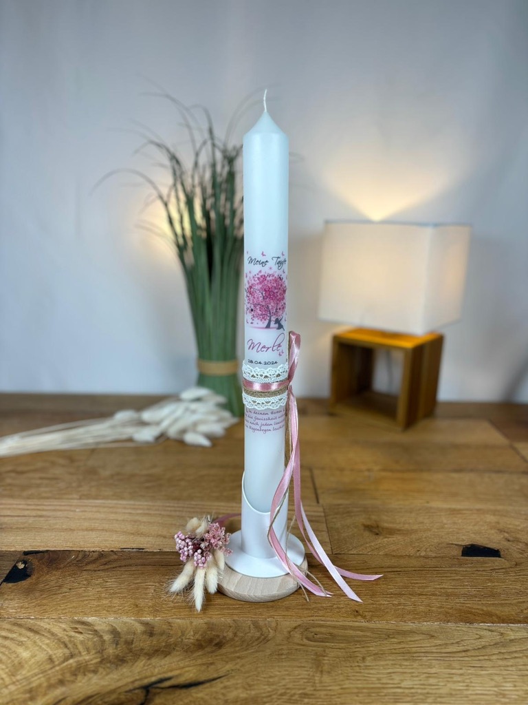 Die Taufkerze ist in Rosatönen gehalten, die perfekt zu einem Mädchen passen. Die Farbe Rosa steht für Liebe, Zärtlichkeit und Geborgenheit und verleiht der Kerze eine besonders feminine Ausstrahlung.
