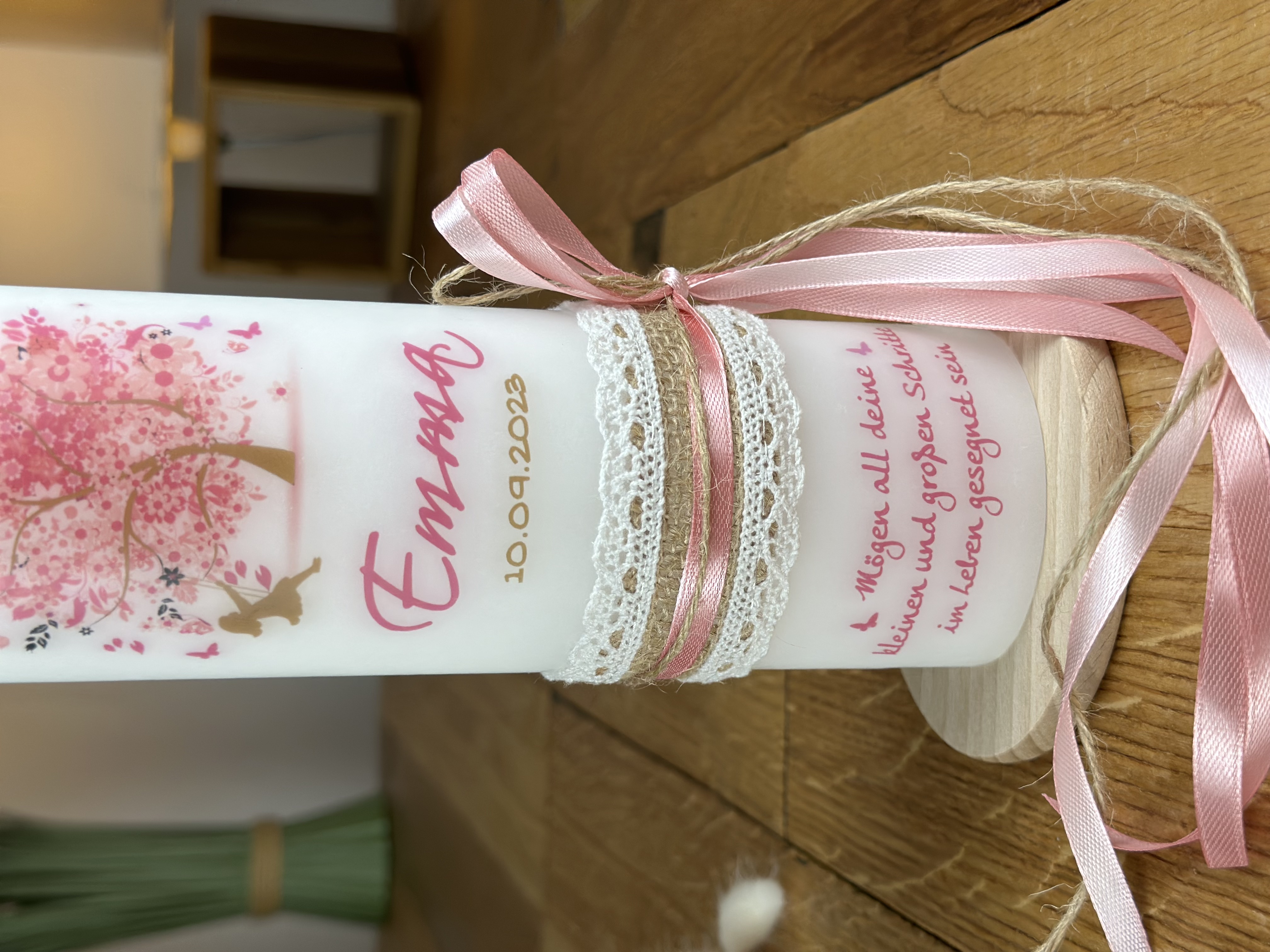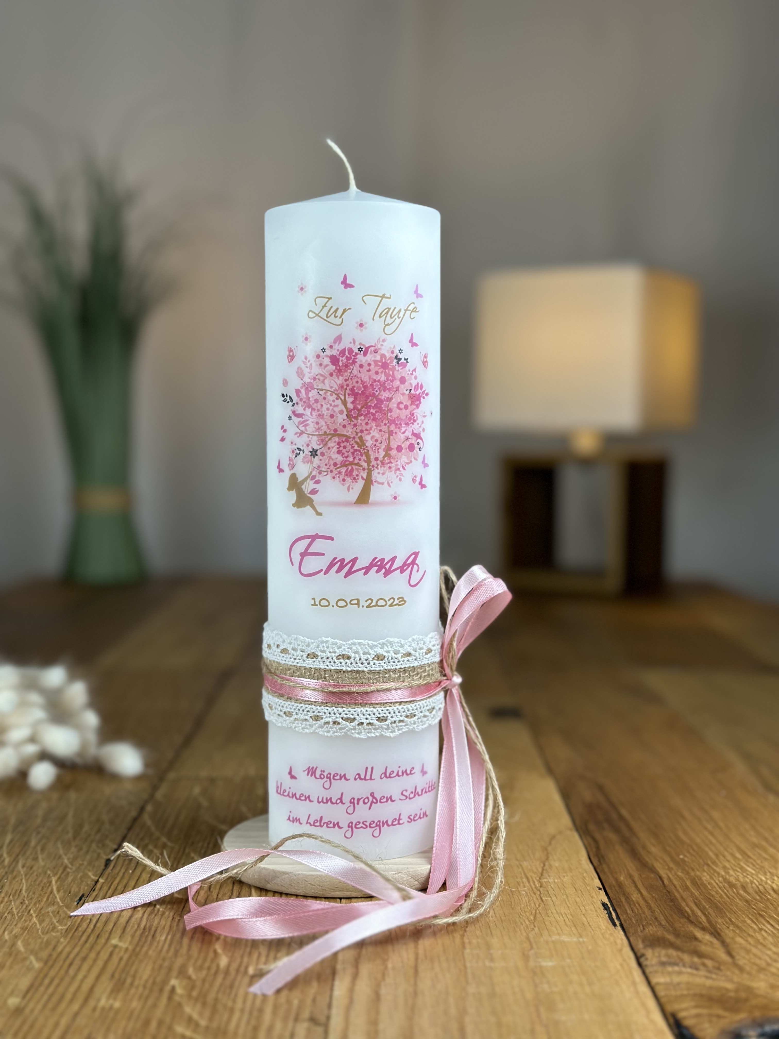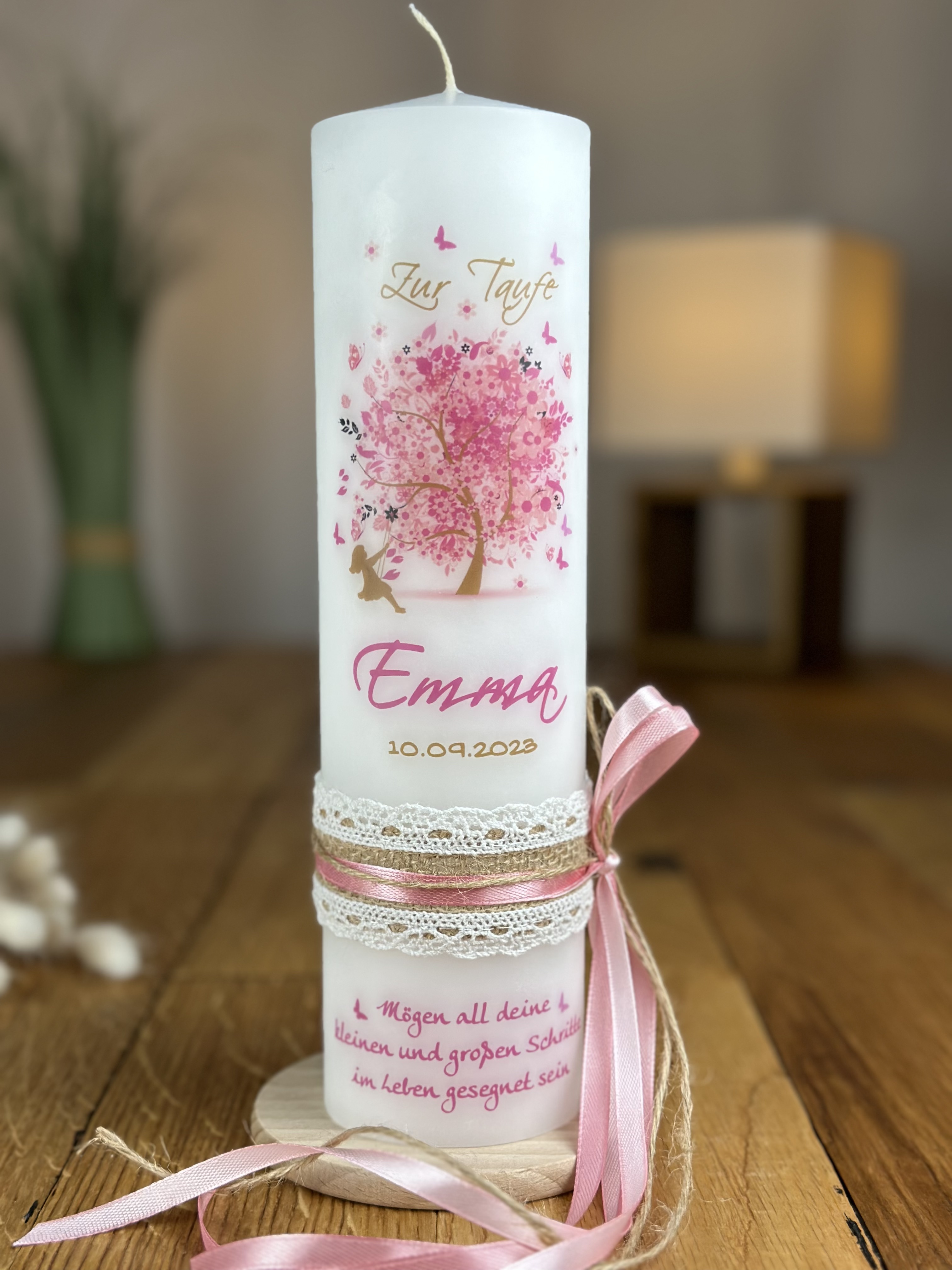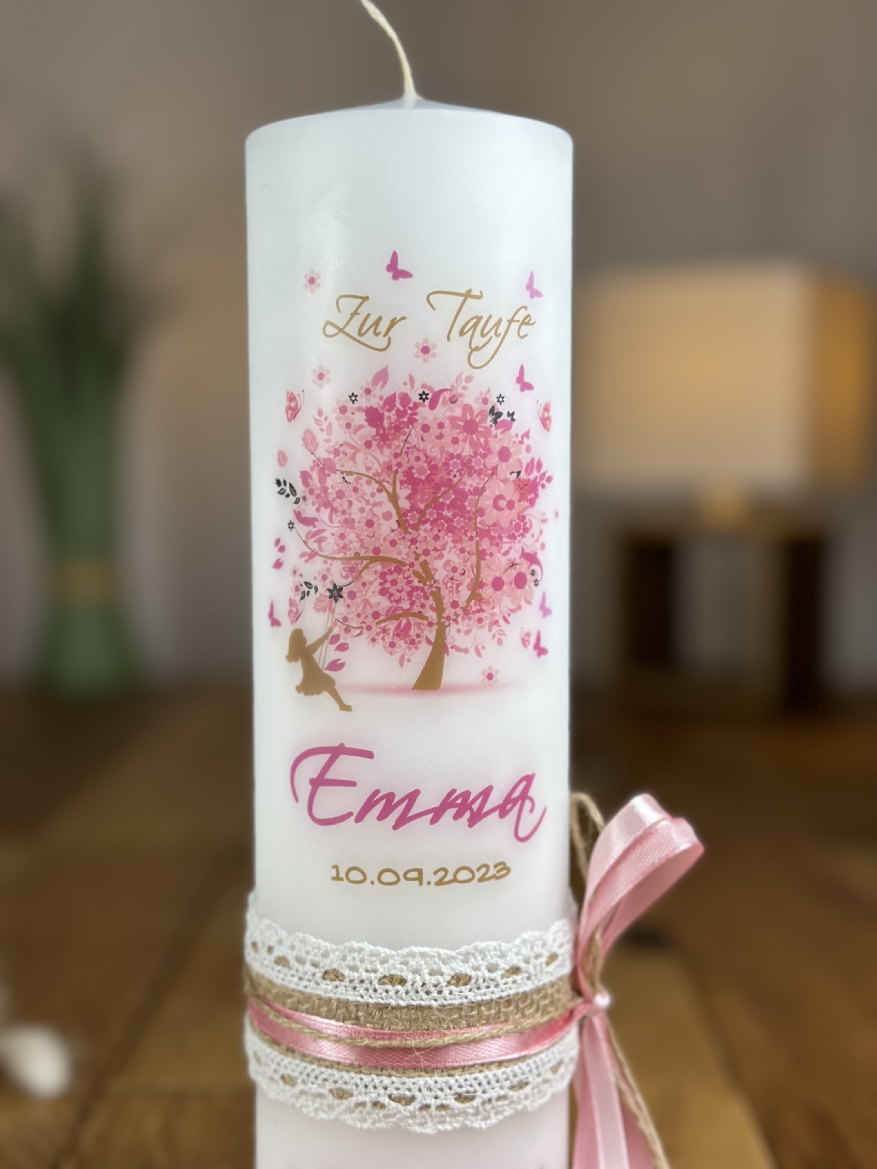 Die Taufkerze "Baum des Lebens" ist eine wunderschöne und einzigartige Kerze, die perfekt für die Taufe eines kleinen Mädchens geeignet ist. Mit ihrem zarten Rosa und dem Motiv eines schaukelnden Mädchens strahlt diese Kerze eine liebevolle und sanfte Atmosphäre aus.