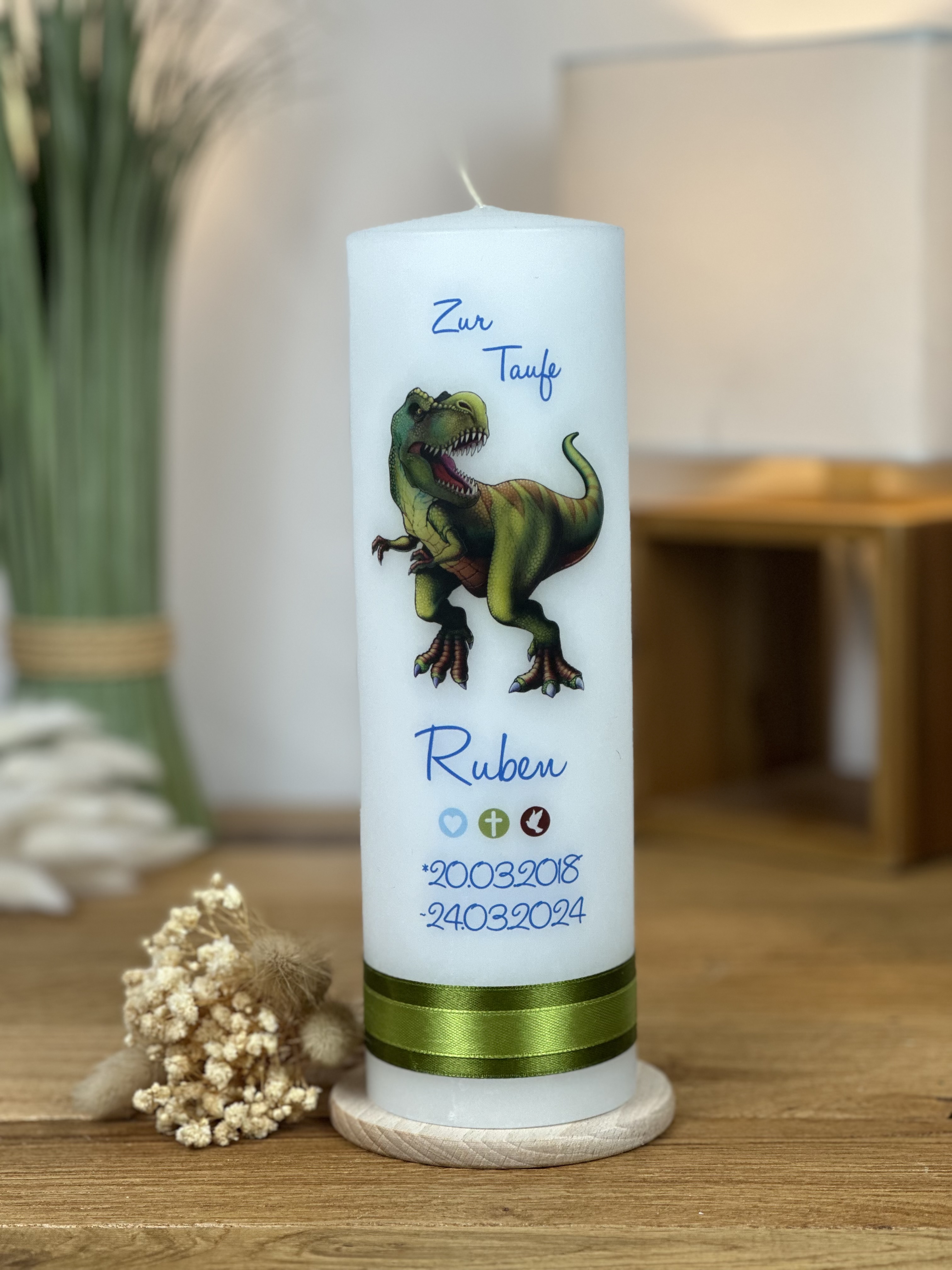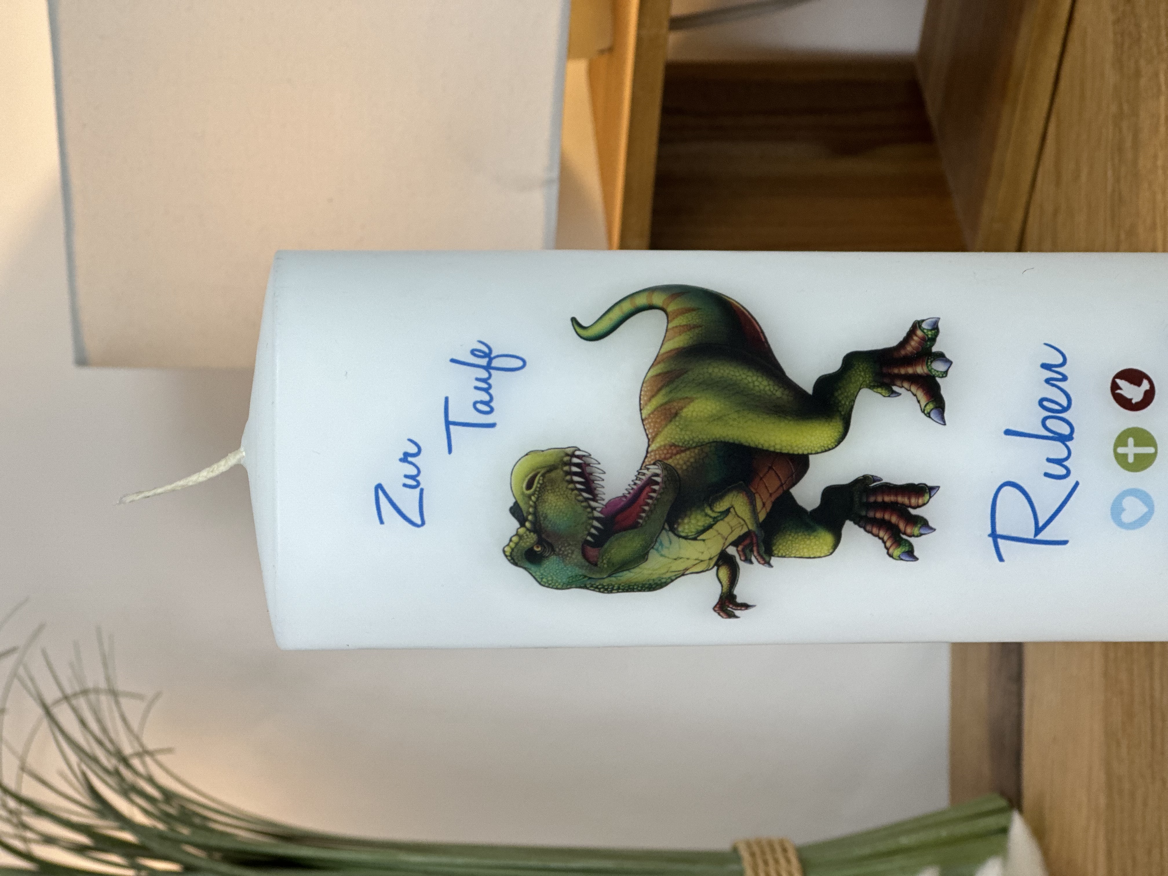 Der T-Rex auf der Kerze symbolisiert Stärke, Schutz und Mut, Eigenschaften, die oft mit der Taufe in Verbindung gebracht werden. Die Kerze ist in einem zarten Weiß gehalten, was sie zu einem zeitlosen und eleganten Accessoire für die Taufe macht.