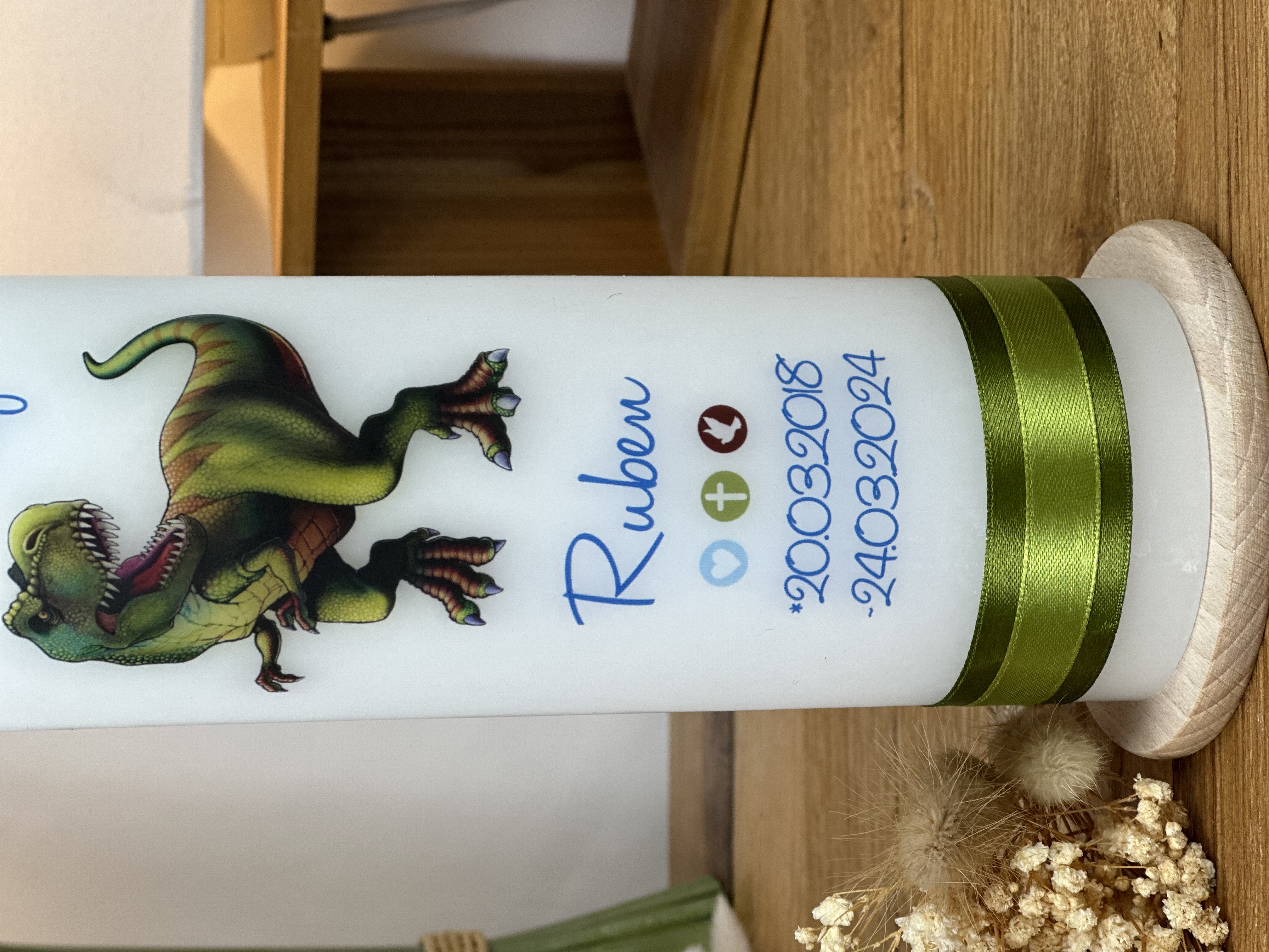 Die Taufkerze mit einem Dinosaurier T-Rex ist eine einzigartige und verspielte Möglichkeit, den besonderen Anlass der Taufe zu feiern. Der T-Rex, als einer der bekanntesten Dinosaurier, verleiht der Kerze eine interessante und kinderfreundliche Note. Die Kerze ist handgefertigt und mit viel Liebe zum Detail gestaltet, was sie zu einem besonderen Erinnerungsstück macht.