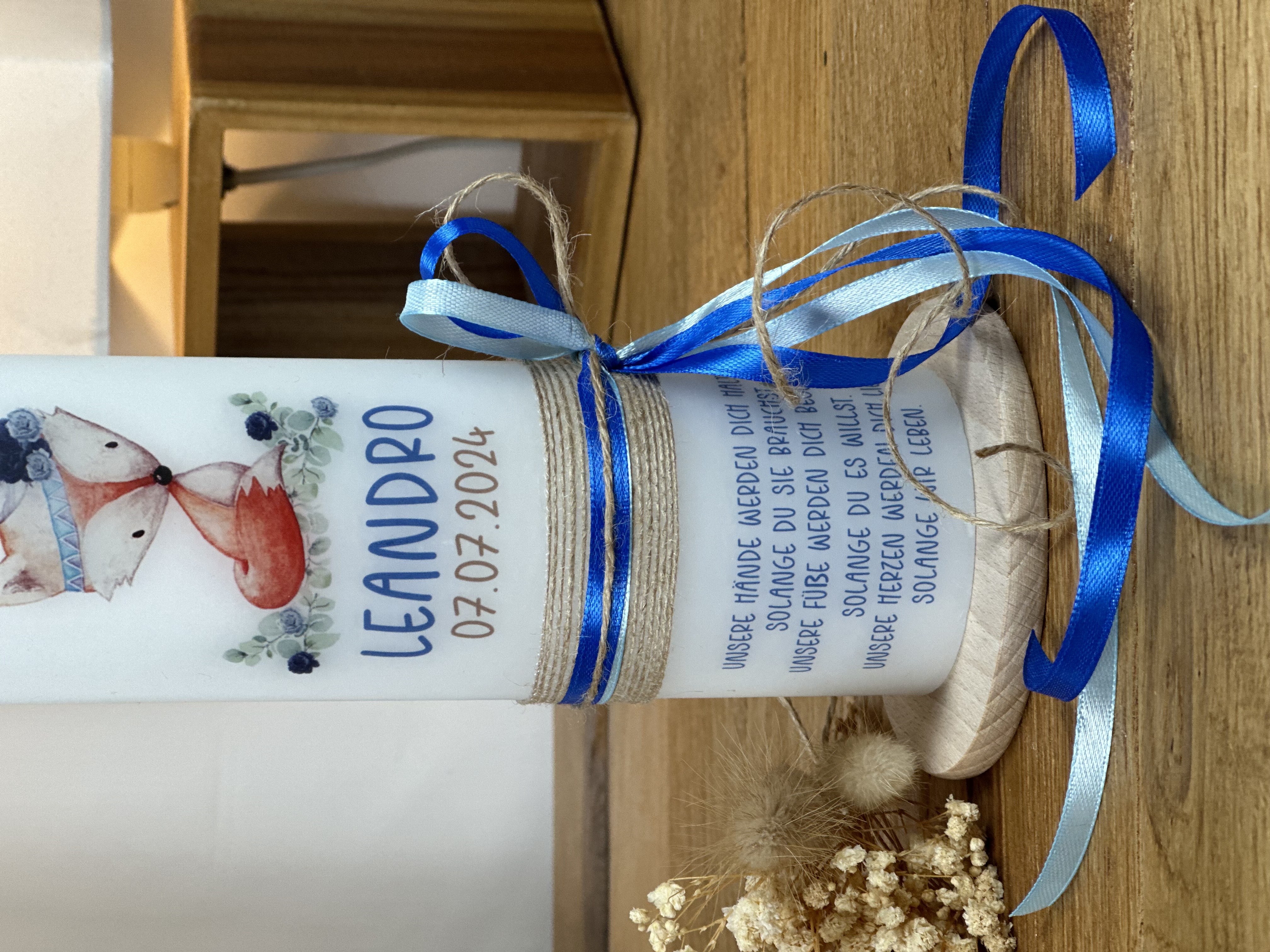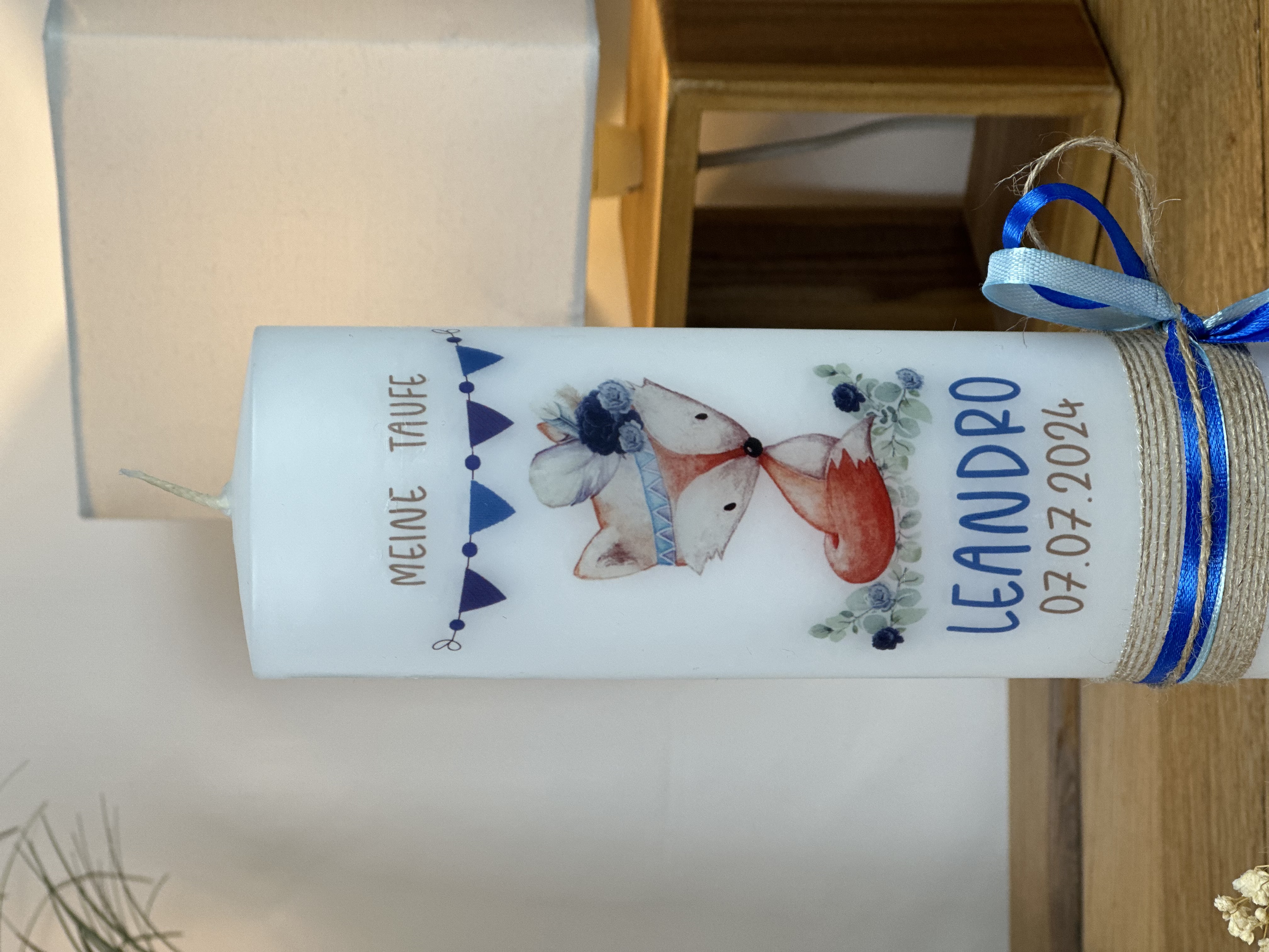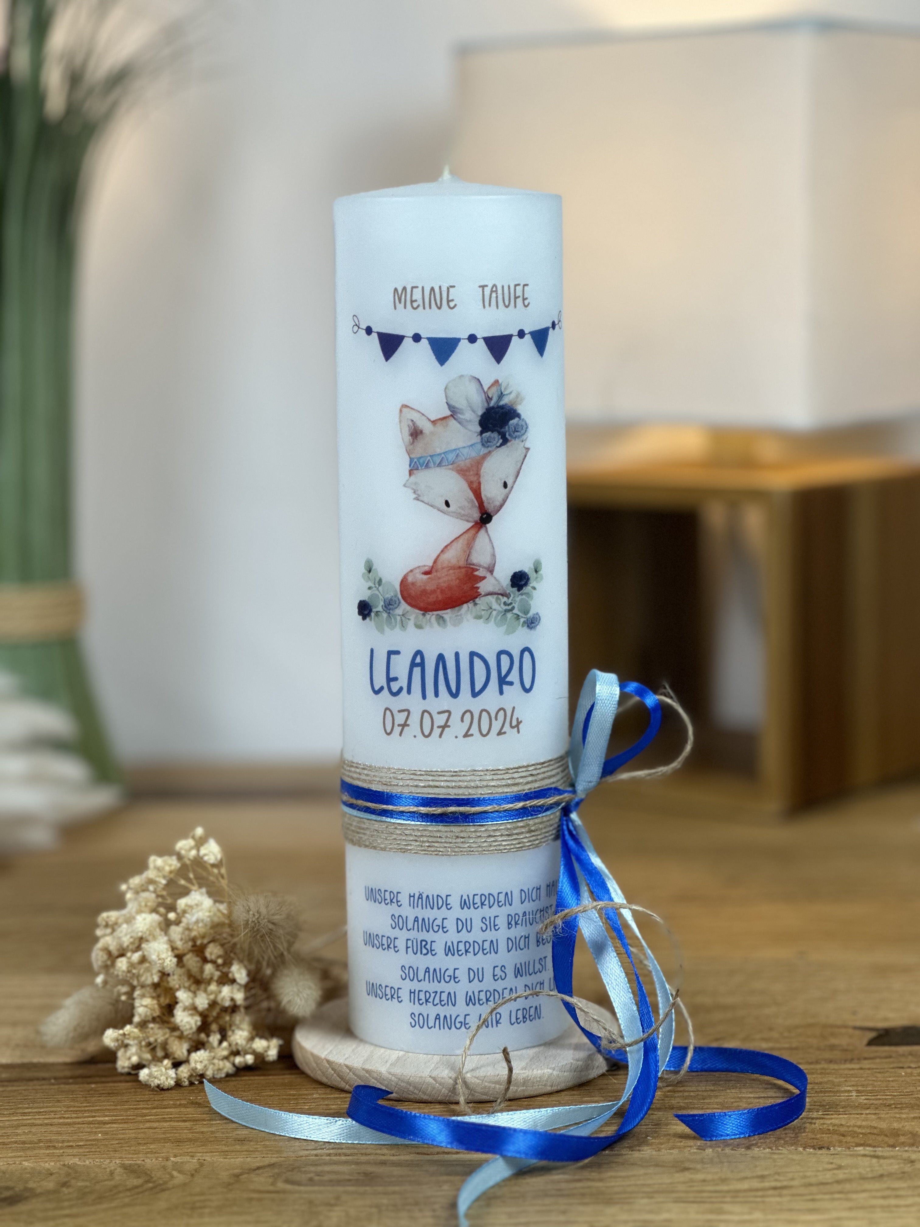Die zarten Farben und das verspielte Design im Boho Stil machen diese Taufkerze zu einem echten Blickfang und einem ganz besonderen Erinnerungsstück an den Tauftag. Die Wimpelkette, die um den Fuchs herum verläuft, verleiht der Kerze einen verspielten und festlichen Touch und macht sie zu einem echten Hingucker.