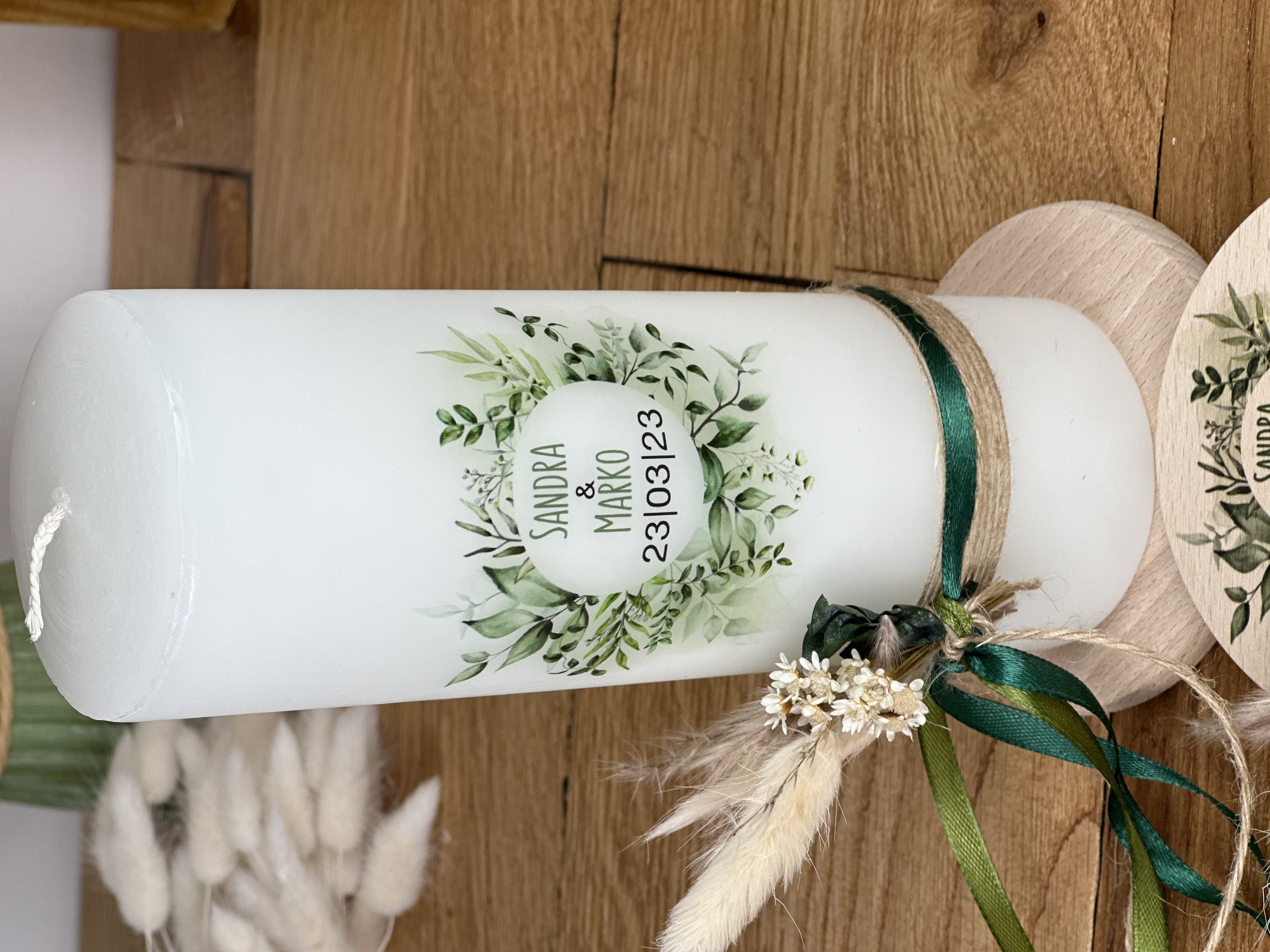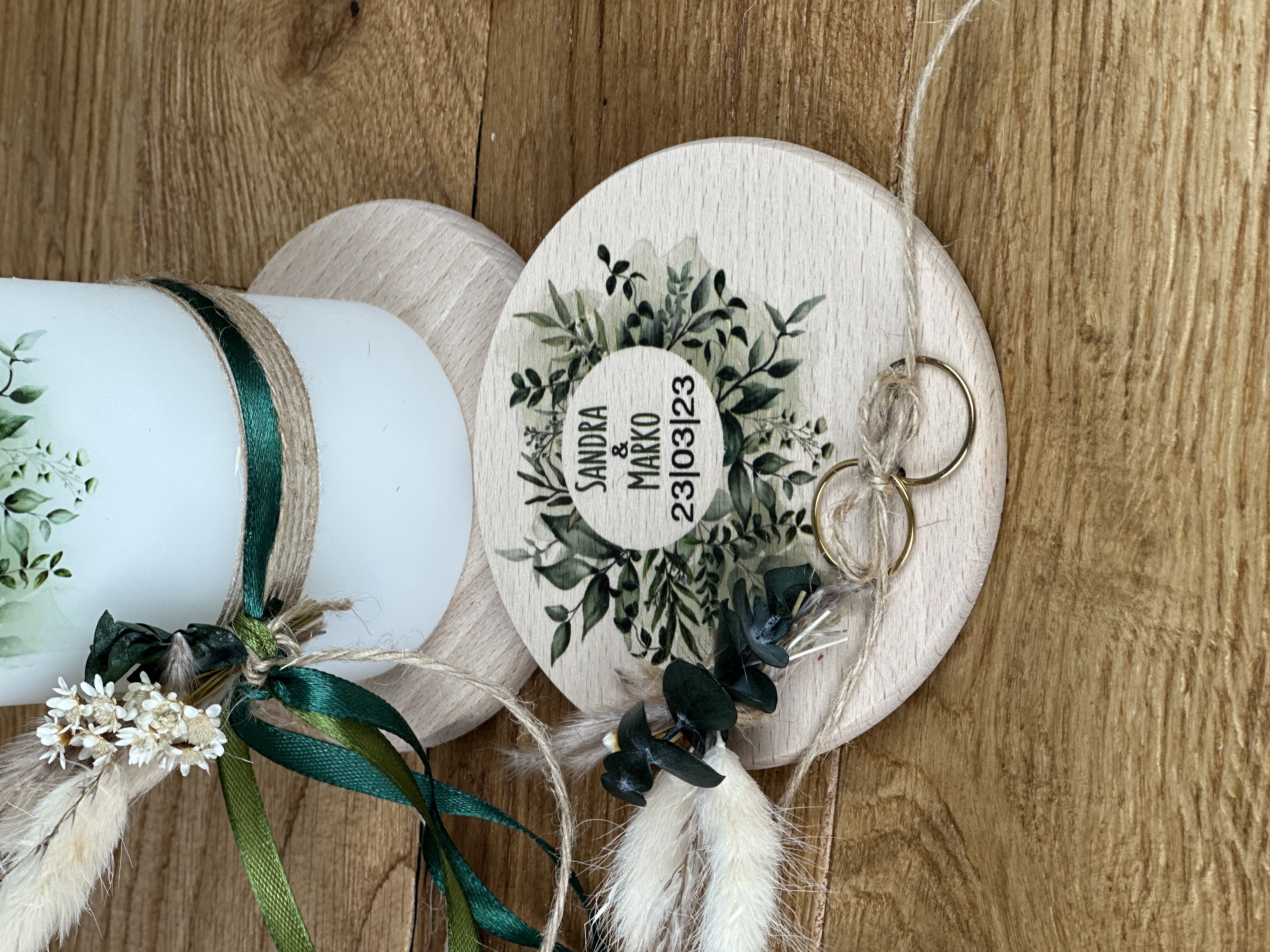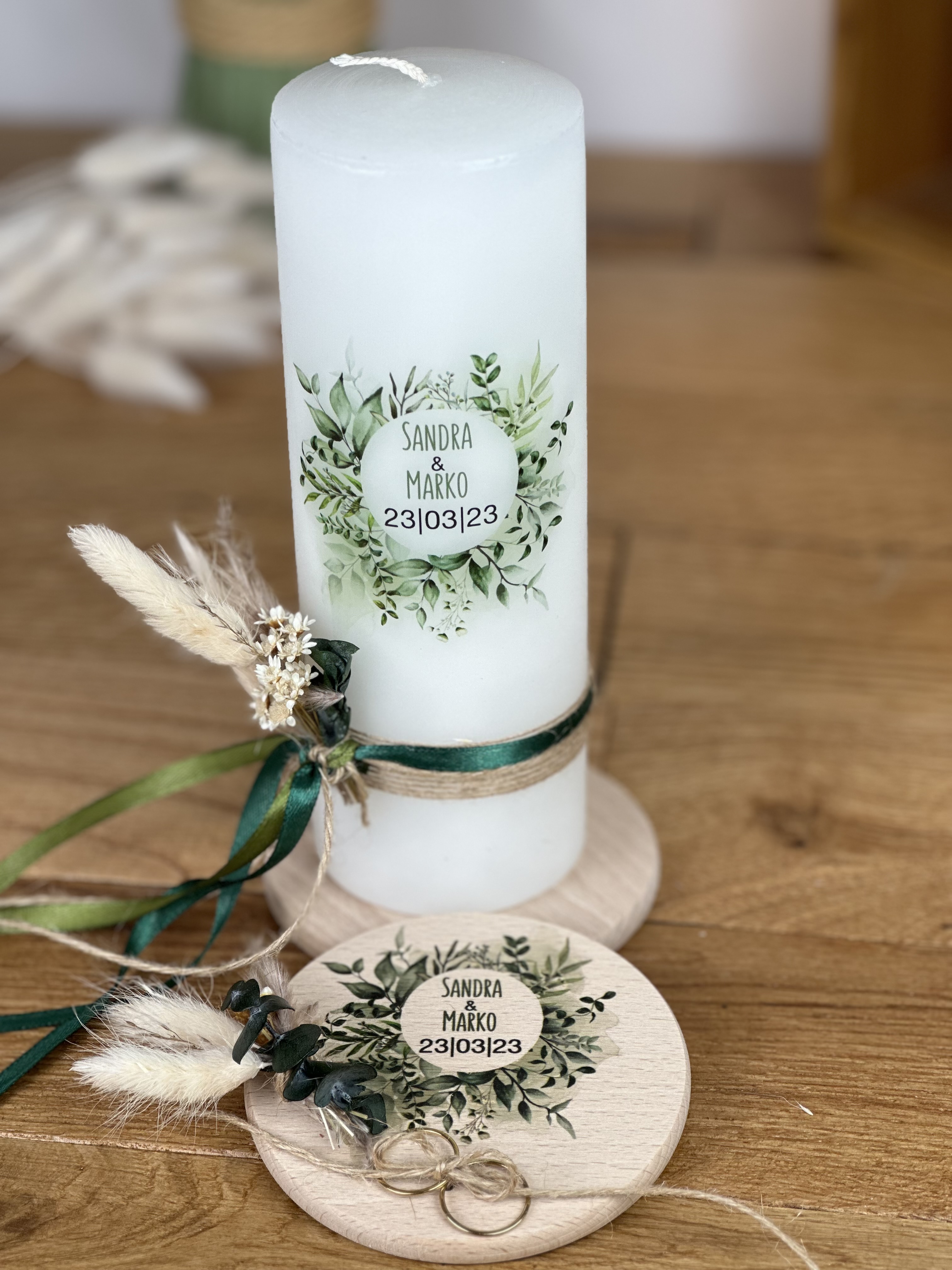 Die Hochzeitskerze mit Eukalyptuskranz und passendem Ringteller ist das perfekte Accessoire für eine romantische Hochzeitszeremonie. Die Kerze ist handgefertigt und verziert mit einem wunderschönen Eukalyptuskranz, der für Frische und Natürlichkeit steht. Der dazu passende Ringteller ist ebenfalls mit dem gleichen Motiv verziert und bildet somit eine harmonische Einheit.