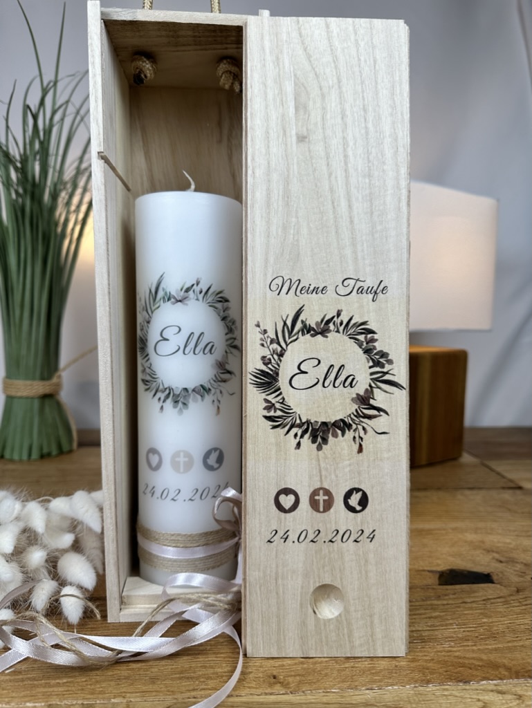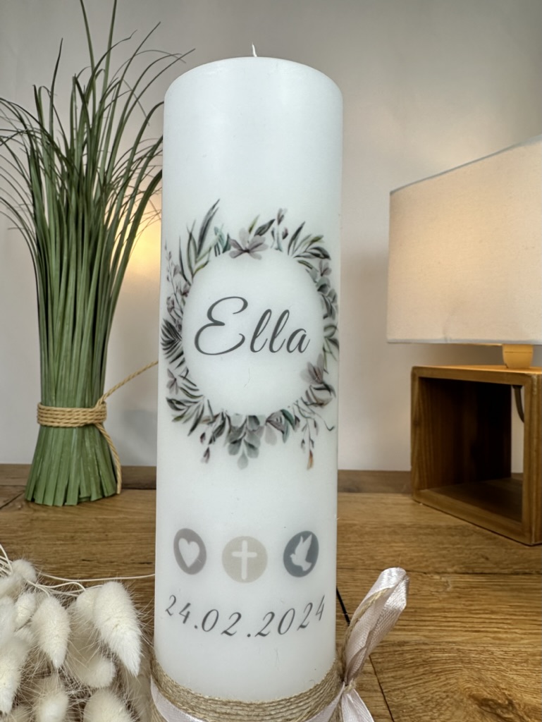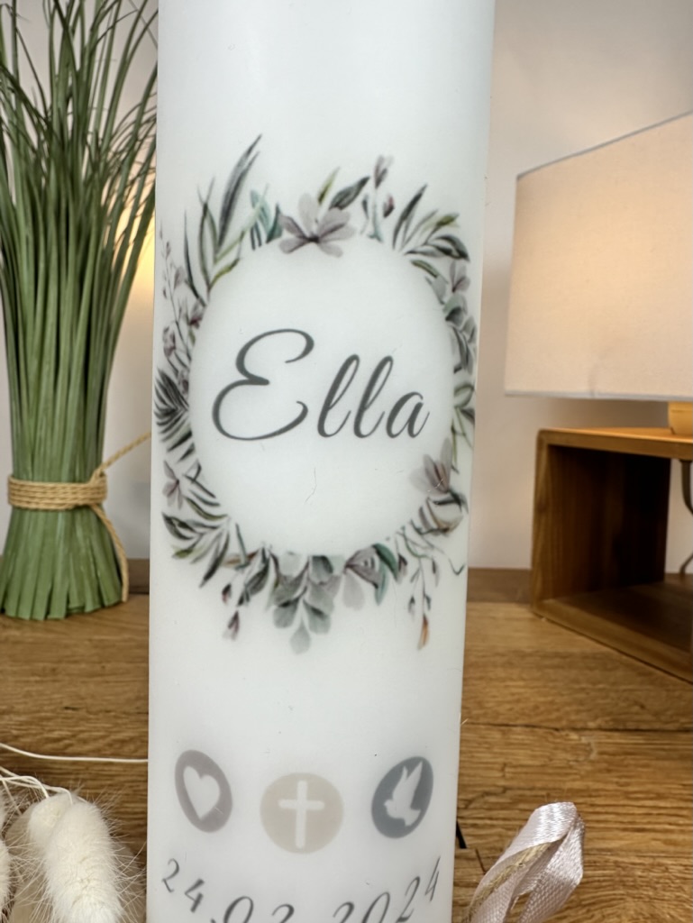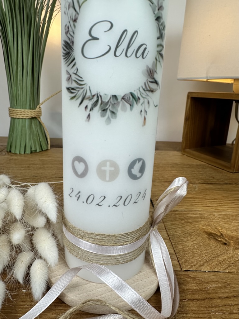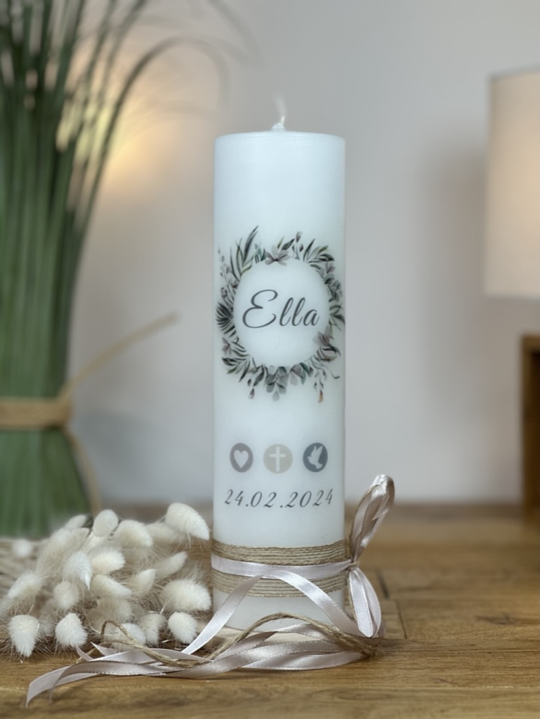 ist eine wunderschöne und einzigartige Kerze, die perfekt für die Taufe einer jungen Dame oder als Hochzeitskerze geeignet ist. Mit ihrem zarten Taupe und Beigetöne strahlt diese Kerze eine liebevolle und sanfte Atmosphäre aus.