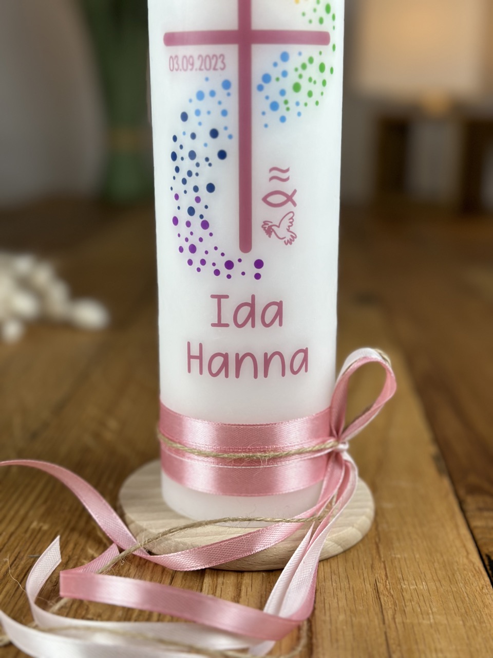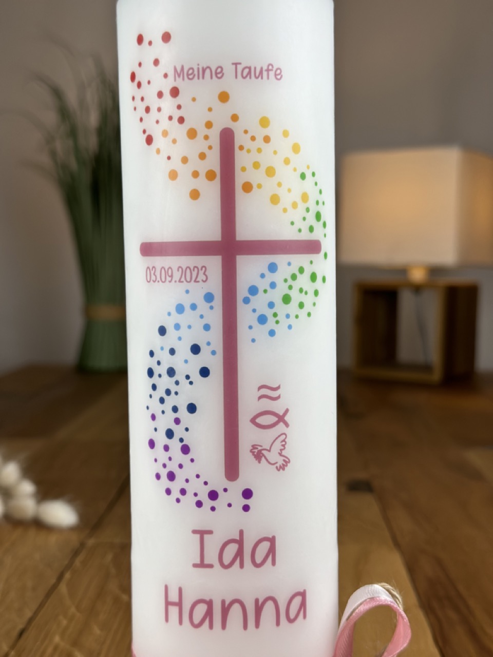 Lassen Sie sich von der Schönheit und Symbolik unserer einzigartigen Taufkerze in zarten Rosatönen verzaubern. Diese besondere Kerze präsentiert ein großes Kreuz, das von kleinen Punkten in leuchtenden Regenbogenfarben umgeben ist. Jeder Punkt repräsentiert die Vielfalt und Einzigartigkeit des Lebens. Zusätzlich finden Sie drei kleine Symbole, die die Bedeutung der Taufe verkörpern: das Zeichen für Wasser, das Reinheit und Erneuerung symbolisiert, eine Friedenstaube, die Harmonie und Segen bringt, und ein kleiner Fisch, der für den Glauben steht. Diese liebevoll gestaltete Taufkerze ist nicht nur ein wunderschönes Dekorationsstück, sondern auch ein bedeutungsvolles Geschenk, das den Beginn eines spirituellen Lebensweges feiert.