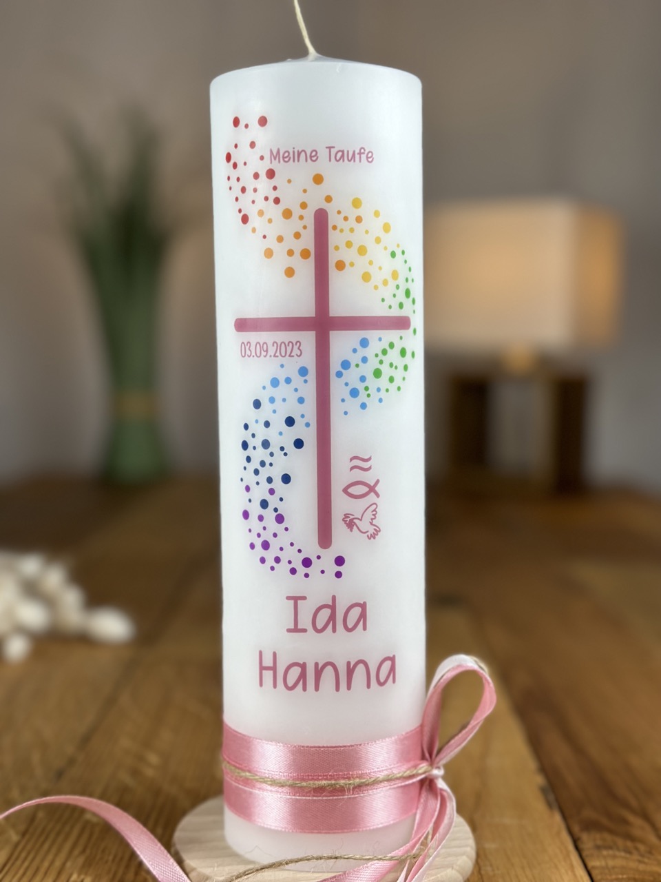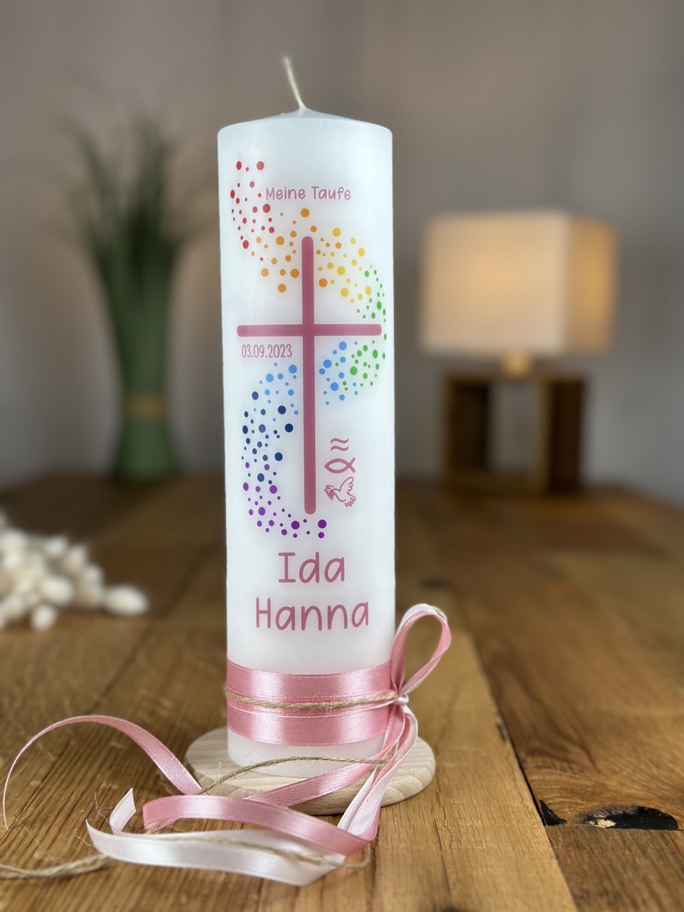Die Taufkerze "Kreuz in rosa mit Regenbogenpunkten"