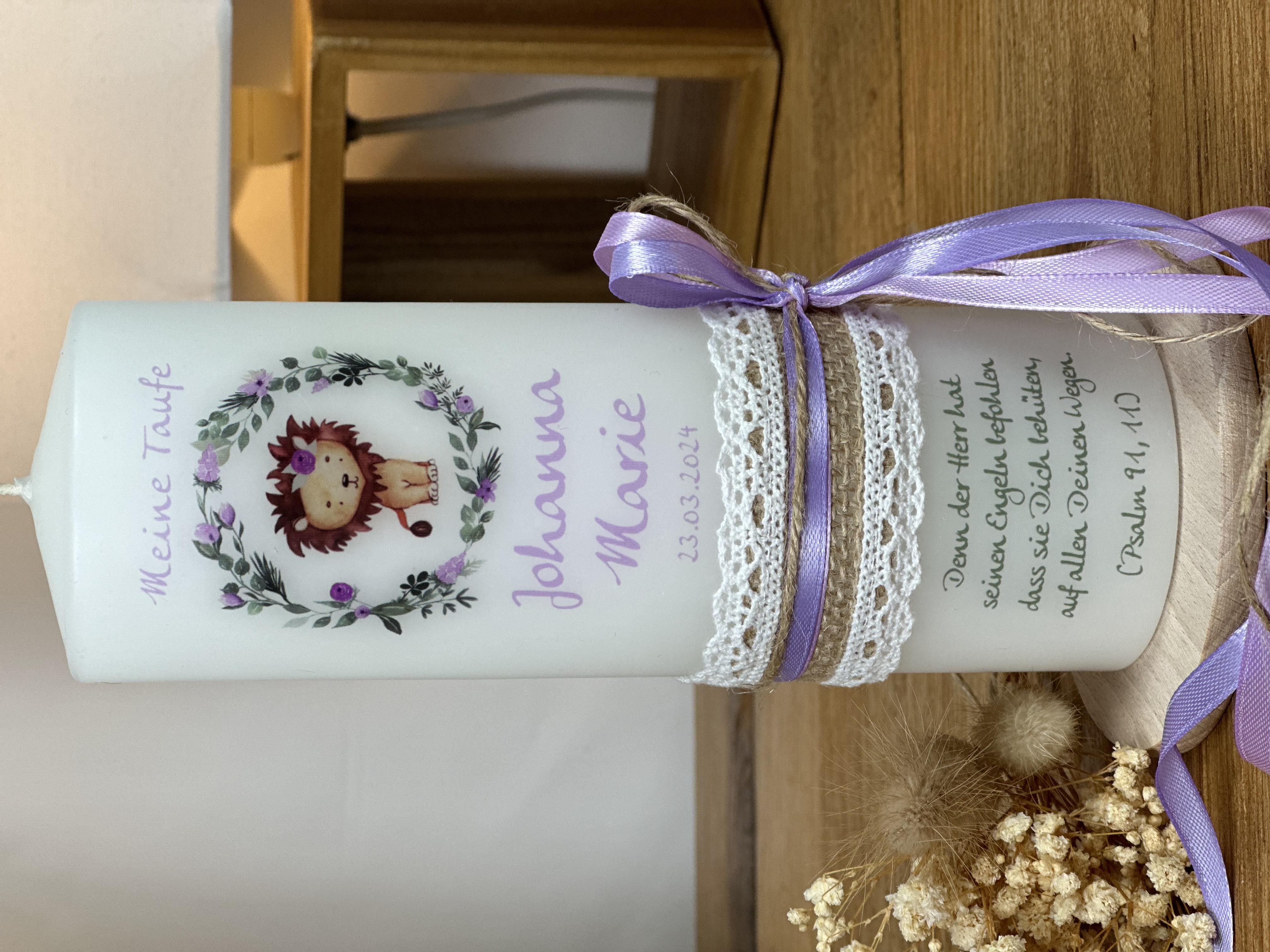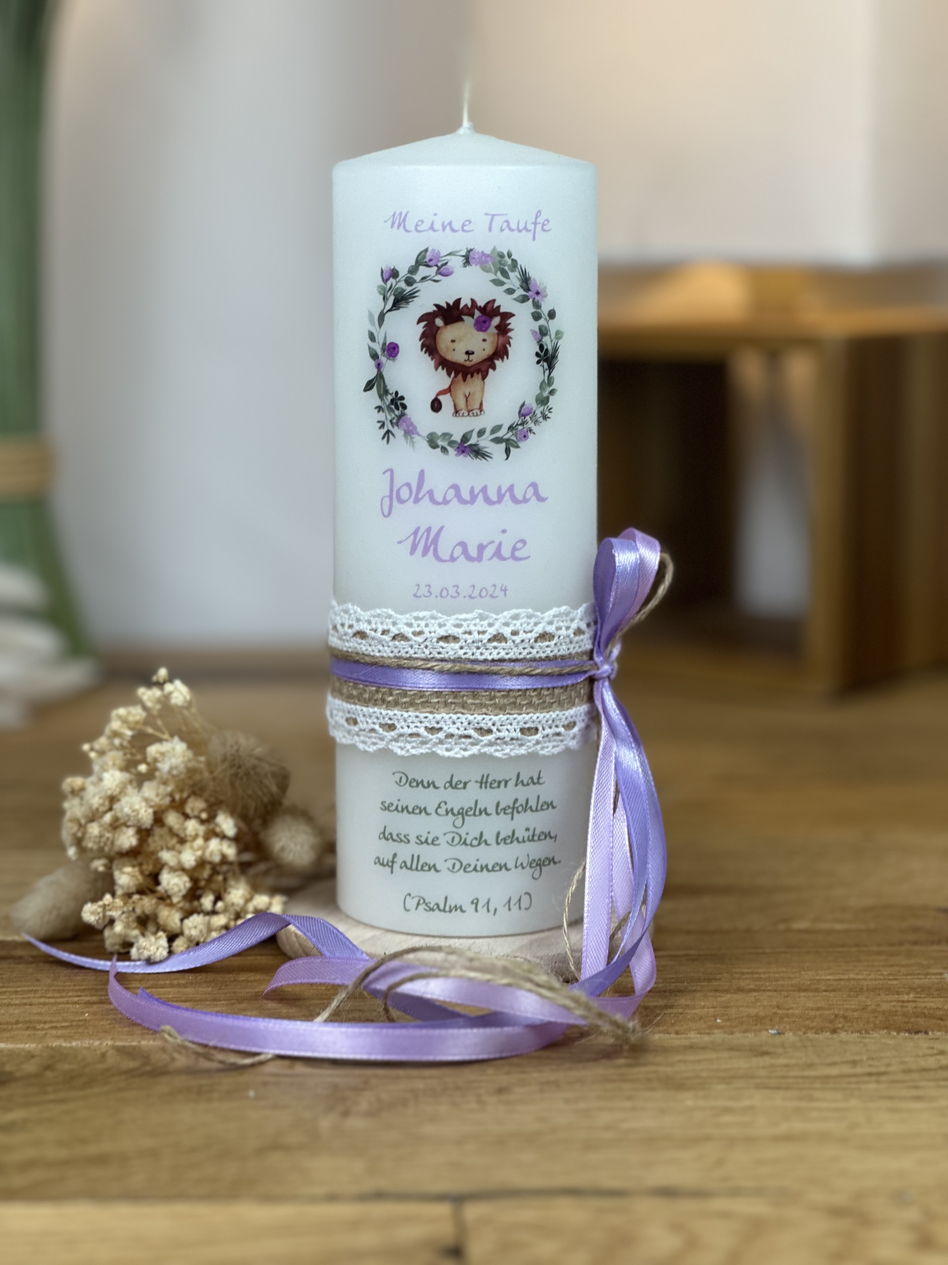 Über dem Blumenkranz thront die stolze Löwin, der als Beschützer und Wächter fungiert. Seine majestätische Präsenz verleiht der Kerze eine zusätzliche symbolische Bedeutung und erinnert daran, dass das Kind von nun an von einem starken und mutigen Begleiter auf seinem Lebensweg begleitet wird.