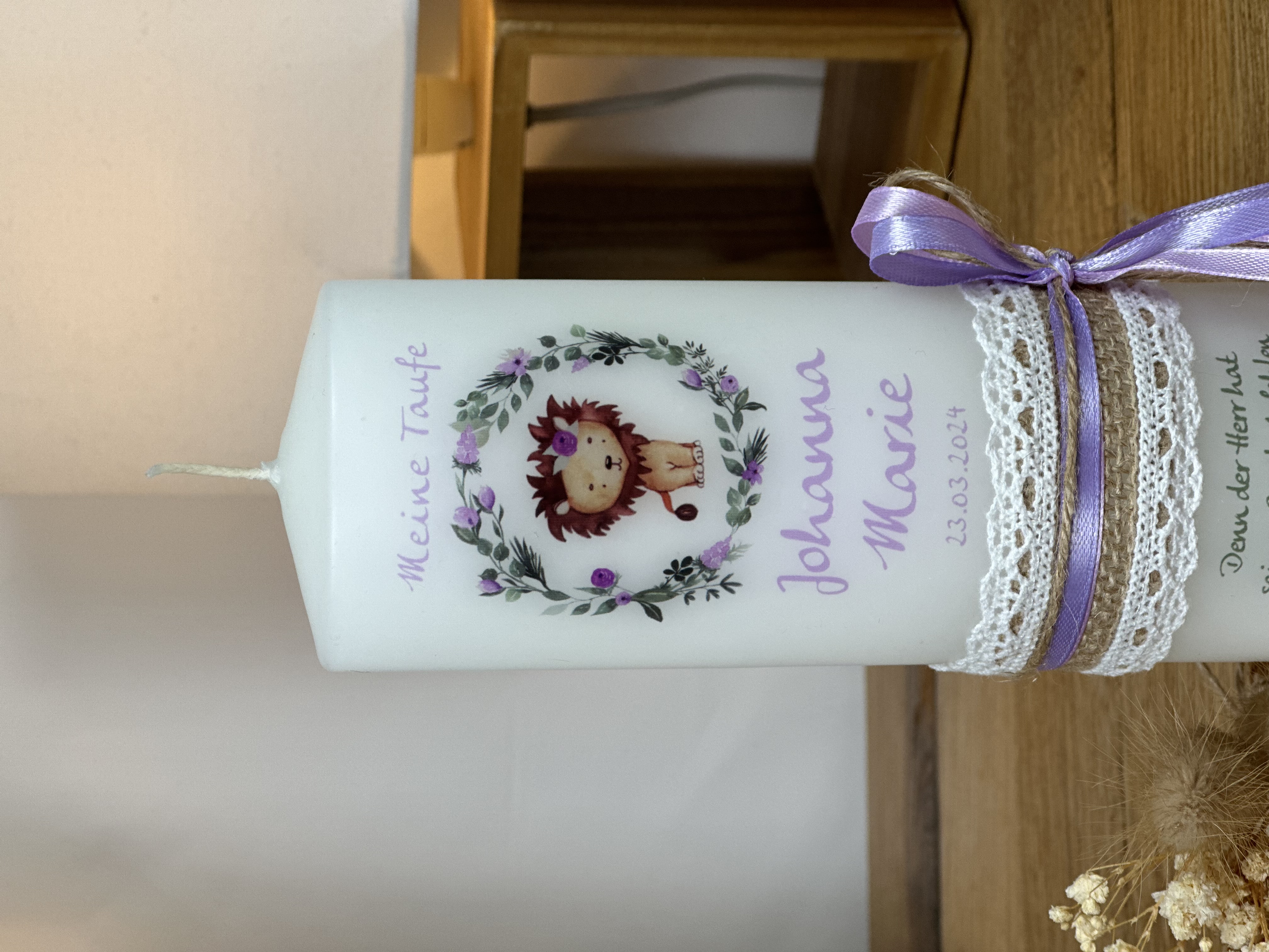 Die Taufkerze "Löwenmädchen im Blütenkranz"