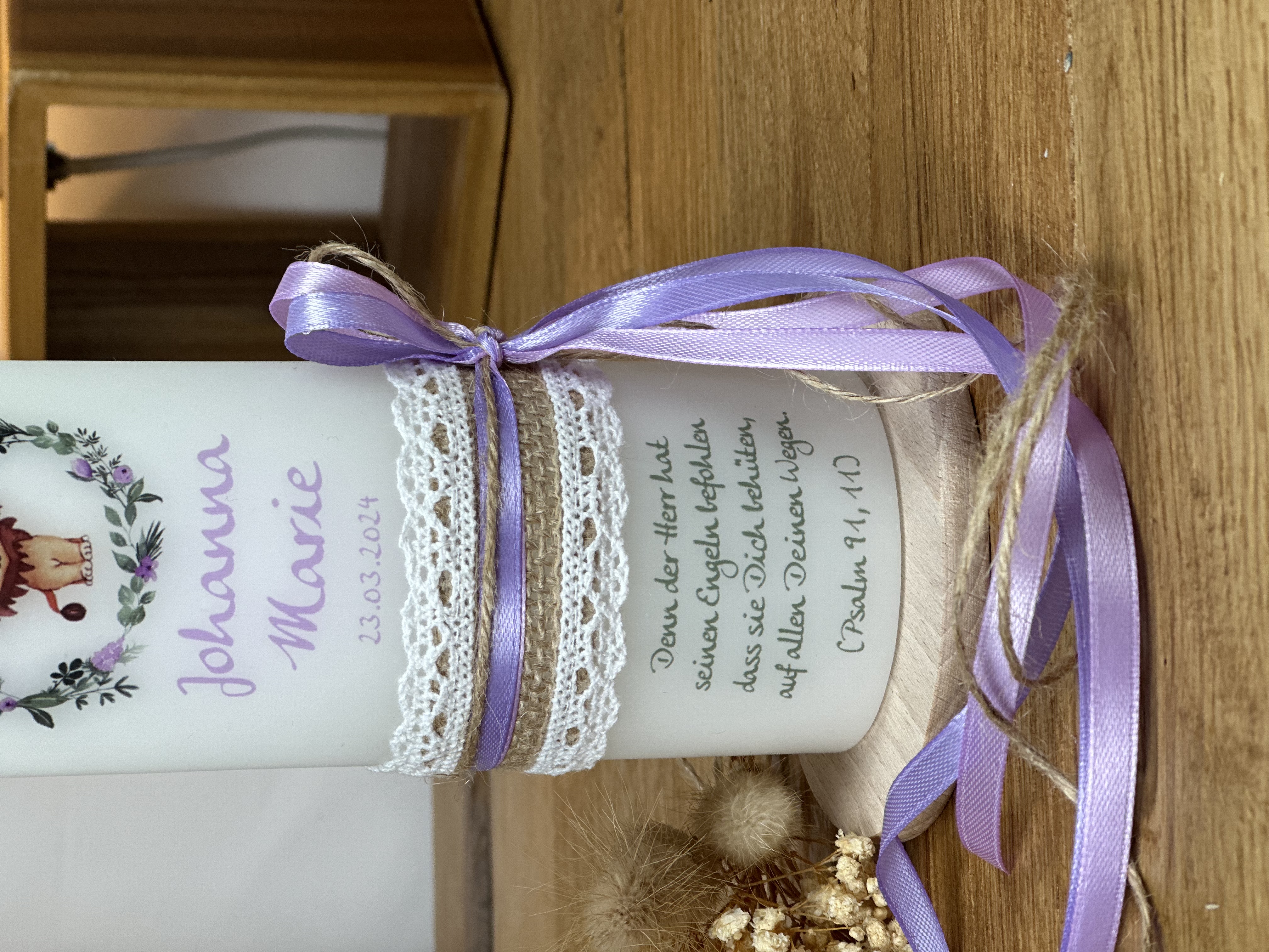 Unsere wunderschöne Taufkerze ist ein symbolträchtiges Geschenk für den besonderen Anlass der Taufe. Mit ihrem einzigartigen Design wird sie sicherlich alle Blicke auf sich ziehen. Der Blumen und Blüten, der in den beruhigenden fliederfarben erstrahlt, symbolisiert Hoffnung, Glück und den Beginn eines neuen Lebensweges.