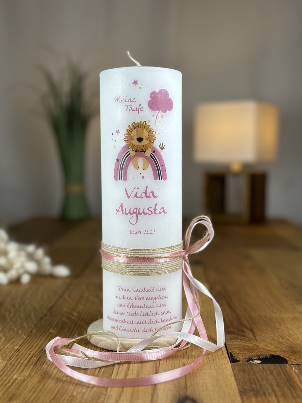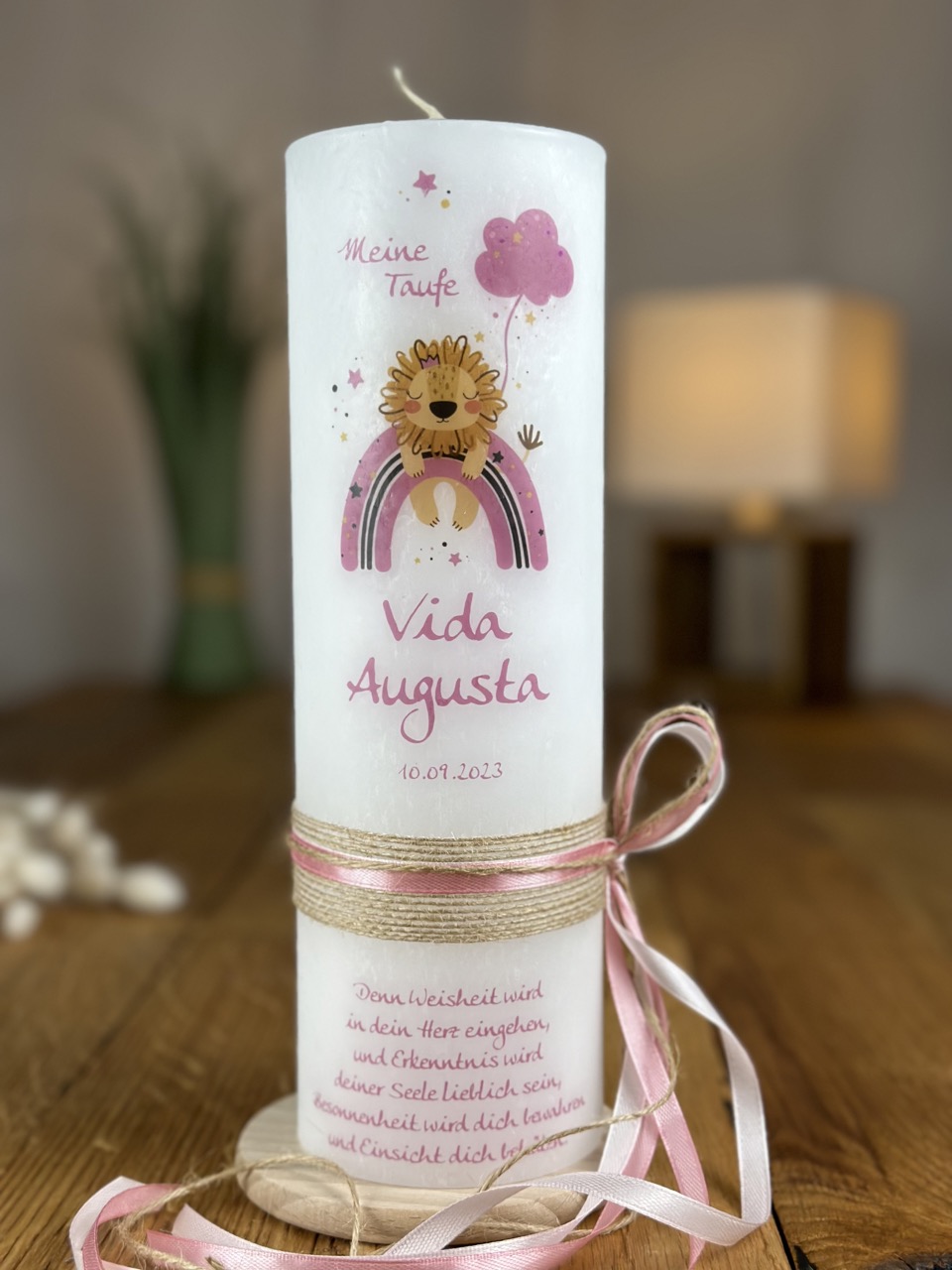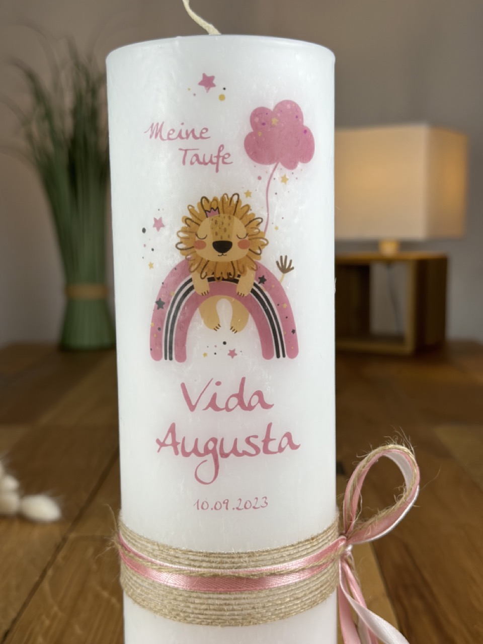 Über dem Regenbogen thront ein stolzer Löwe, der als Beschützer und Wächter fungiert. Seine majestätische Präsenz verleiht der Kerze eine zusätzliche symbolische Bedeutung und erinnert daran, dass das Kind von nun an von einem starken und mutigen Begleiter auf seinem Lebensweg begleitet wird.