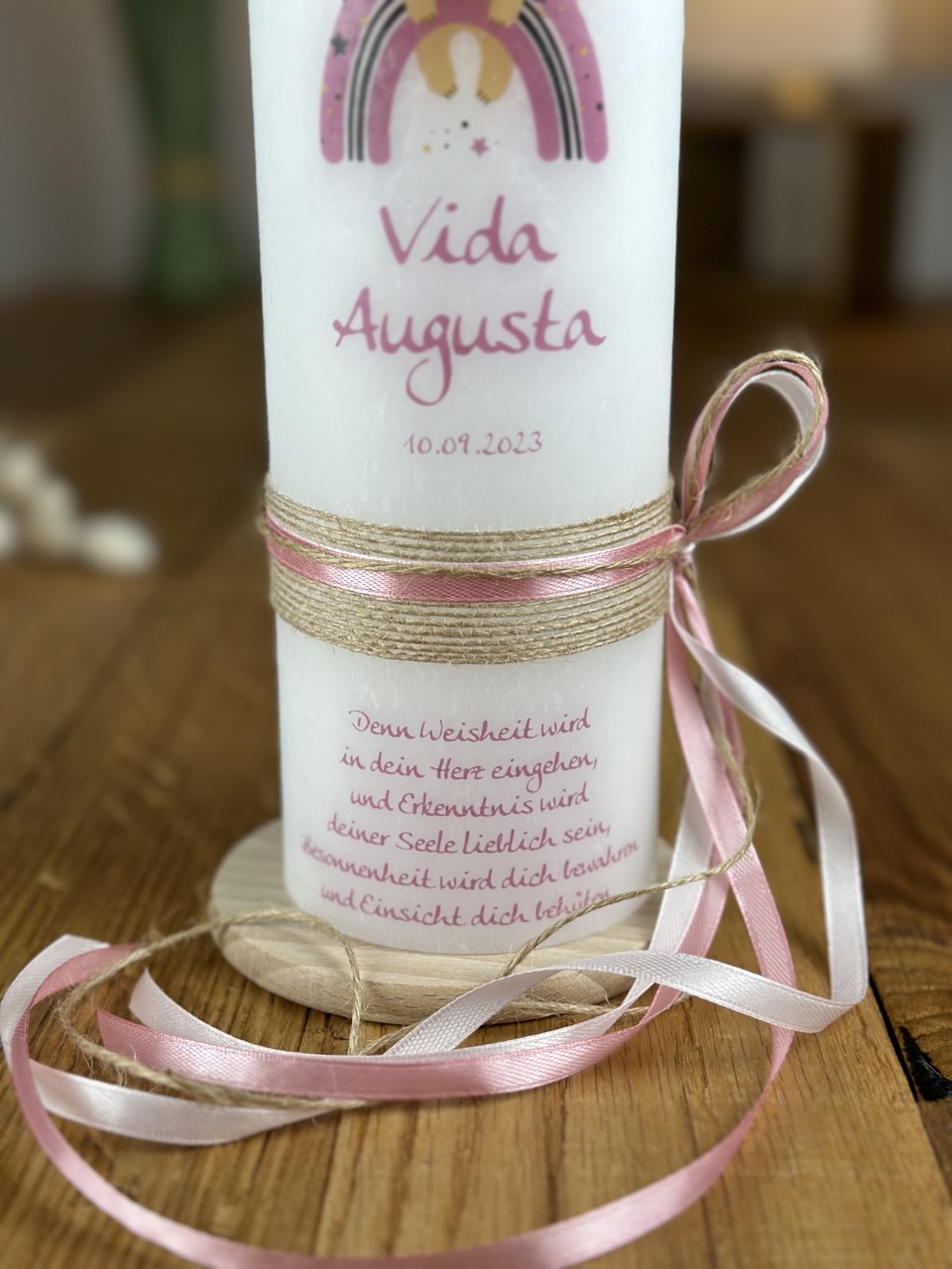 Unsere wunderschöne Taufkerze ist ein symbolträchtiges Geschenk für den besonderen Anlass der Taufe. Mit ihrem einzigartigen Design wird sie sicherlich alle Blicke auf sich ziehen. Der Regenbogen, der in den beruhigenden Rosafarben erstrahlt, symbolisiert Hoffnung, Glück und den Beginn eines neuen Lebensweges.