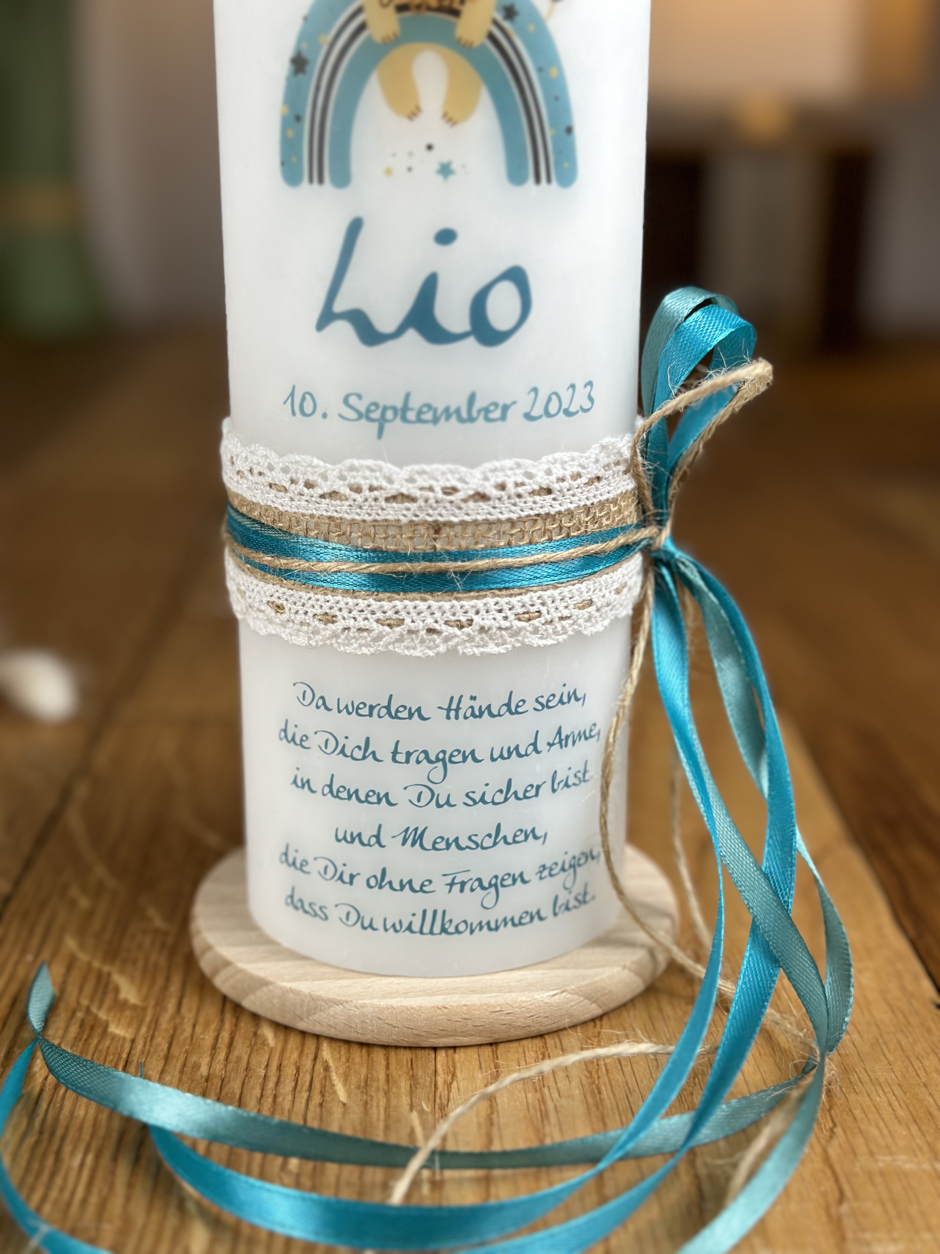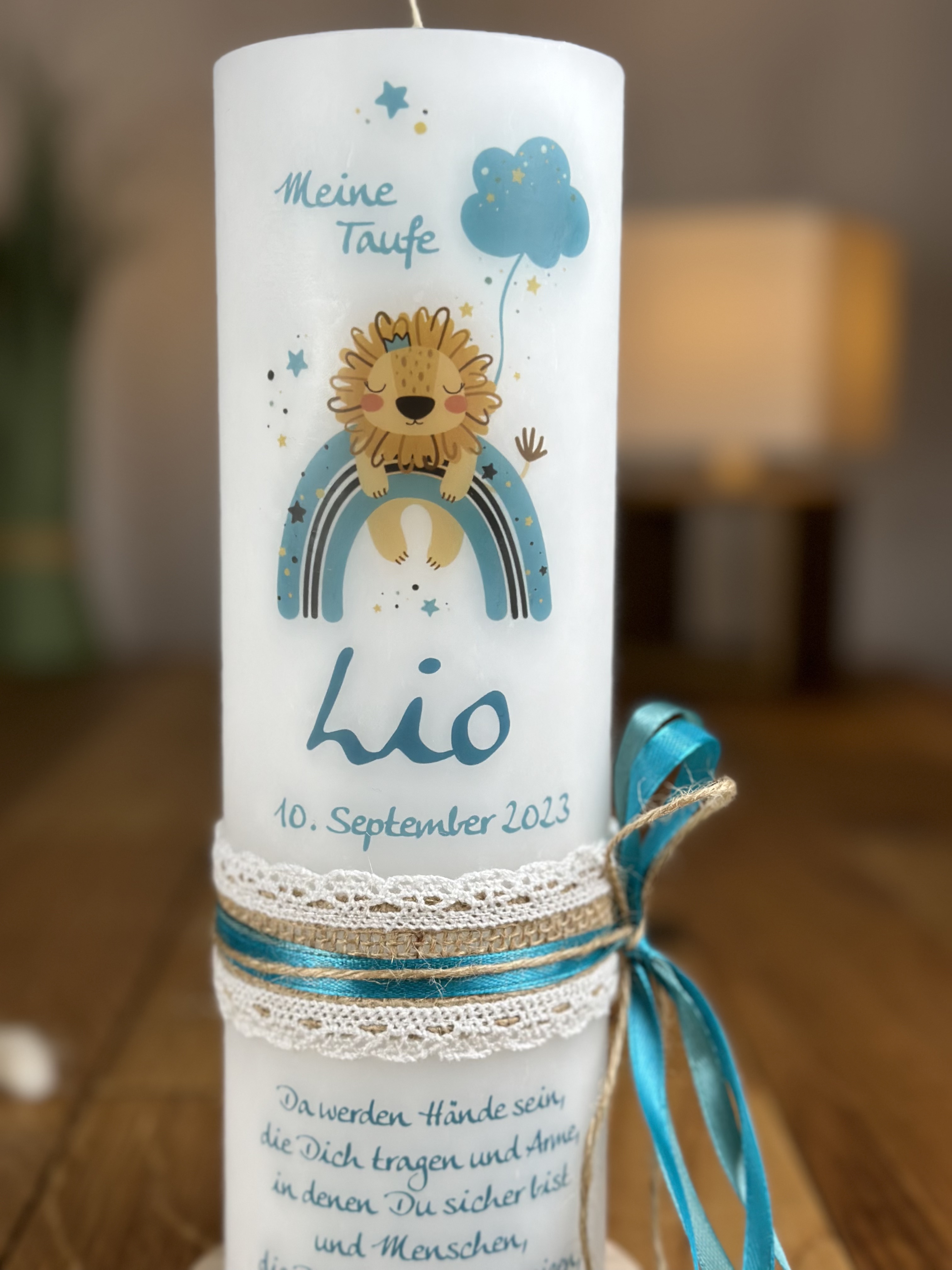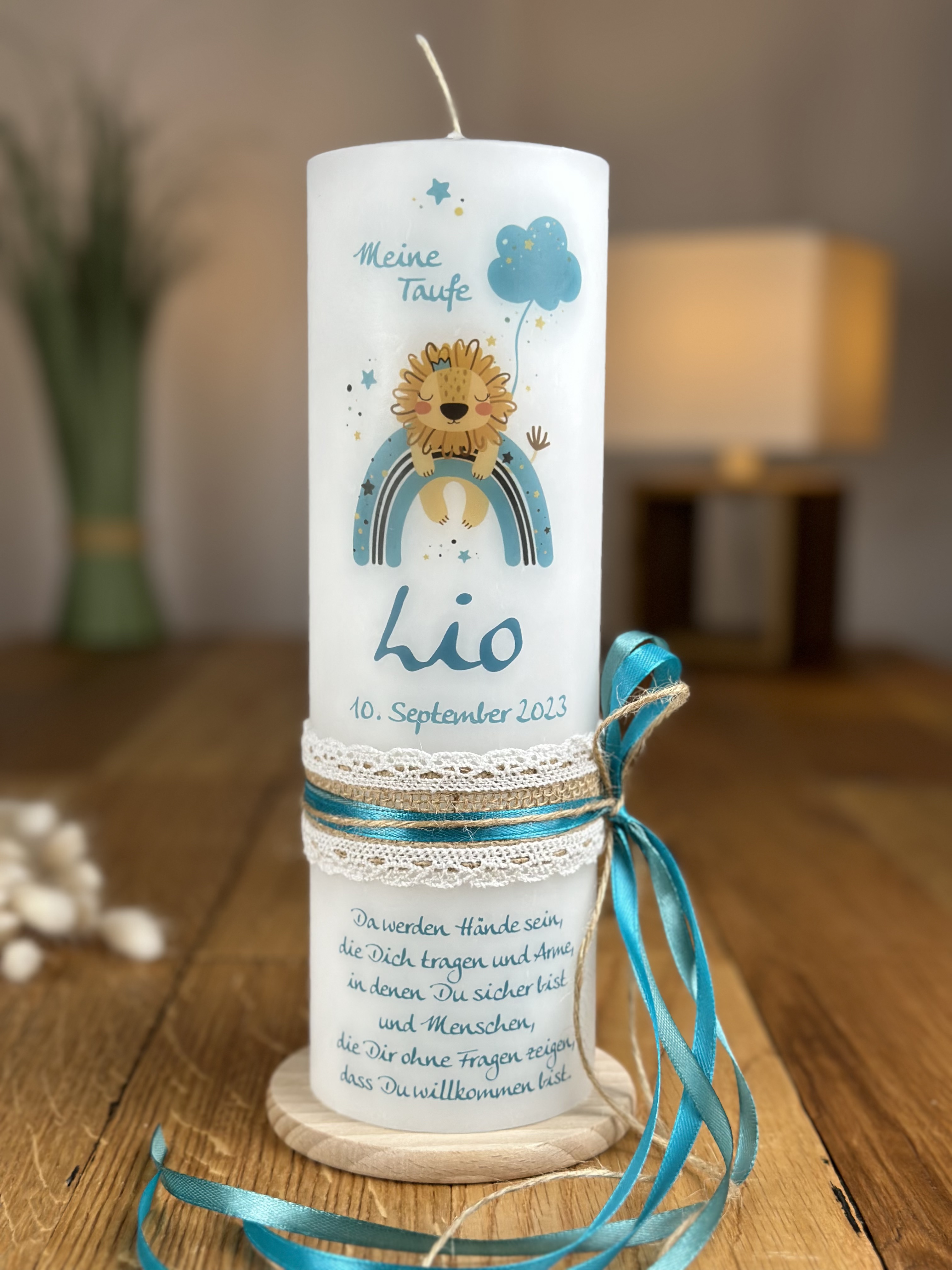 Über dem Regenbogen thront ein stolzer Löwe, der als Beschützer und Wächter fungiert. Seine majestätische Präsenz verleiht der Kerze eine zusätzliche symbolische Bedeutung und erinnert daran, dass das Kind von nun an von einem starken und mutigen Begleiter auf seinem Lebensweg begleitet wird.