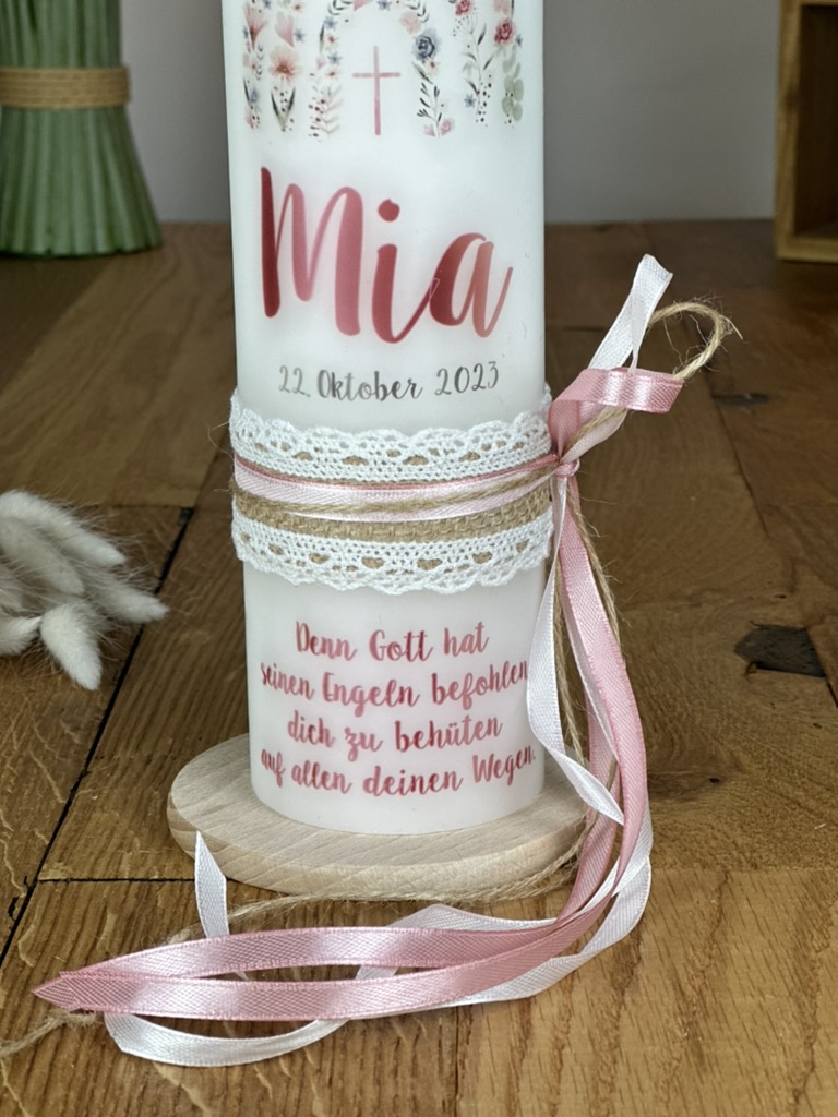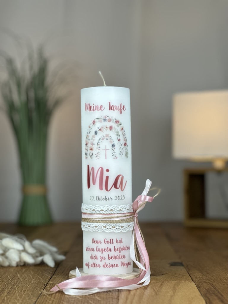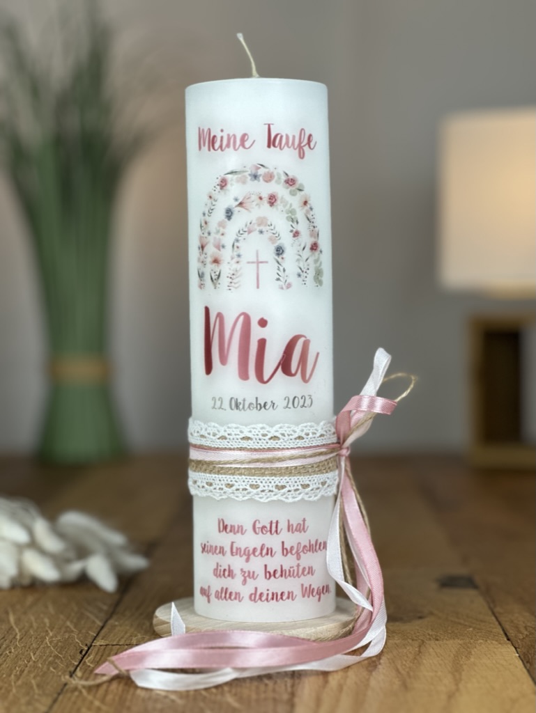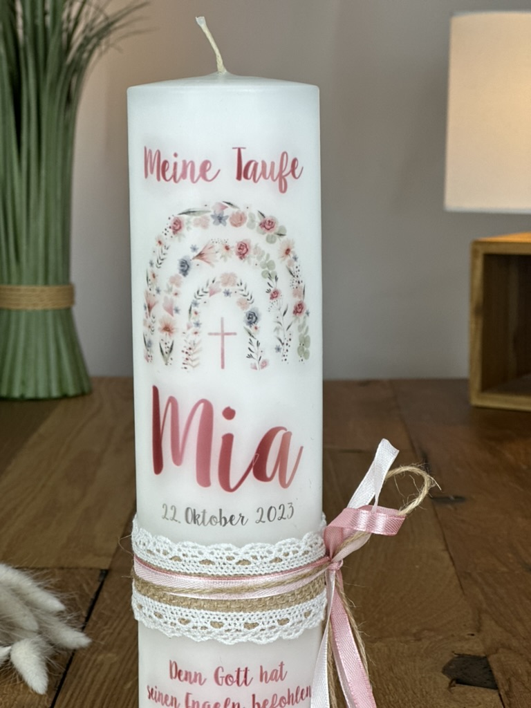 Lassen Sie diese einzigartige Tauf- und Kommunionkerze mit dem Regenbogen aus zarten rosa Blüten zu einem unvergesslichen Teil Ihres Festes werden und bringen Sie Licht und Freude in das Leben Ihrer Liebsten.