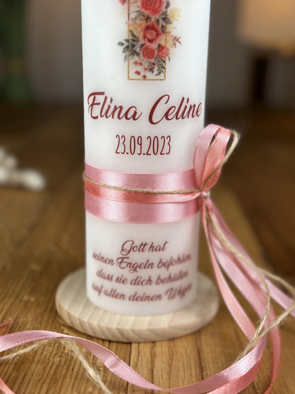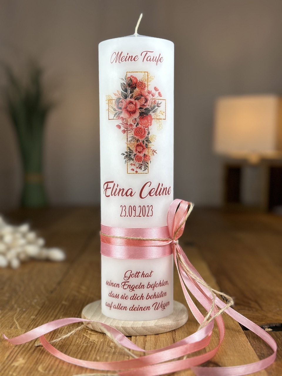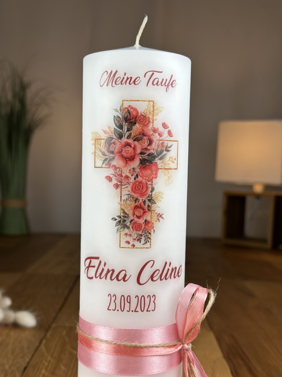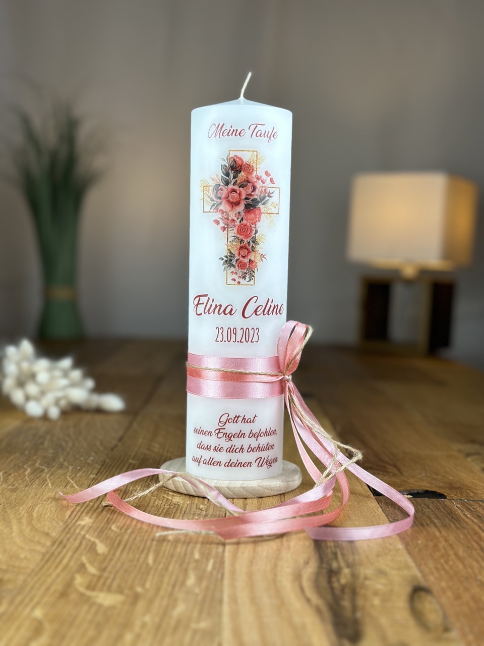 Diese wunderschöne Tauf- oder Kommunionkerze mit einem Rosenkreuz in den zarten bis kräftigen Farben Altrosa und Apricot ist ein einzigartiges Symbol der spirituellen Bedeutung dieser besonderen Anlässe. Das Kreuz, kunstvoll umschlungen von Rosen, verkörpert die Liebe, Reinheit und Hingabe, die mit der Taufe oder Kommunion einhergehen. Die sanften Farben Altrosa und Apricot verleihen der Kerze eine zarte und feminine Note, die perfekt zu diesen feierlichen Ereignissen passt.