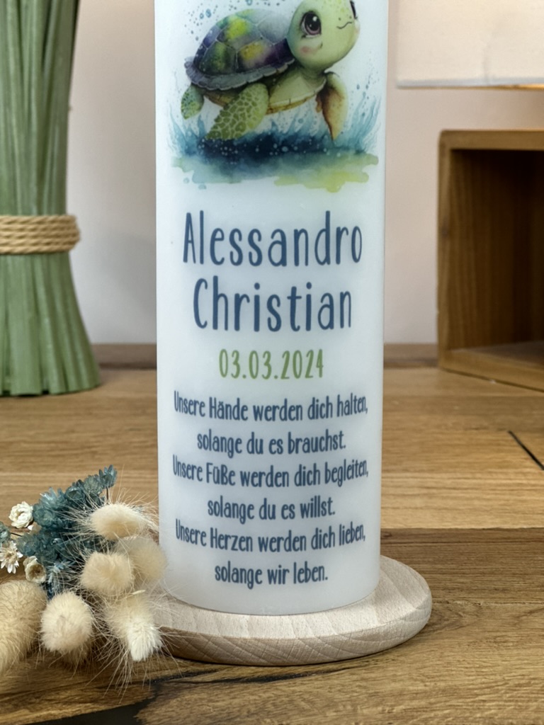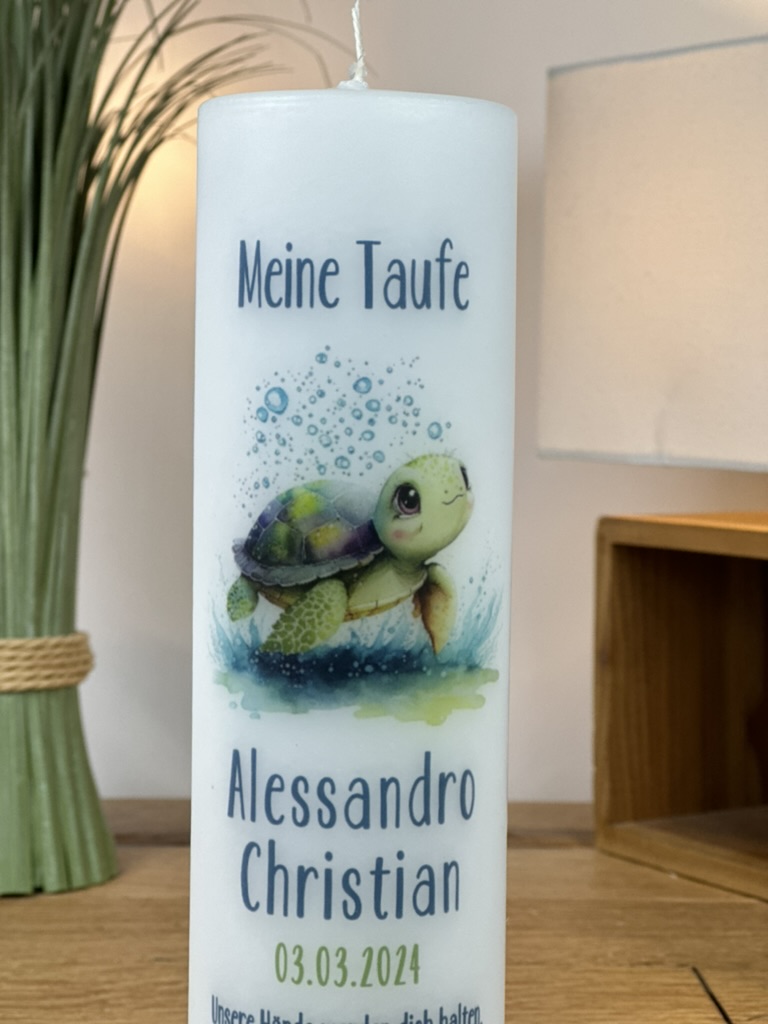 Die zauberhafte Tauf- und Kommunionkerze mit einem niedlichen Motiv einer Schildkröte in grün und blau gehalten und umgeben von vielen kleinen Blubber Bläschen ist ein bezauberndes Geschenk für diesen besonderen Anlass. Die Kerze strahlt mit ihrem verspielten Design und den frischen Farben eine fröhliche und liebevolle Atmosphäre aus.