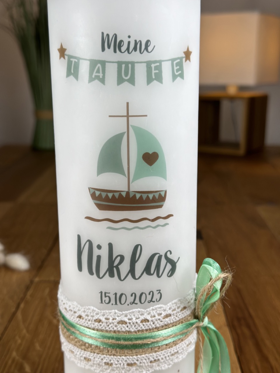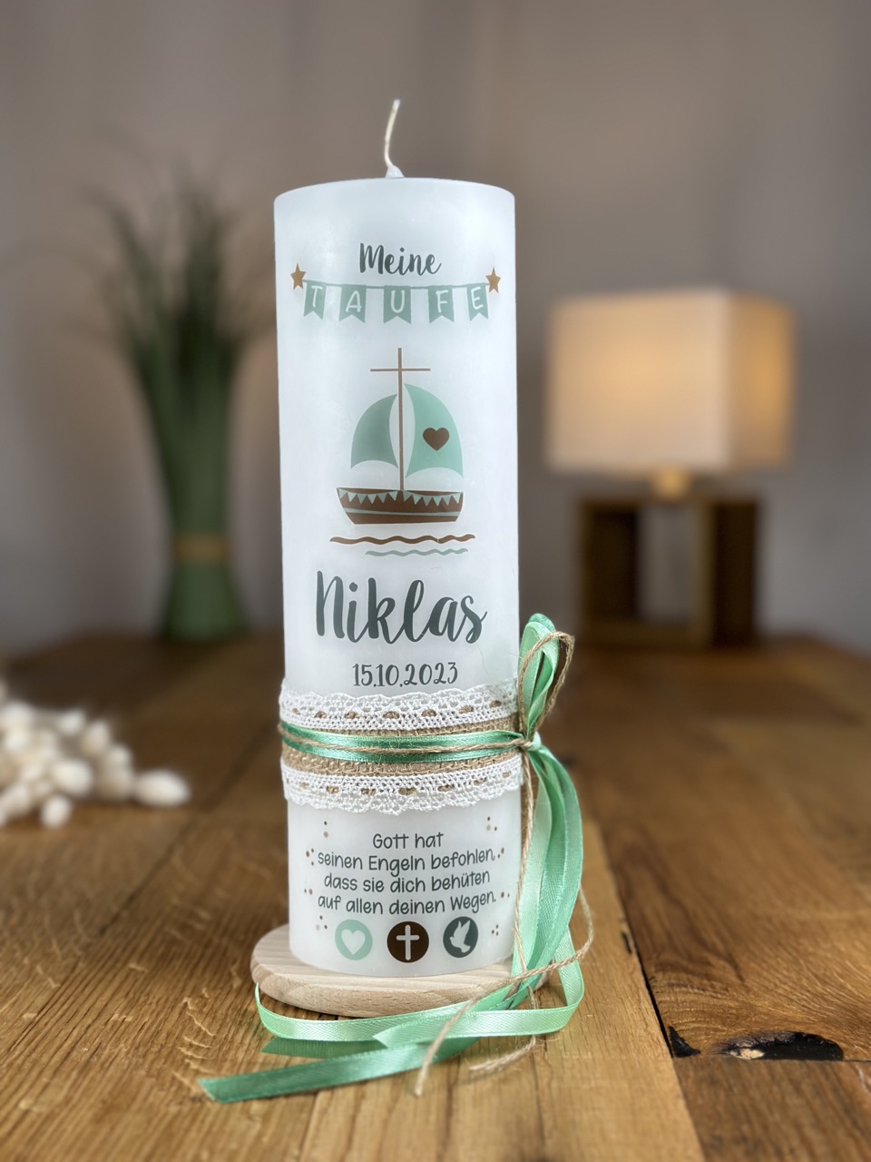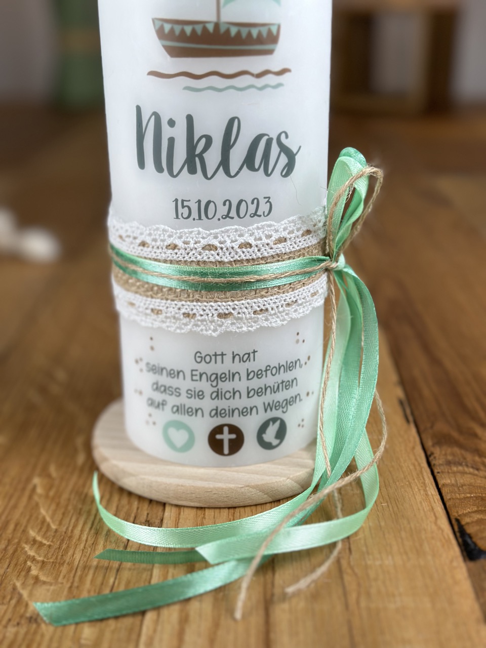 Diese zauberhafte Taufkerze mit einem Segelboot in den Farbe mint ist ein symbolträchtiges Geschenk für den besonderen Anlass der Taufe. Das Segelboot repräsentiert die Reise des Täuflings auf seinem spirituellen Weg und symbolisiert Hoffnung, Mut und den Glauben an eine strahlende Zukunft. Die sanften Farbe mint verleihen der Kerze eine beruhigende und friedliche Atmosphäre, die perfekt zu diesem feierlichen Ereignis passt. Handgefertigt und mit Liebe zum Detail gestaltet, ist diese Kerze nicht nur ein religiöses Symbol, sondern auch ein wertvolles Erinnerungsstück, das den Glauben und die Verbundenheit mit Gott für viele Jahre widerspiegelt.