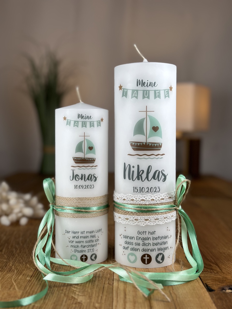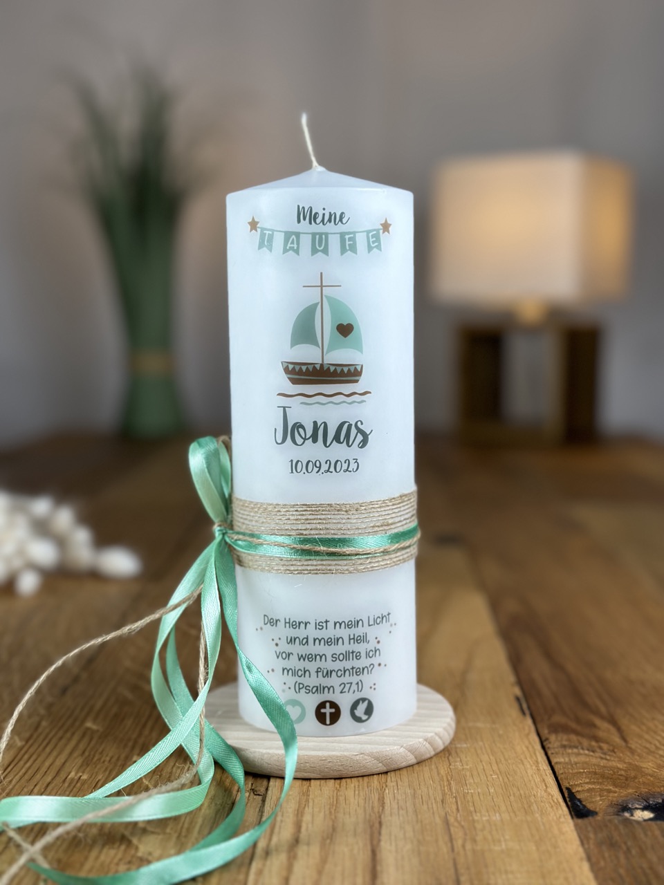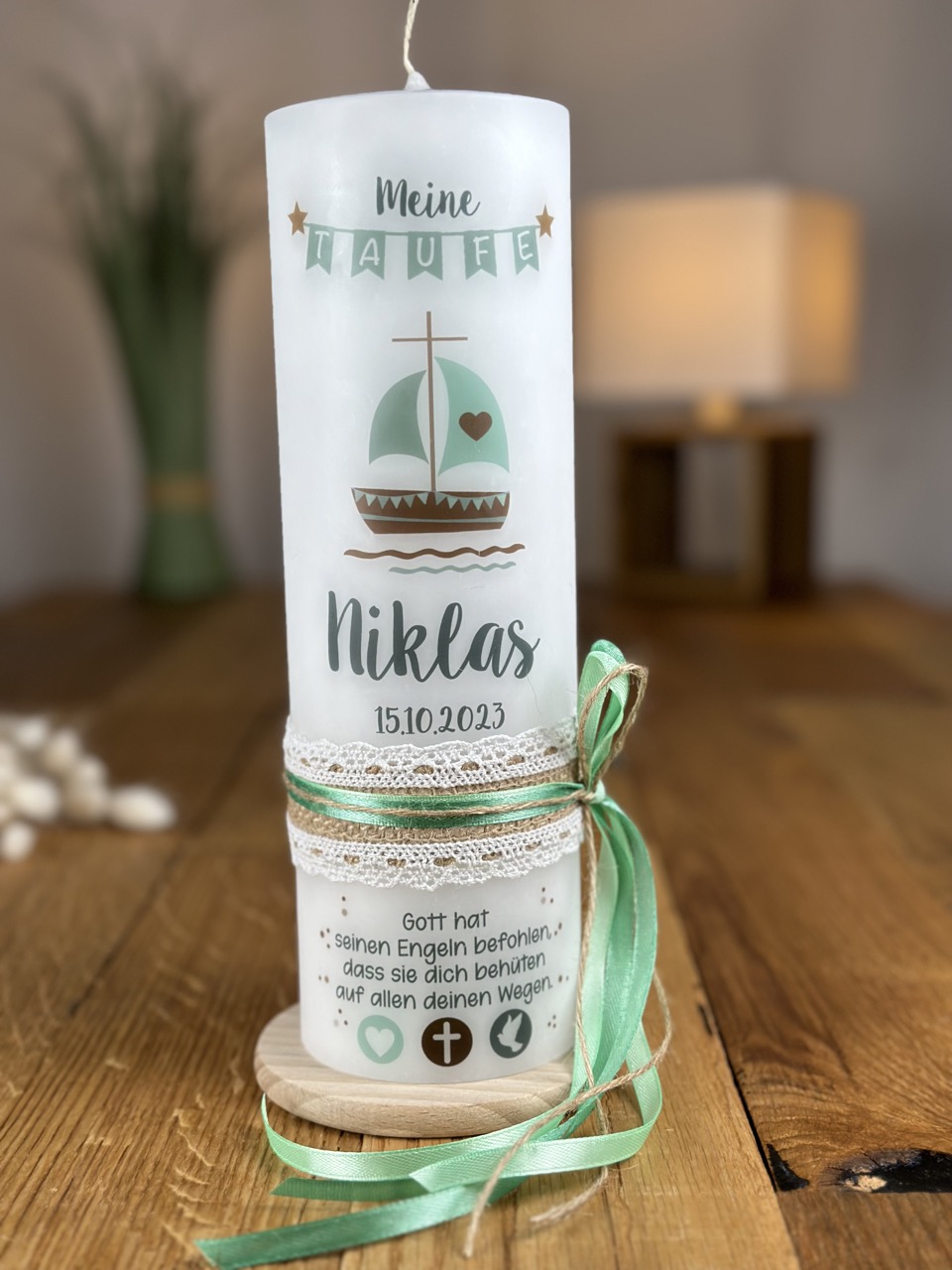 Diese zauberhafte Taufkerze mit einem Segelboot in den Farbe mint ist ein symbolträchtiges Geschenk für den besonderen Anlass der Taufe. Das Segelboot repräsentiert die Reise des Täuflings auf seinem spirituellen Weg und symbolisiert Hoffnung, Mut und den Glauben an eine strahlende Zukunft. Die sanften Farbe mint verleihen der Kerze eine beruhigende und friedliche Atmosphäre, die perfekt zu diesem feierlichen Ereignis passt. Handgefertigt und mit Liebe zum Detail gestaltet, ist diese Kerze nicht nur ein religiöses Symbol, sondern auch ein wertvolles Erinnerungsstück, das den Glauben und die Verbundenheit mit Gott für viele Jahre widerspiegelt.