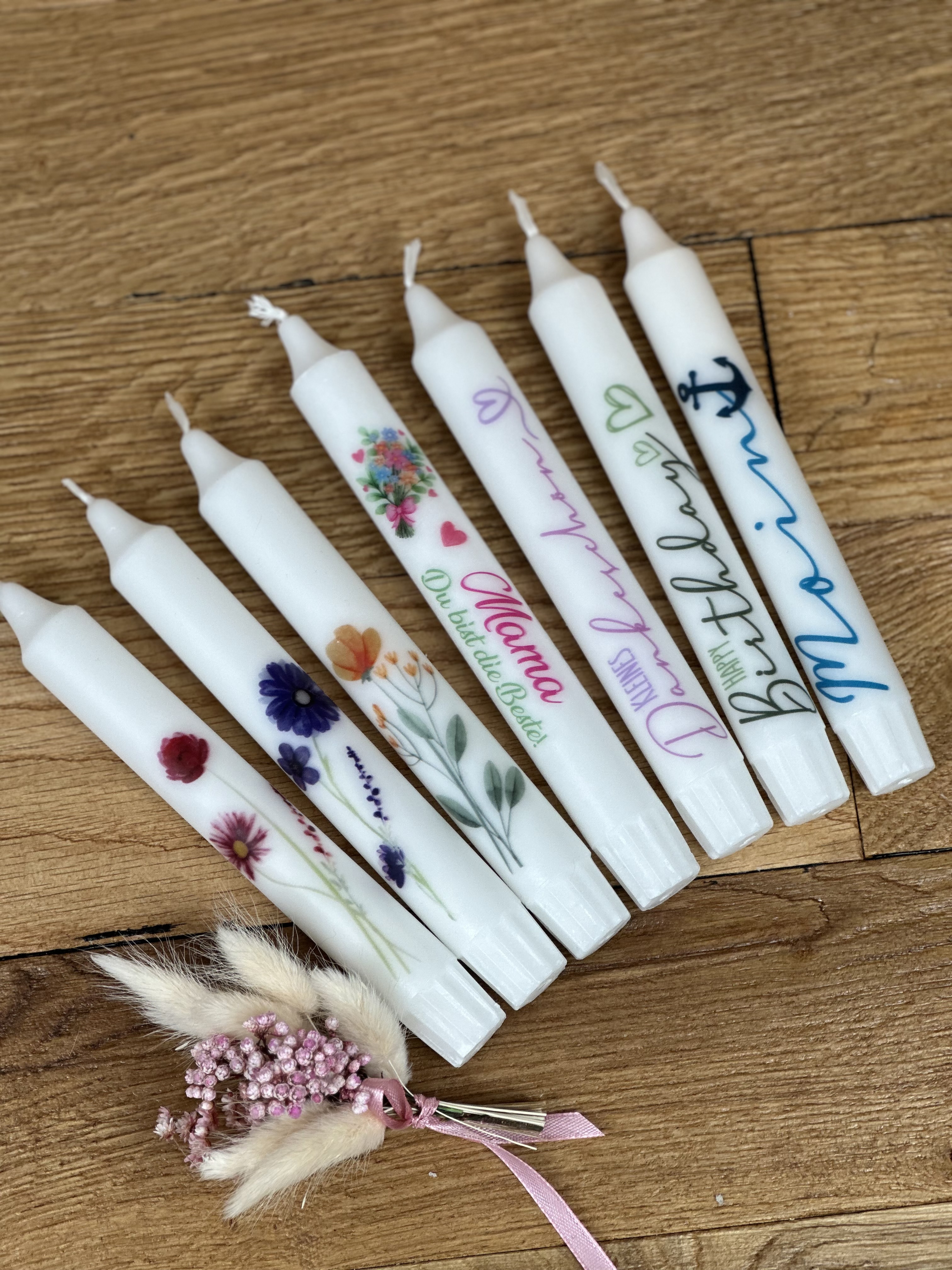 Da sind sie, unsere Stabkerzen! Zum Verschen, als kleine Aufmerksamkeit, zum Muttertag oder ganz einfach zum selber behalten. Wir zaubern wundervolle Stabkerzen mit Spruch oder Motiven für euch. Ganz nach unserem Motto Persönlich I Einzigartig I Modern. In klassisch weiß oder bunt. Stabkerzen kaufen und verschenken – hier ist für Jeden etwas dabei!