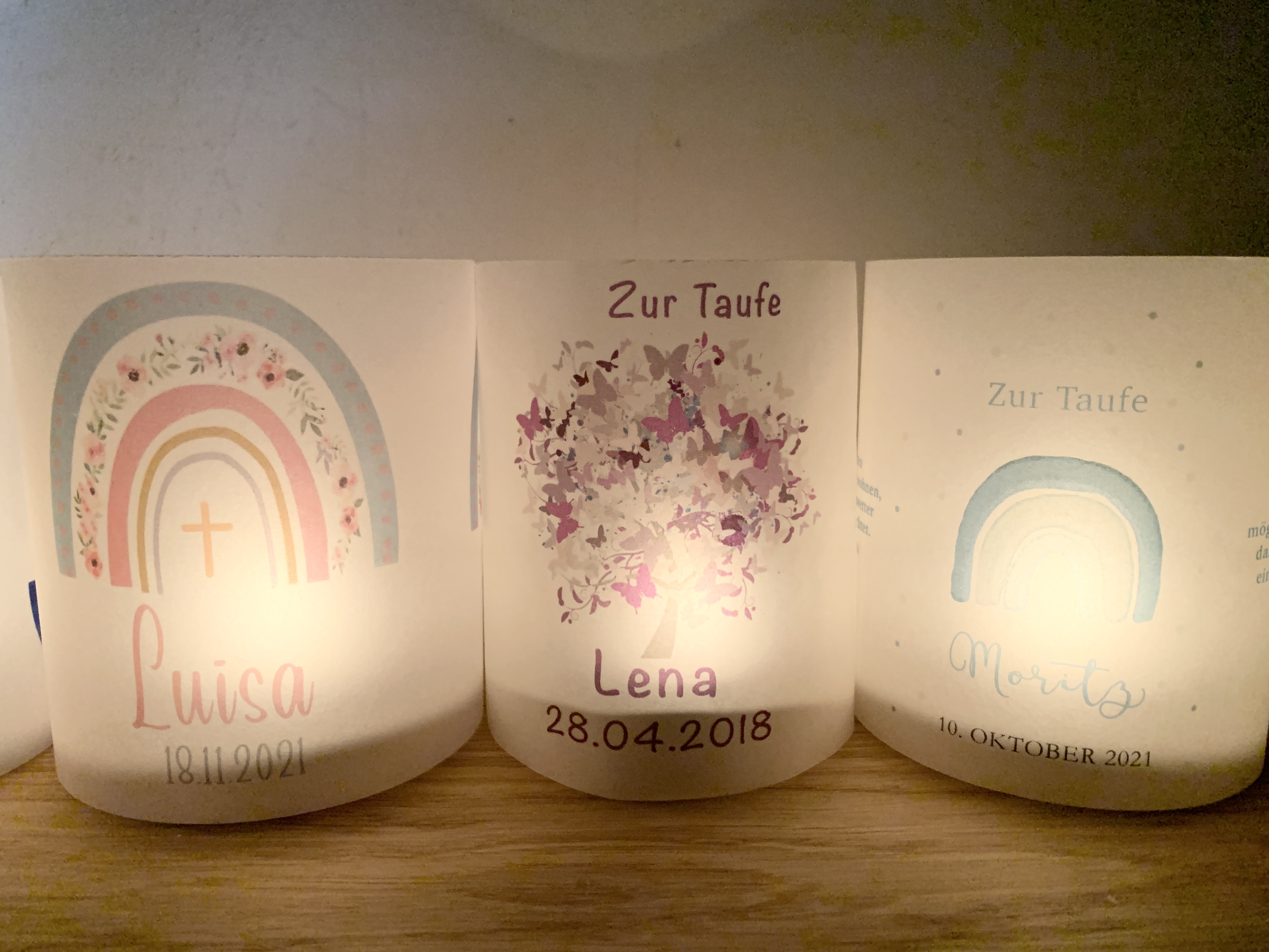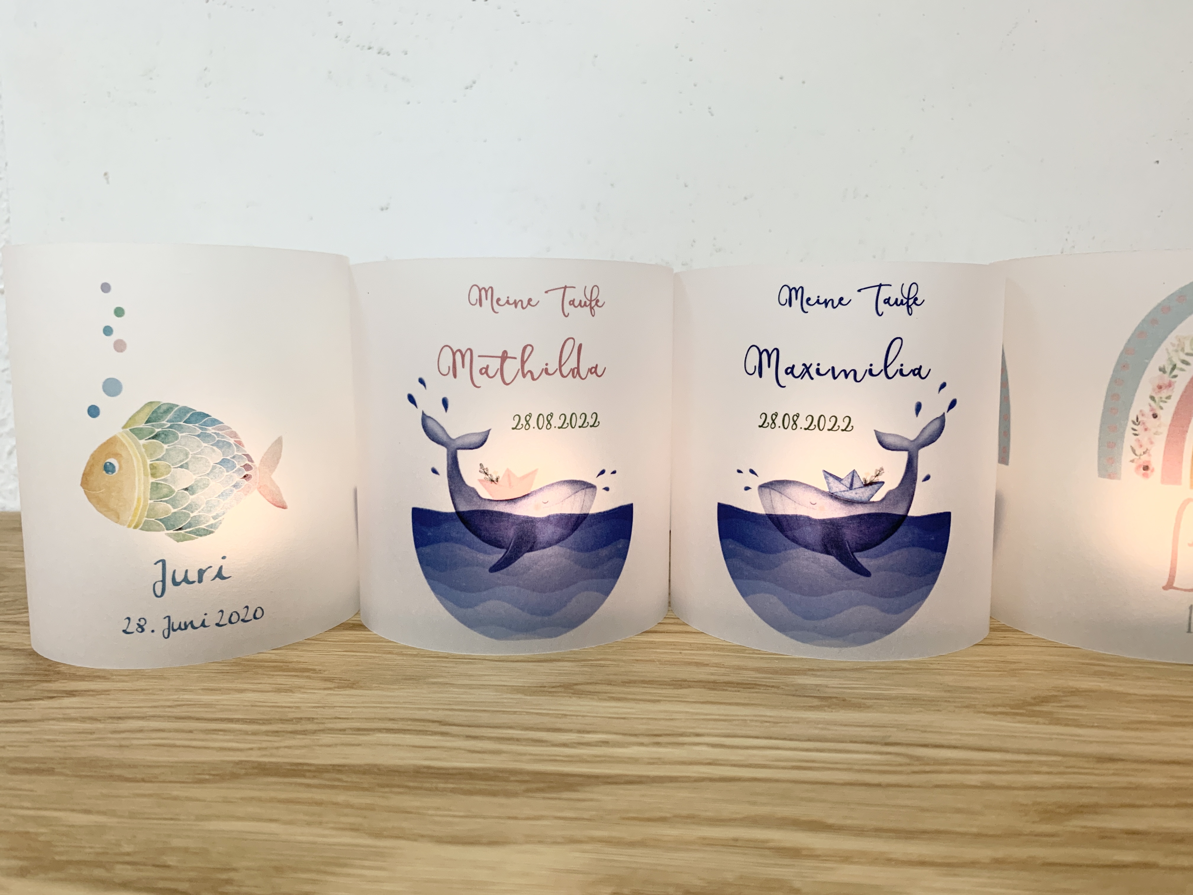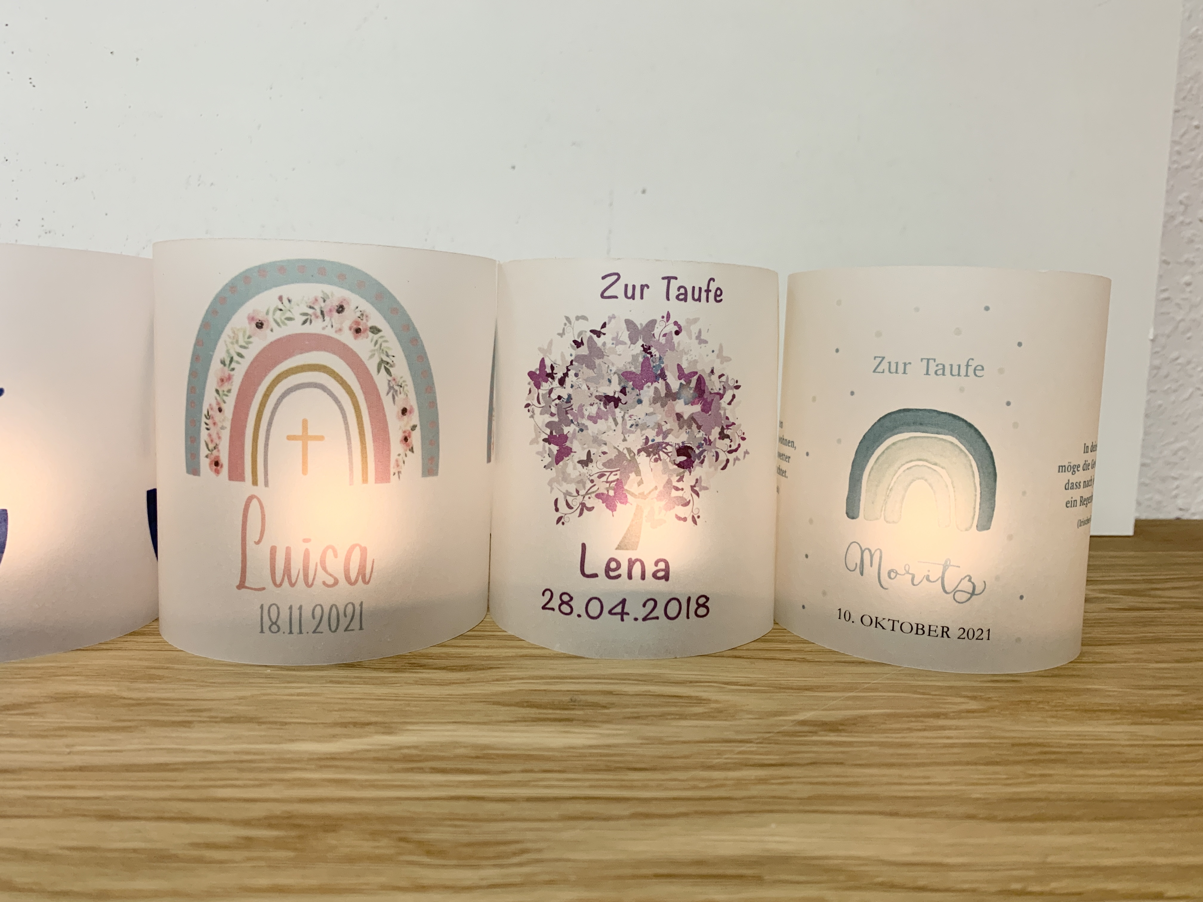 Passend zu euren Kerzen bieten wir auch wunderschöne Lichthüllen aus Transparentpapier an. Diese werden genau im Design eurer Kerzen(n) gestaltet und sind die perfekte Ergänzung für eure Tischdekoration. Nach der Feier können sie an liebe Menschen als Erinnerung verschenkt werden, oder ihr gebt den Lichthüllen bei euch zuhause einen schönen Platz. Die Lichthüllen sind nur in Verbindung mit der Bestellung einer unserer Kerzen verfügbar! Das Motiv kommt je nach Größe zwei- bzw. dreifach auf die Lichthüllen, sodass von jeder Seiten euer Design sichtbar ist.