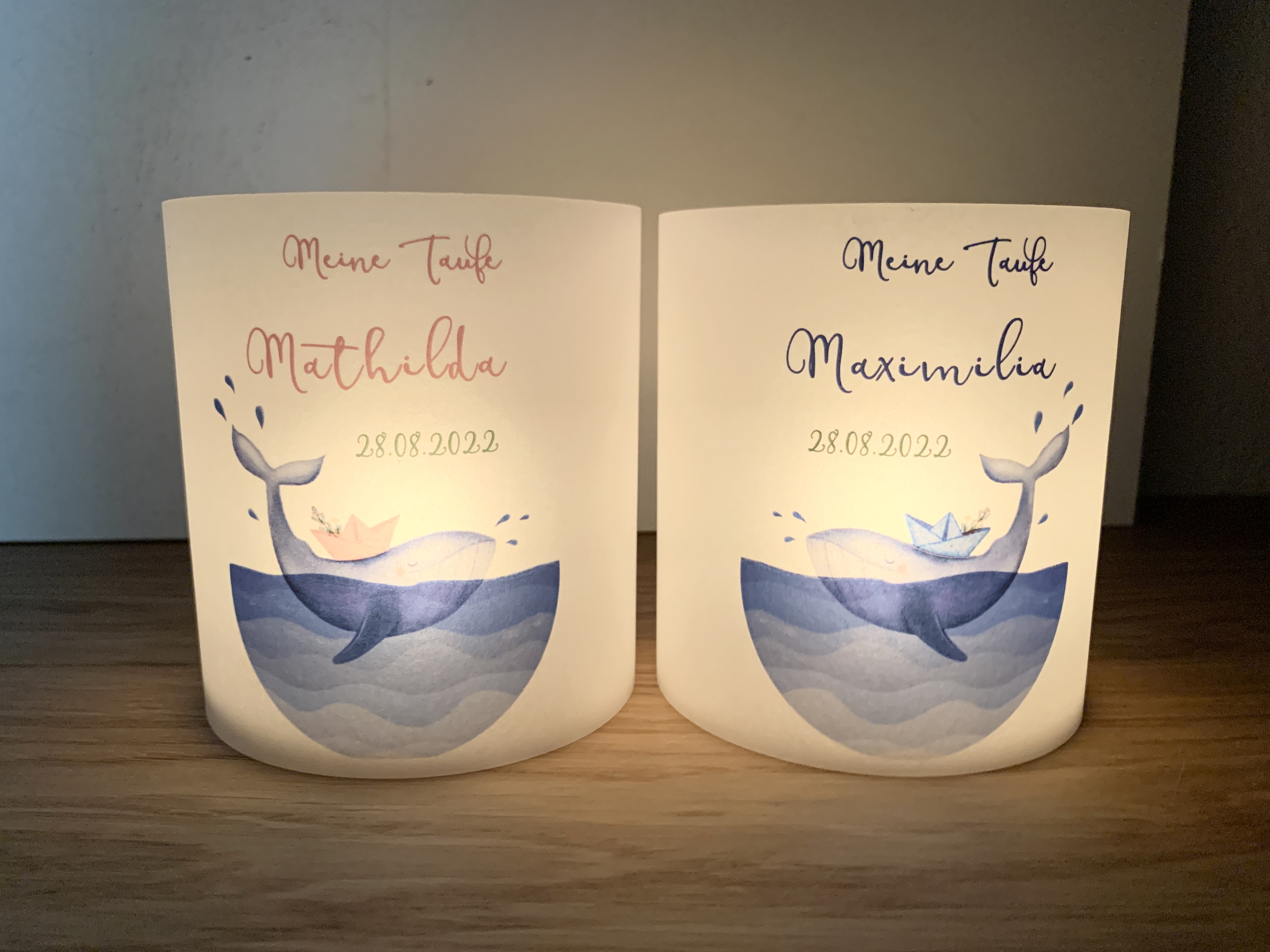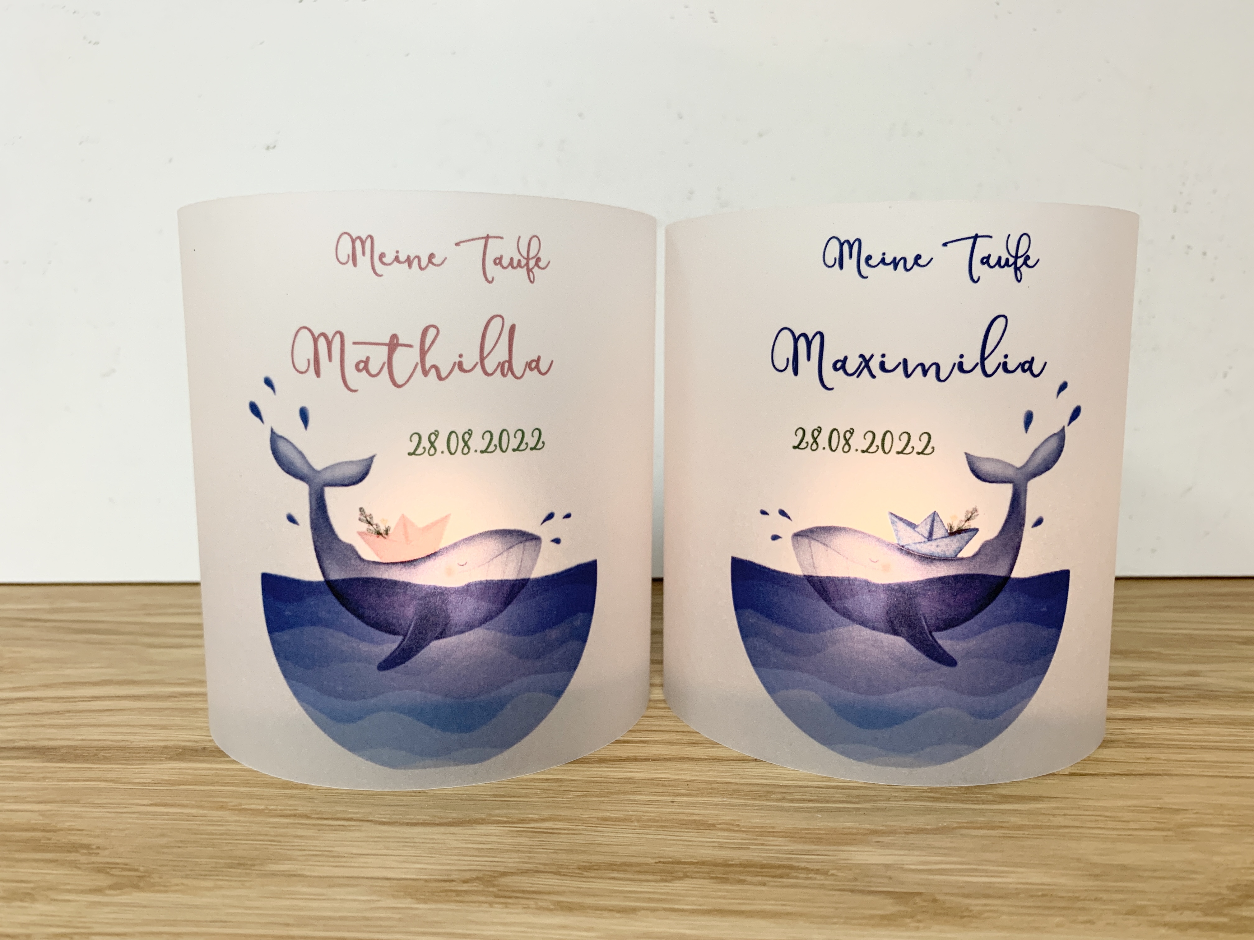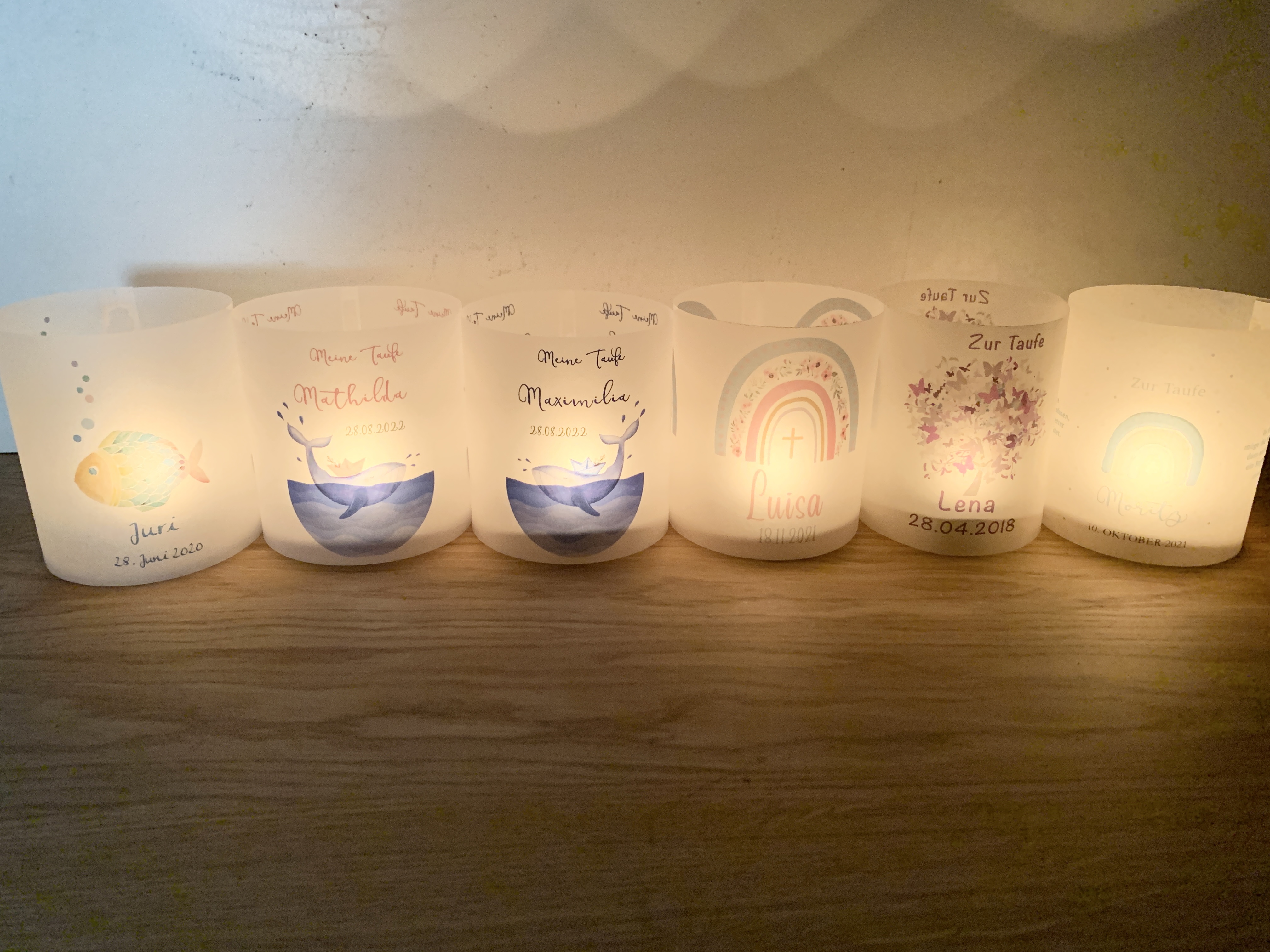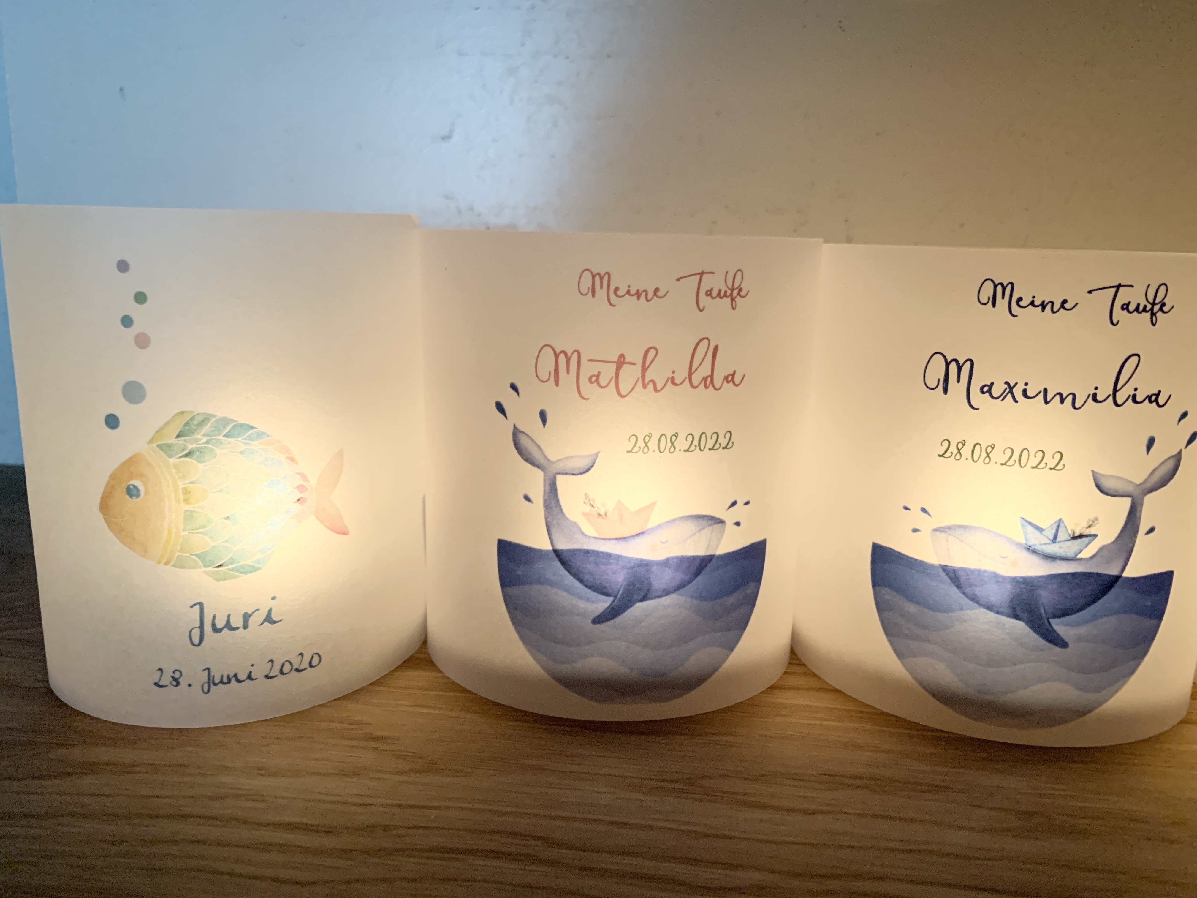 Passend zu euren Kerzen bieten wir auch wunderschöne Lichthüllen aus Transparentpapier an. Diese werden genau im Design eurer Kerzen(n) gestaltet und sind die perfekte Ergänzung für eure Tischdekoration. Nach der Feier können sie an liebe Menschen als Erinnerung verschenkt werden, oder ihr gebt den Lichthüllen bei euch zuhause einen schönen Platz. Die Lichthüllen sind nur in Verbindung mit der Bestellung einer unserer Kerzen verfügbar! Das Motiv kommt je nach Größe zwei- bzw. dreifach auf die Lichthüllen, sodass von jeder Seiten euer Design sichtbar ist.