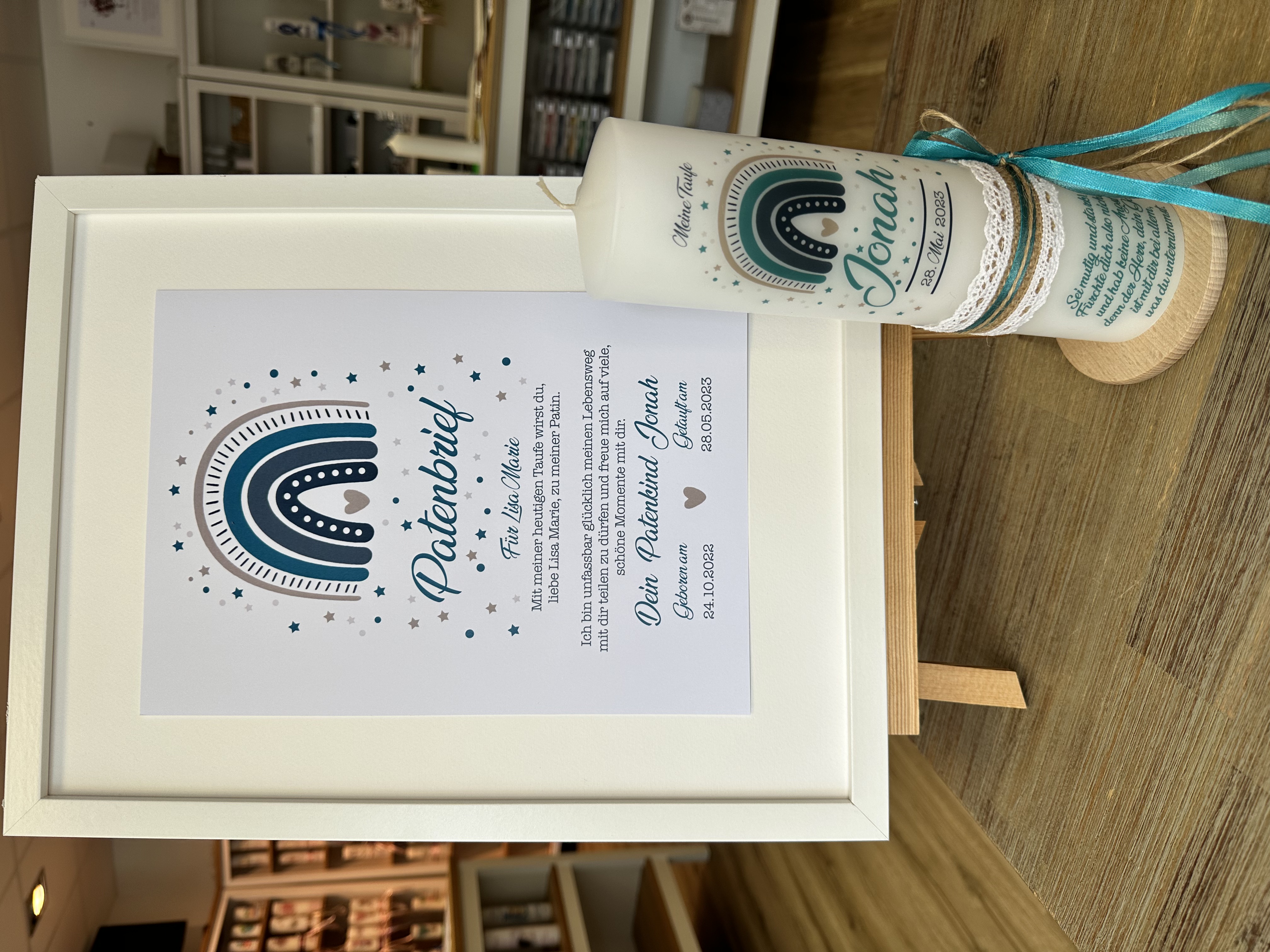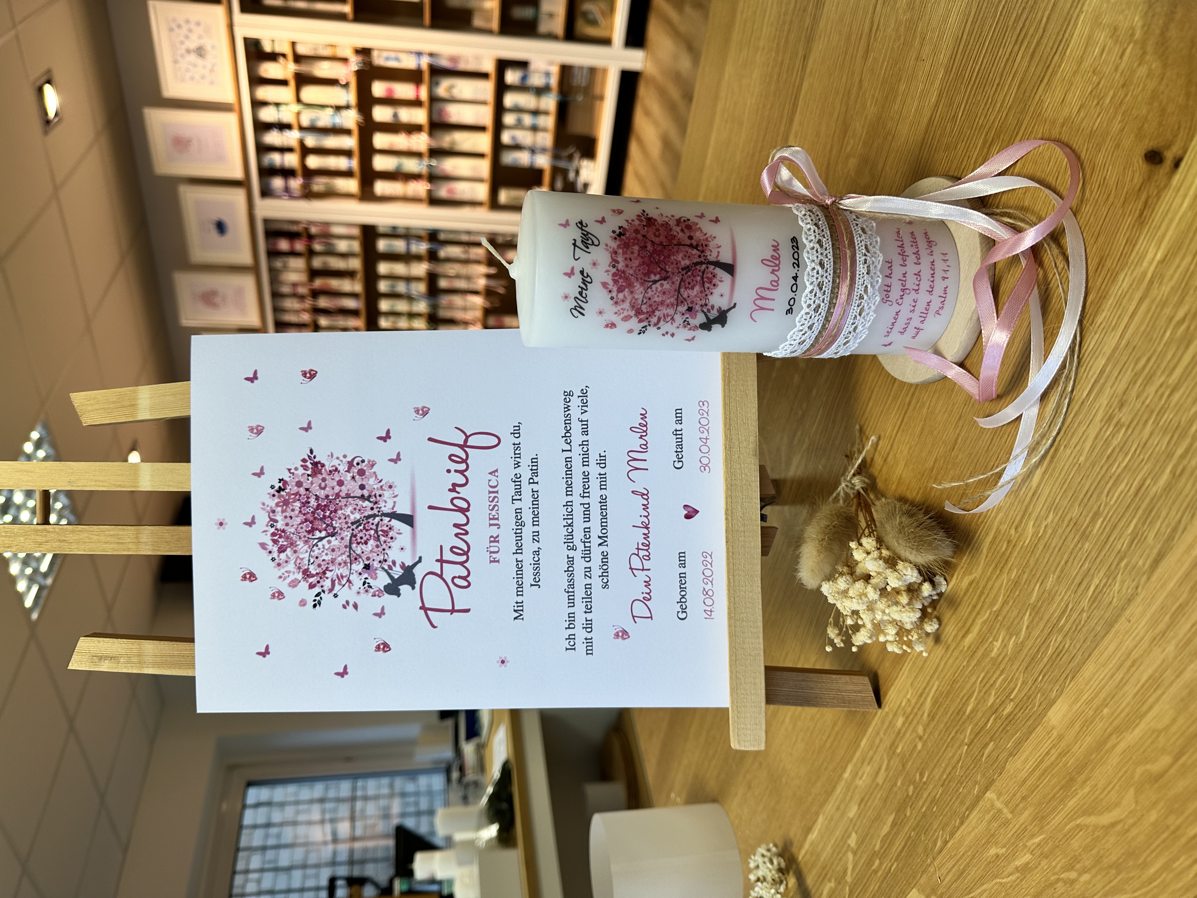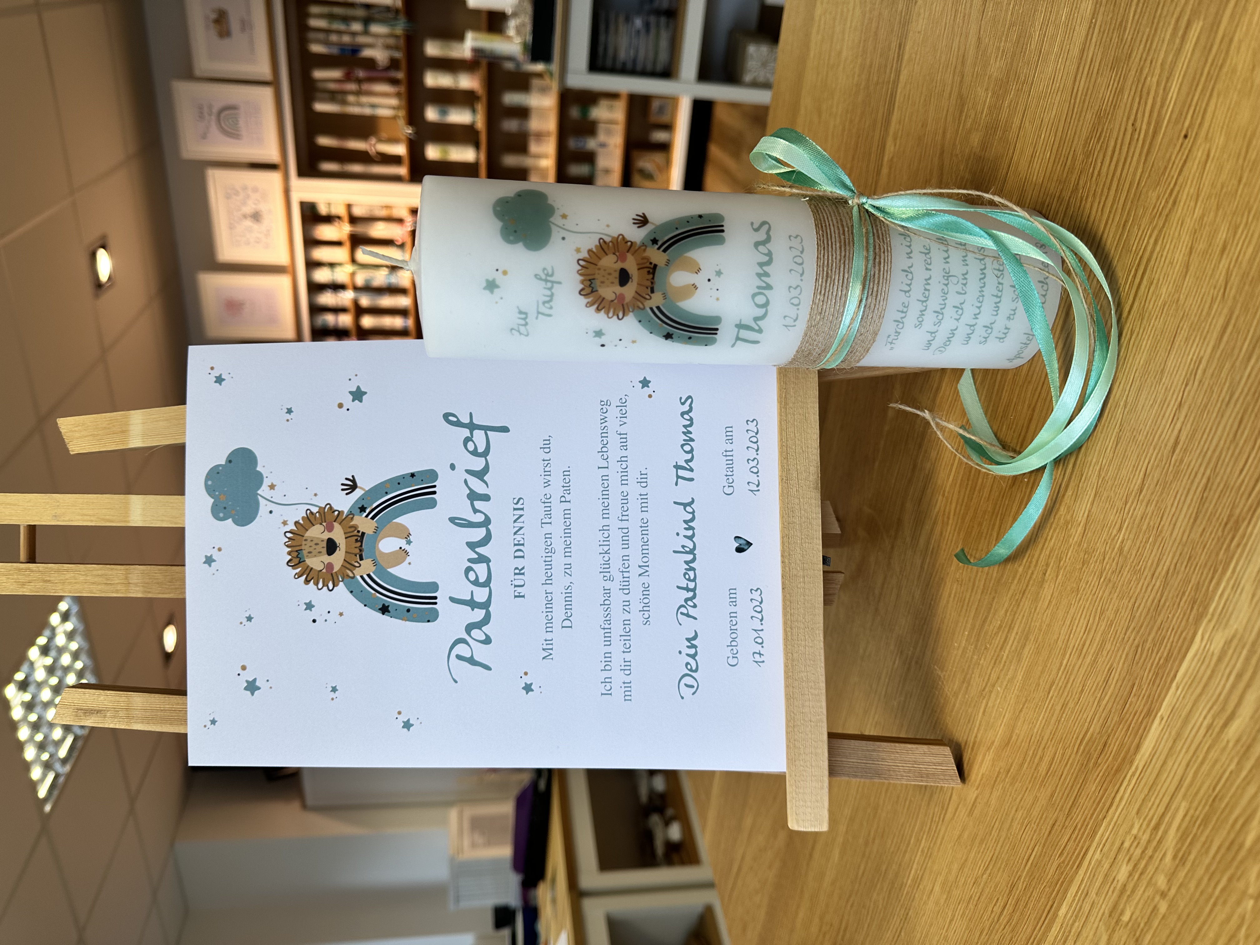 Wie wäre es mit einem Patenbrief mit dem Löwen und Lebensbaum? Beides sind beliebte Designs, wenn es um die Taufe geht. Wir gestalten den Patenbrief passend zur Taufkerze. Das bedeutet, dass jedes Kerzenmotiv als Patenbrief möglich ist aber auch ohne passende Kerze kannst du unsere beliebten Patenbriefe bekommen. Dazu teilst du uns bitte dein Wunschmotiv mit.
