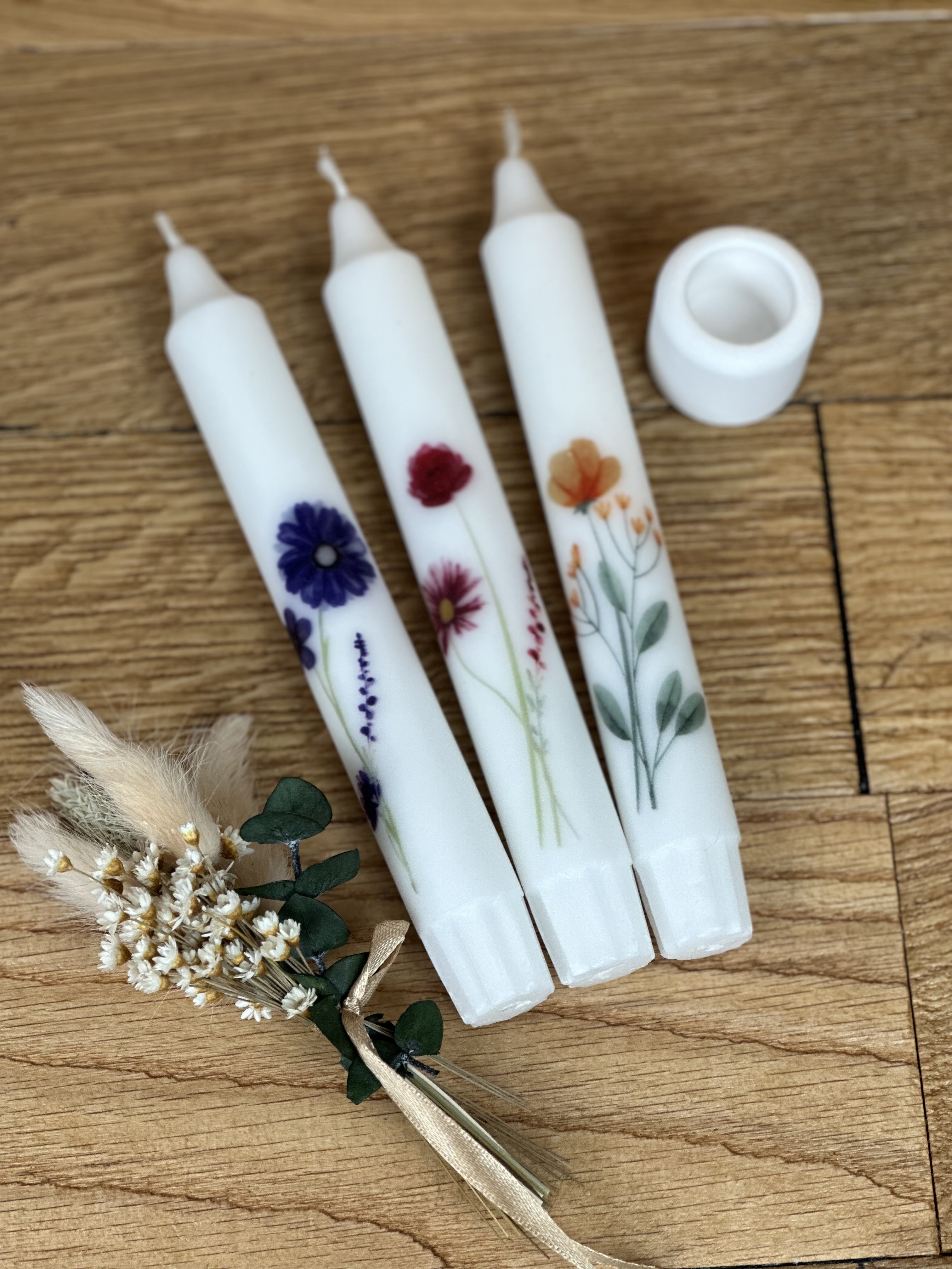 🎁 Geschenke- Set Blumig mit 3 Kerzen und Stabkerzenhalter in weiß