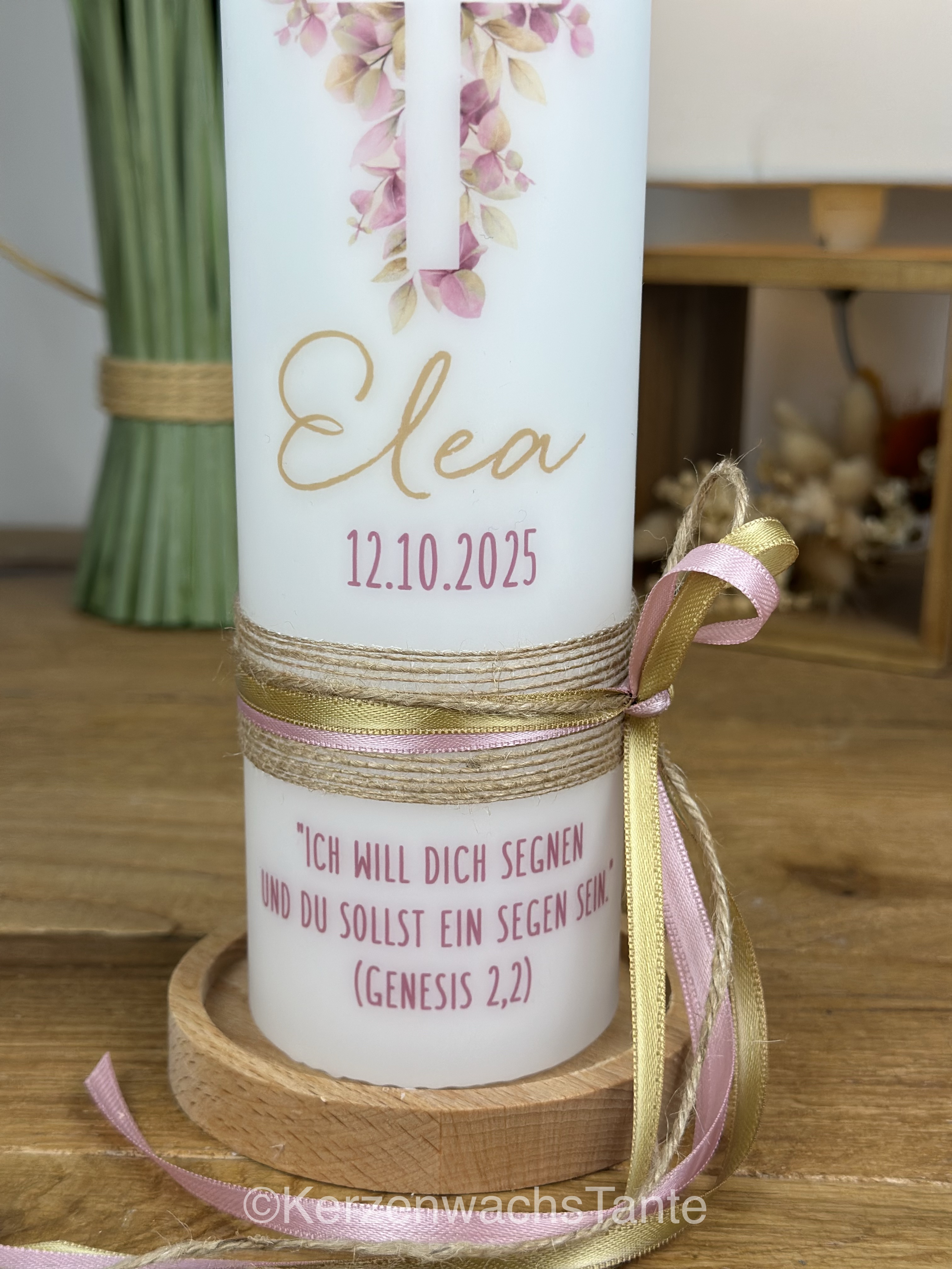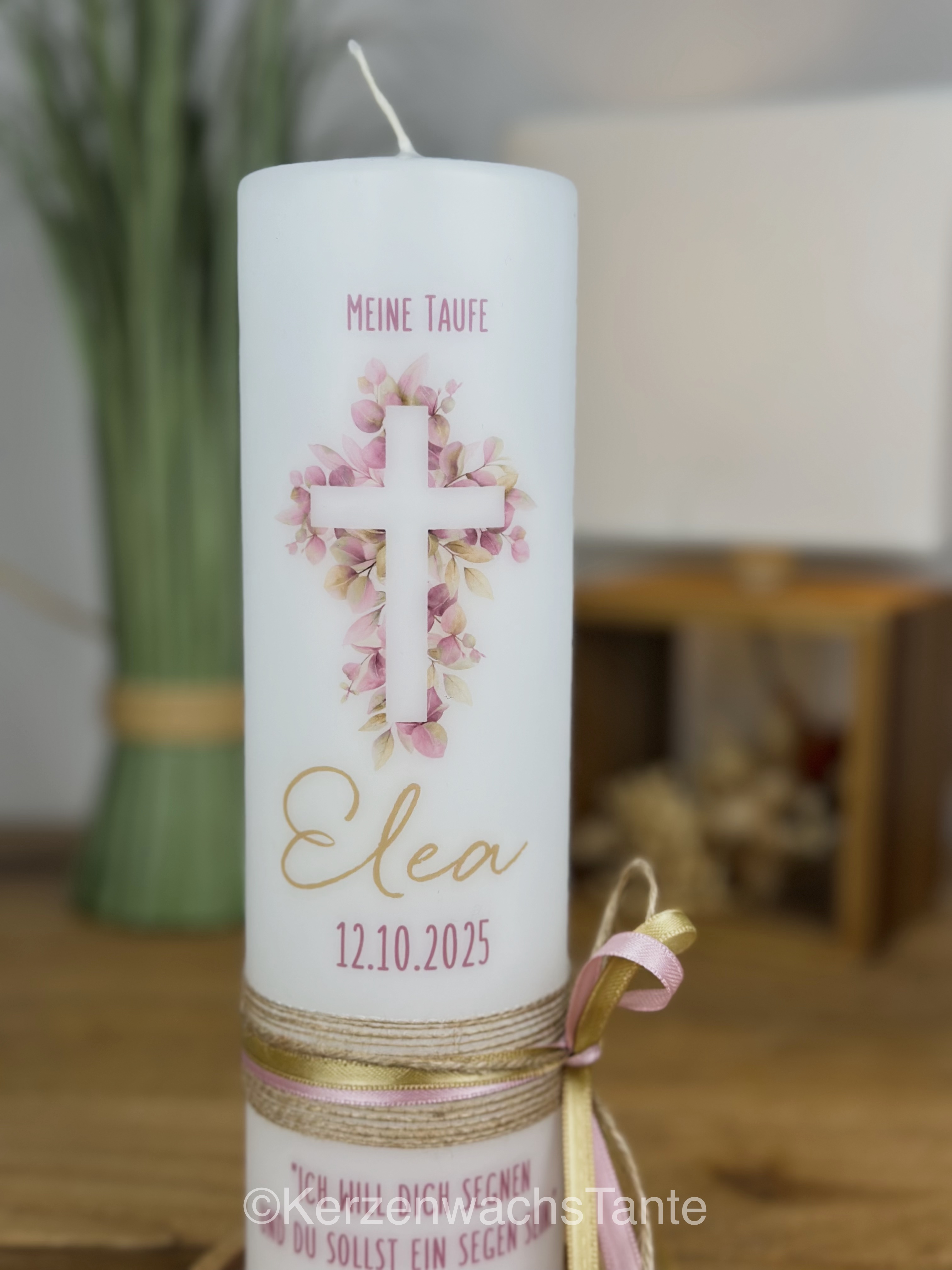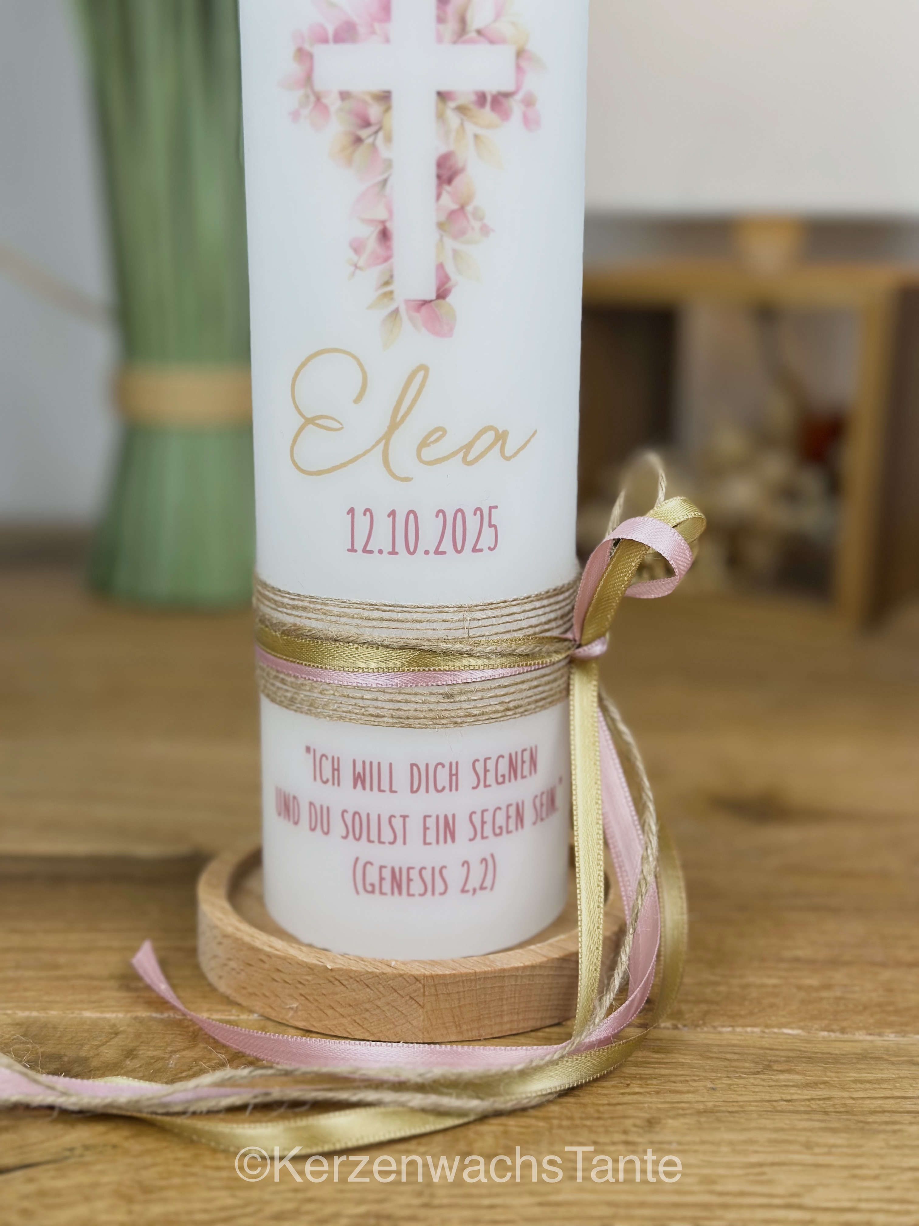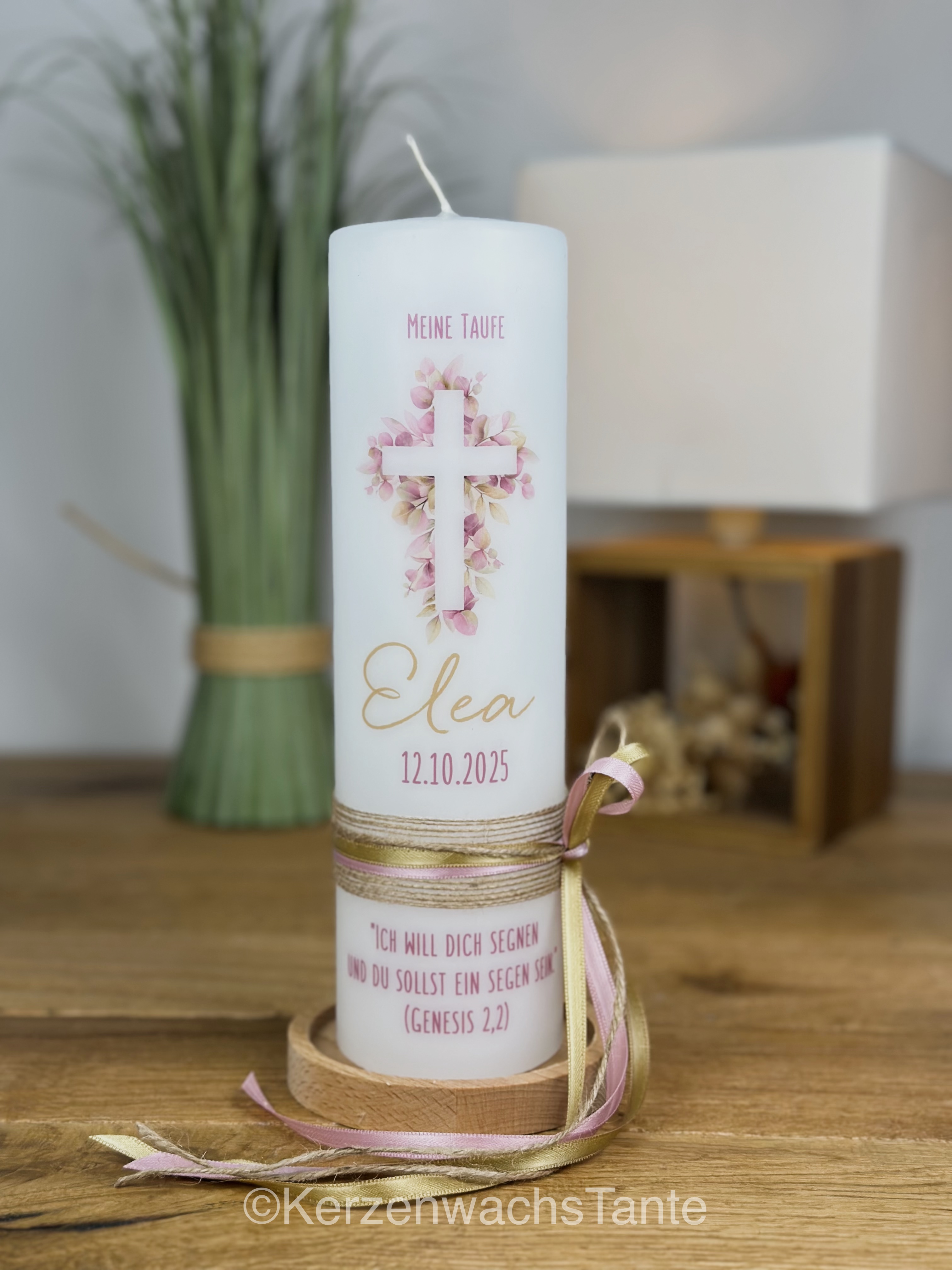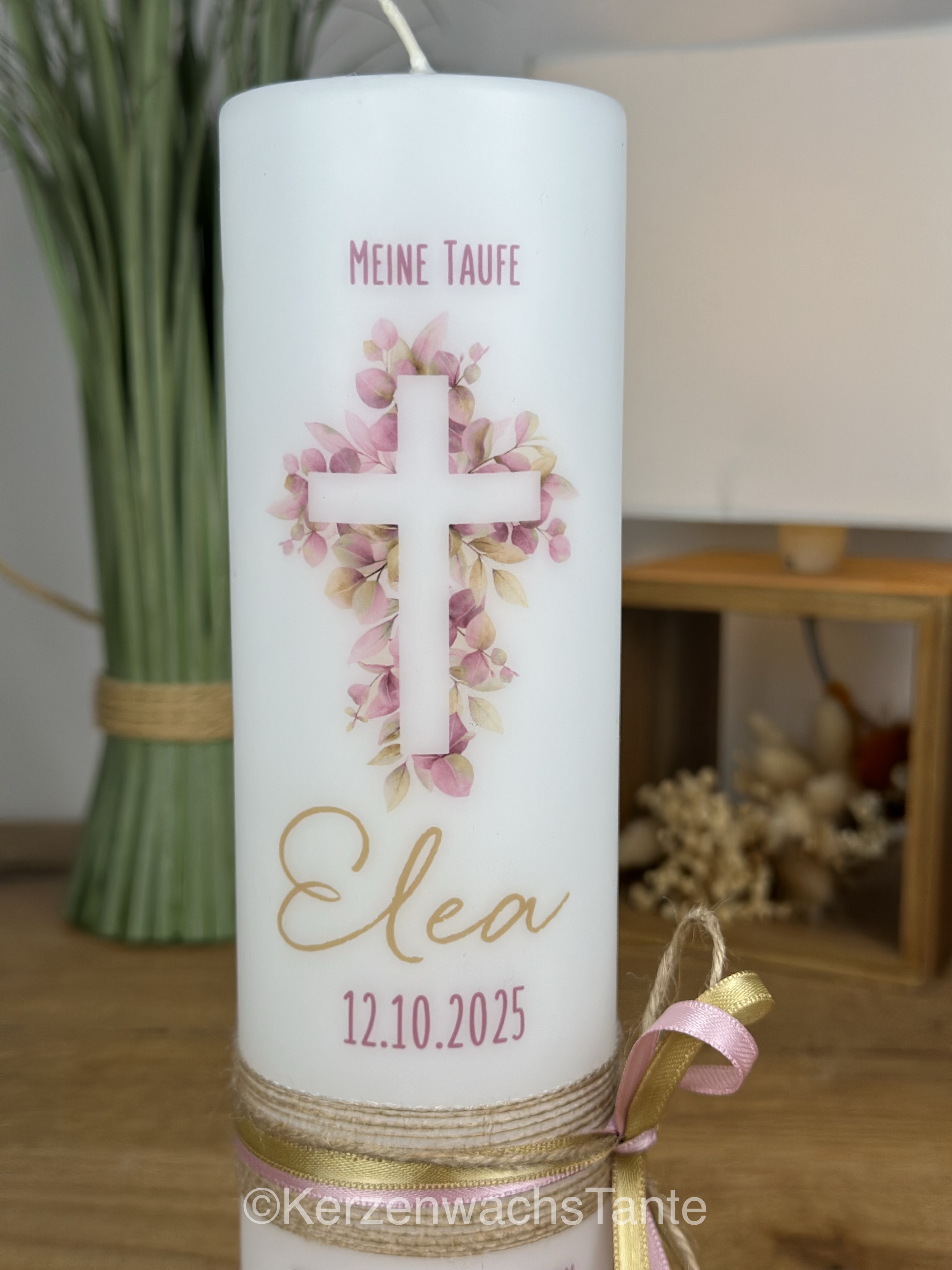Taufkerze Kommunionkerze Kreuz rosa-gold mit Juteband + Schlaufe seitlich in rosa-gold (Motiv 615)