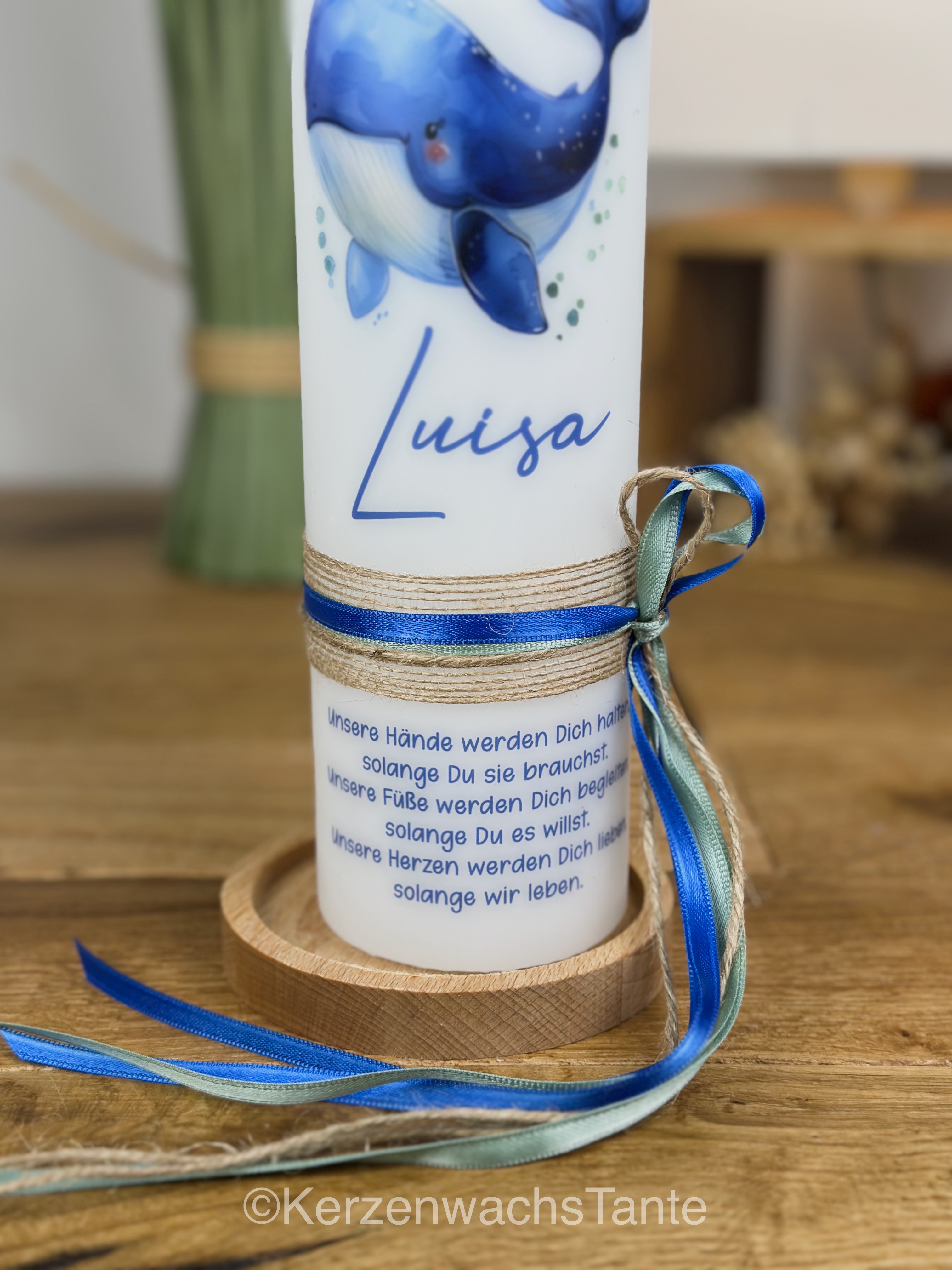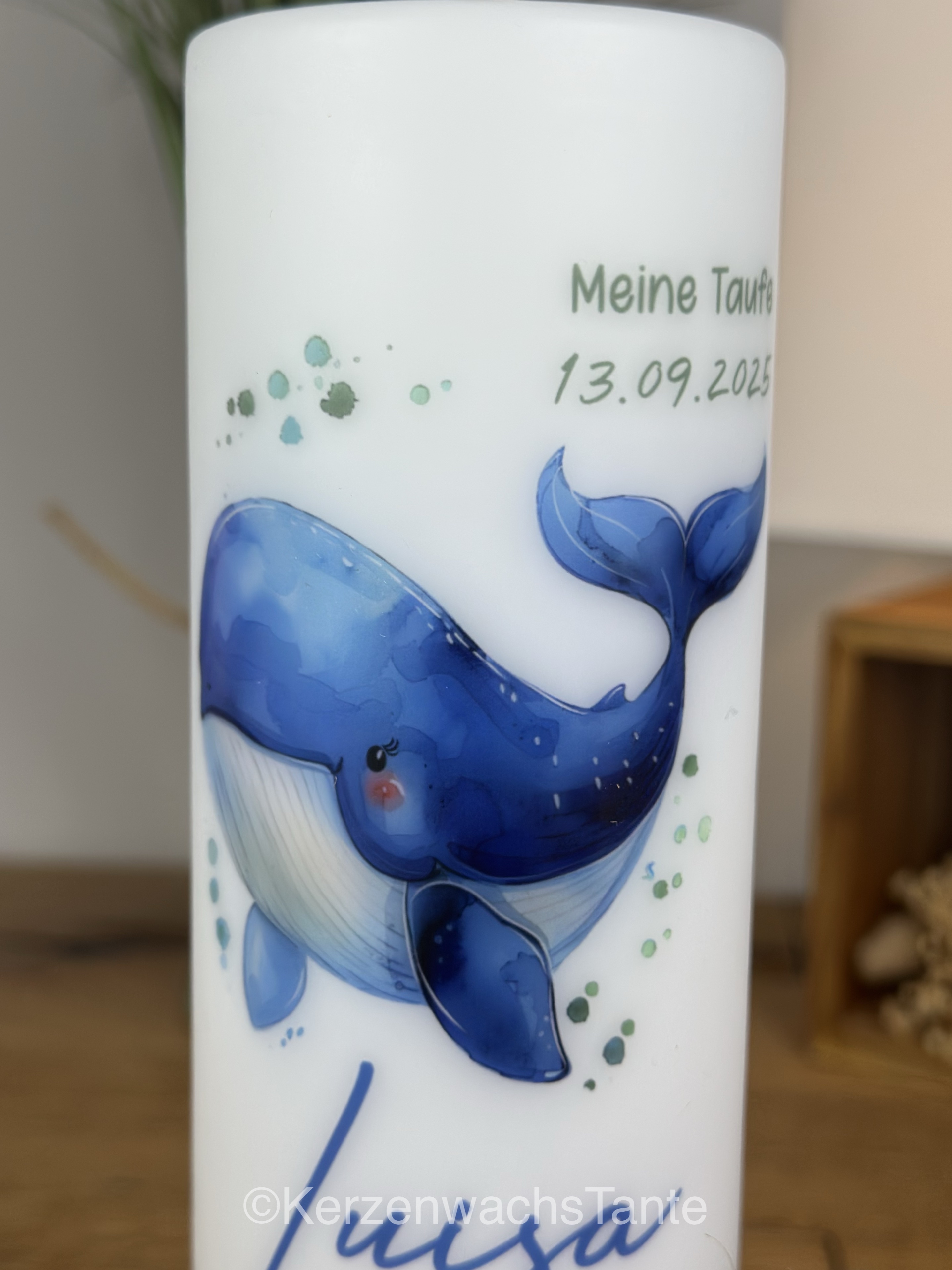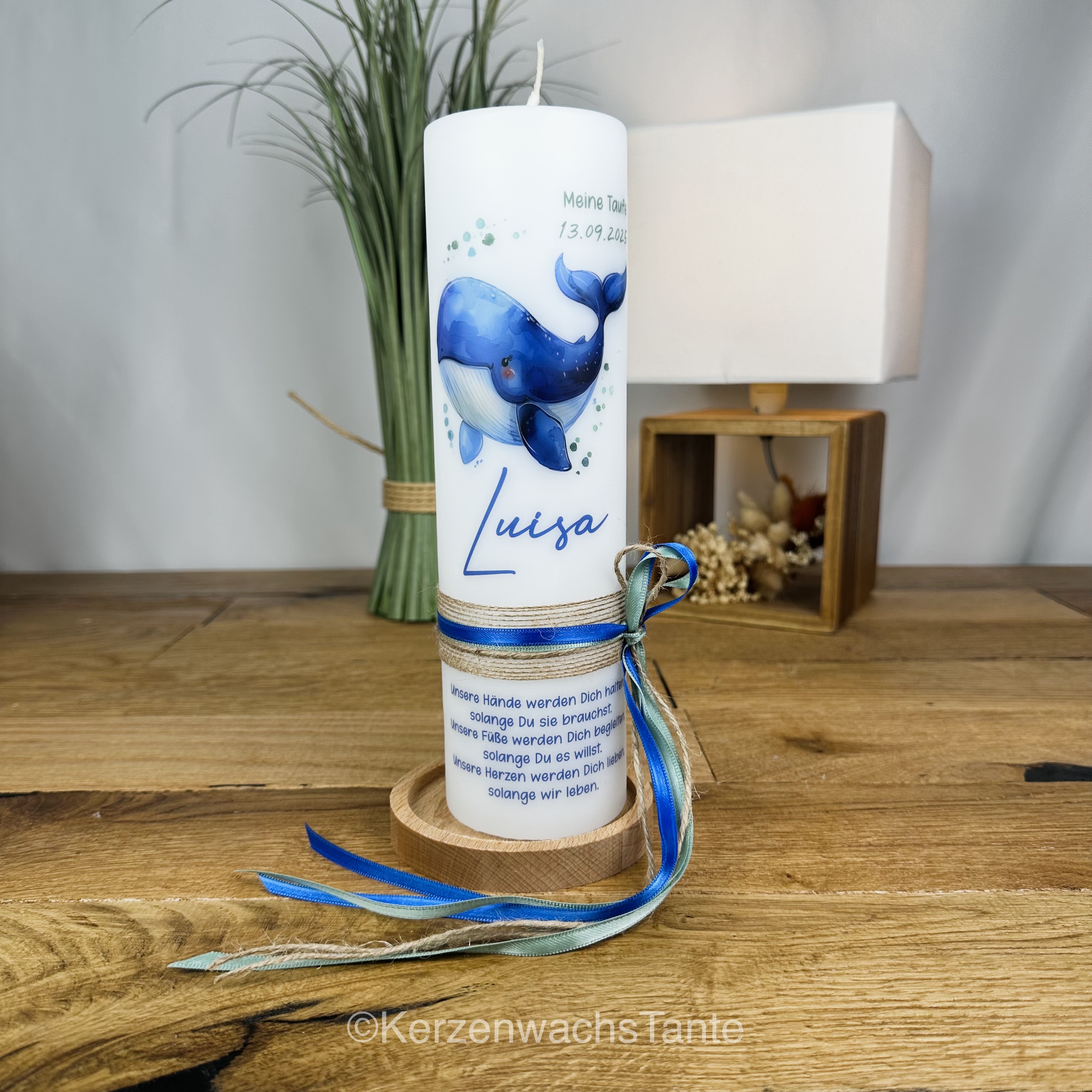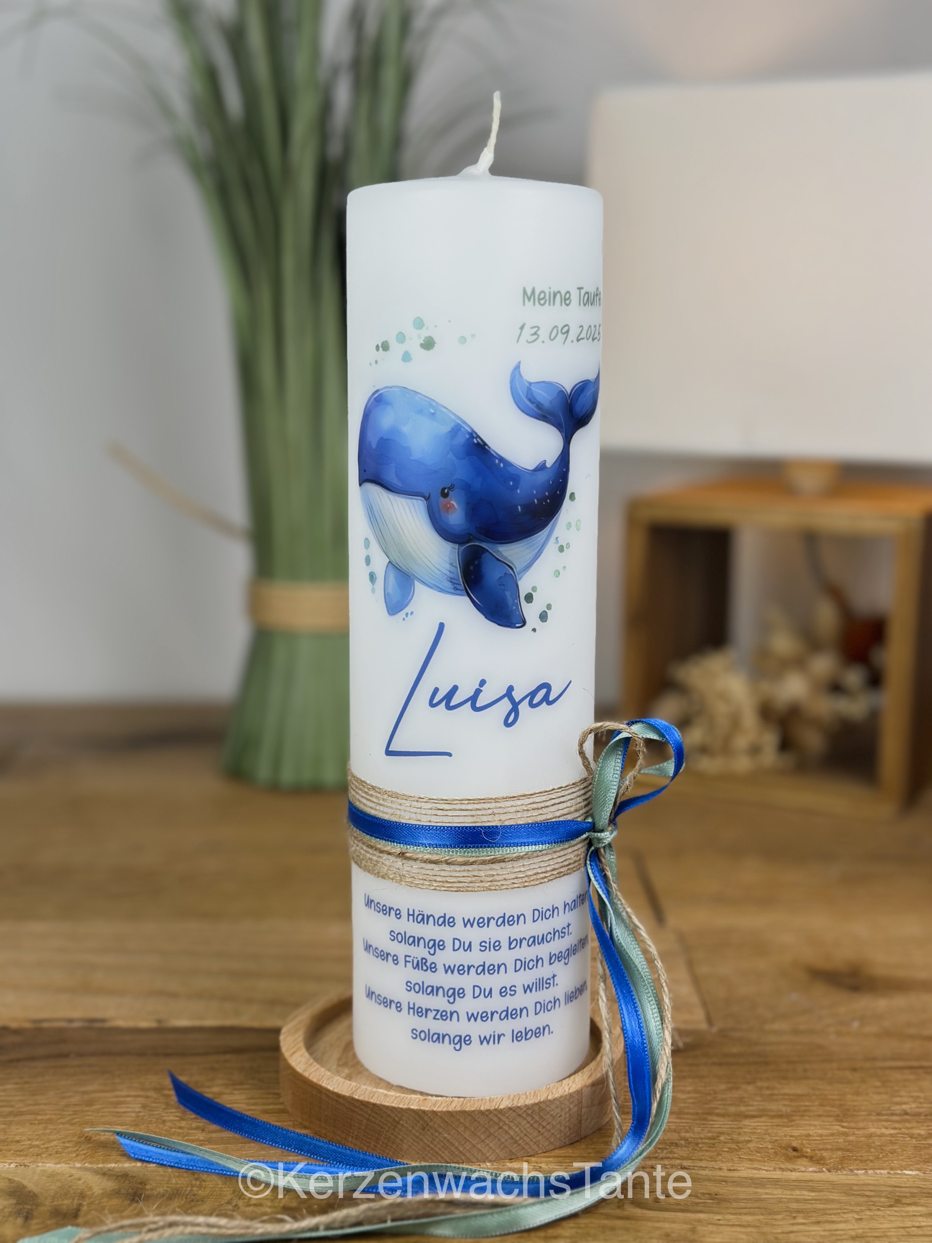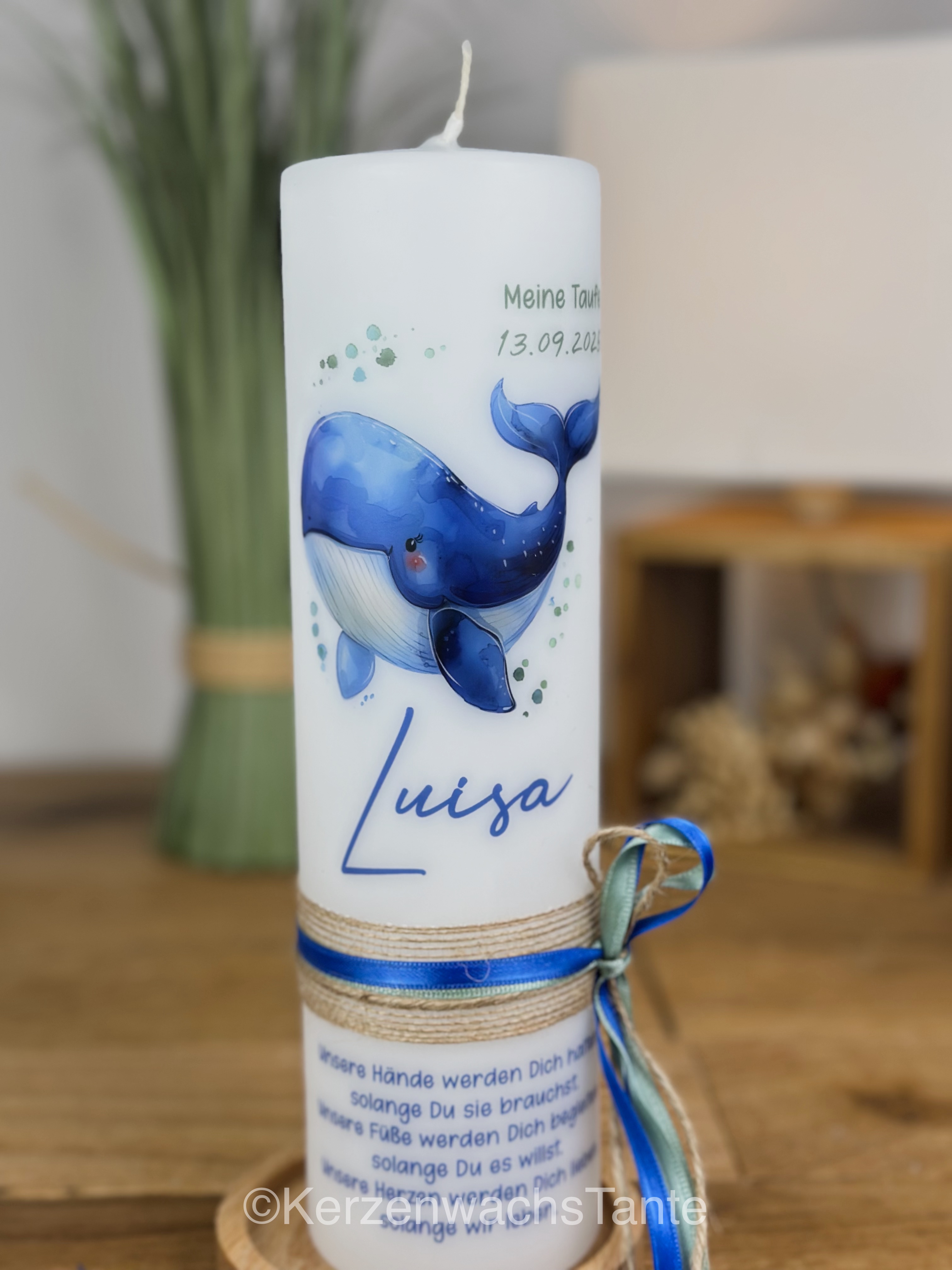 Taufkerze Kommunionkerze Wal Jonas mit Juteband + Schlaufe seitlich in Blautöne(Motiv 85)