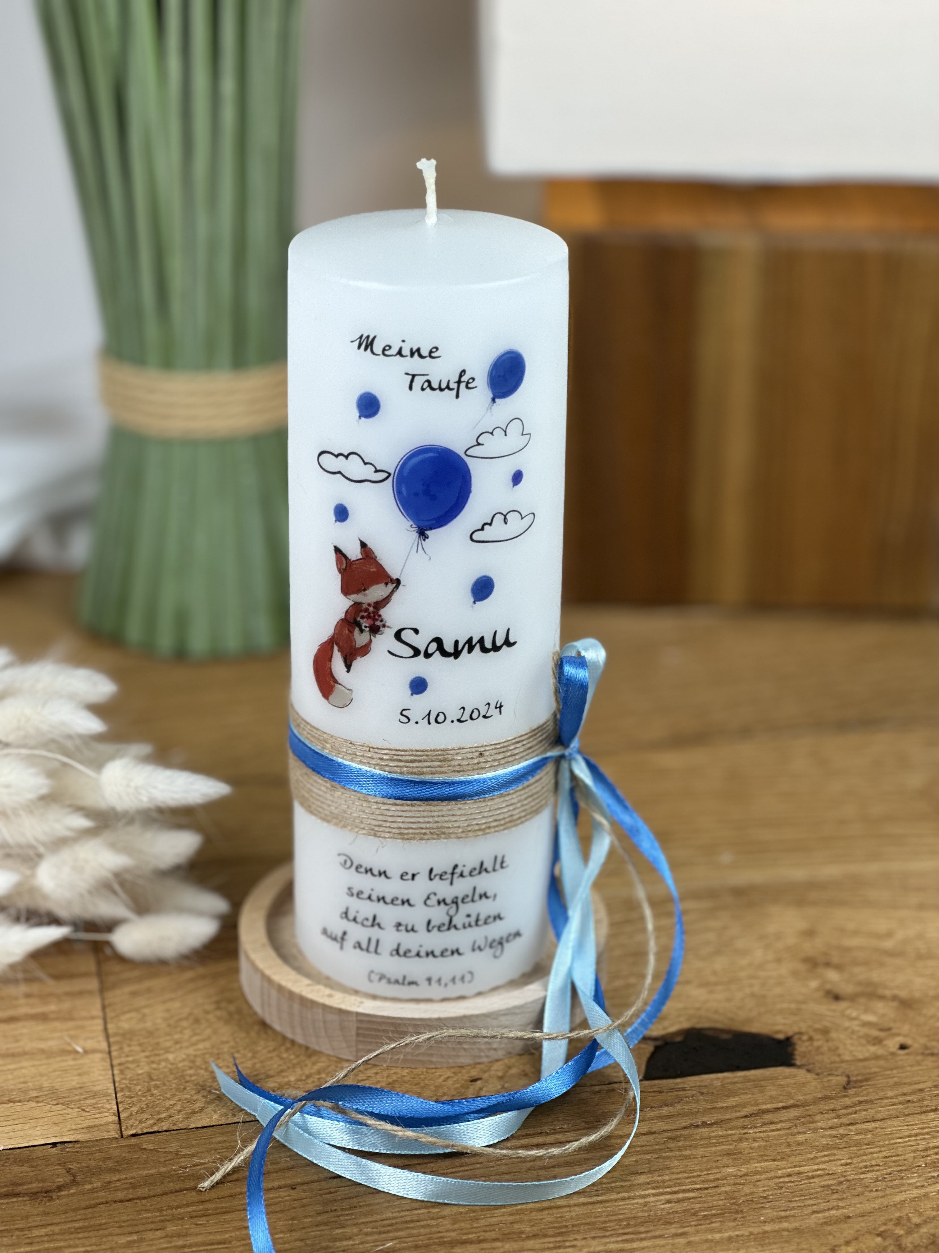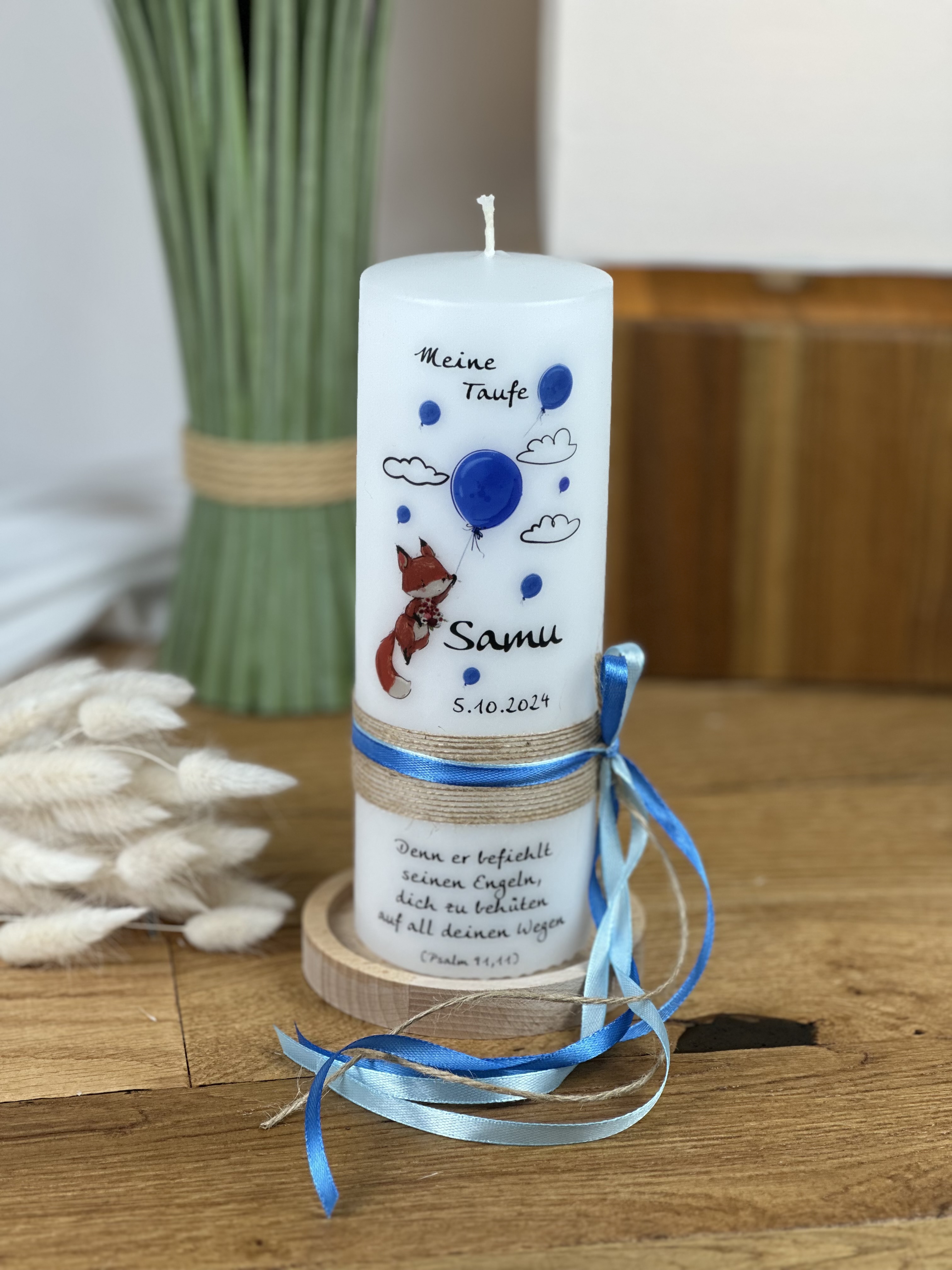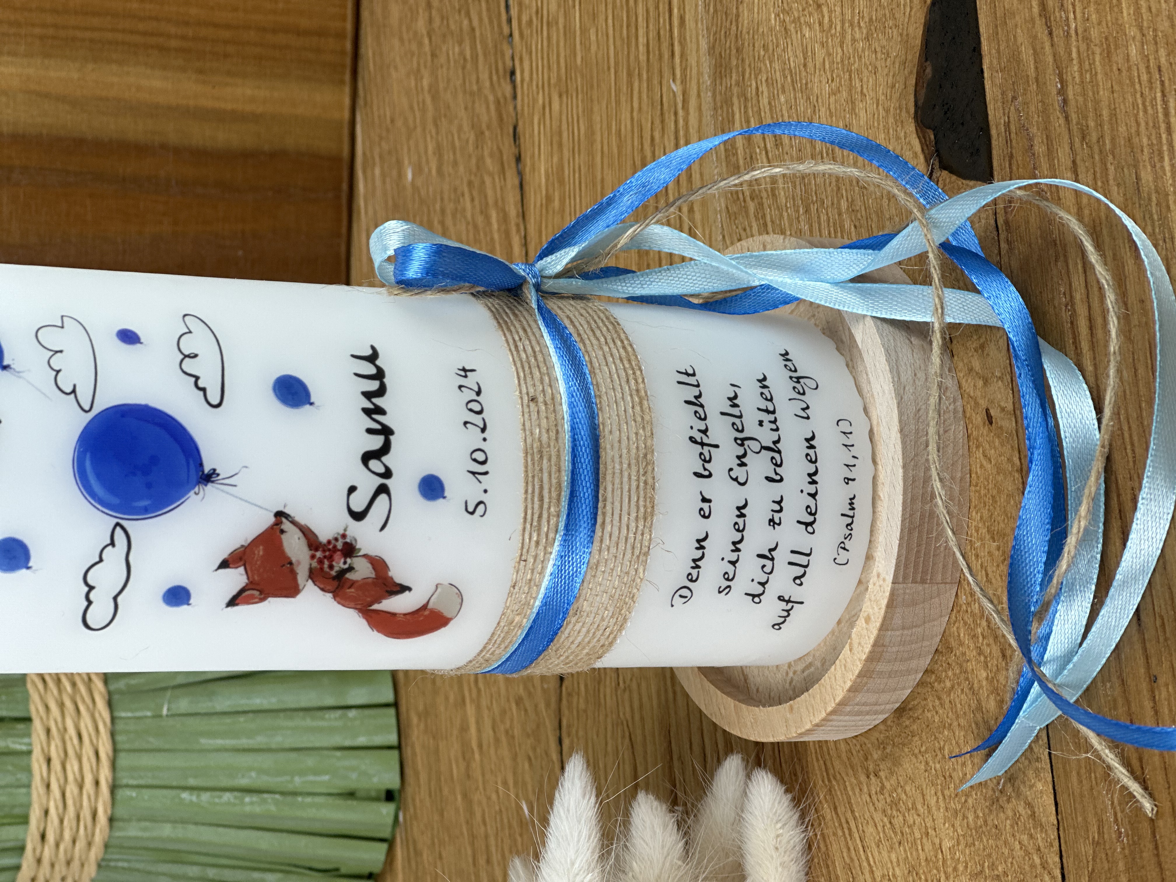 Taufkerze flieg kleiner Fuchs mit blauen Luftballons