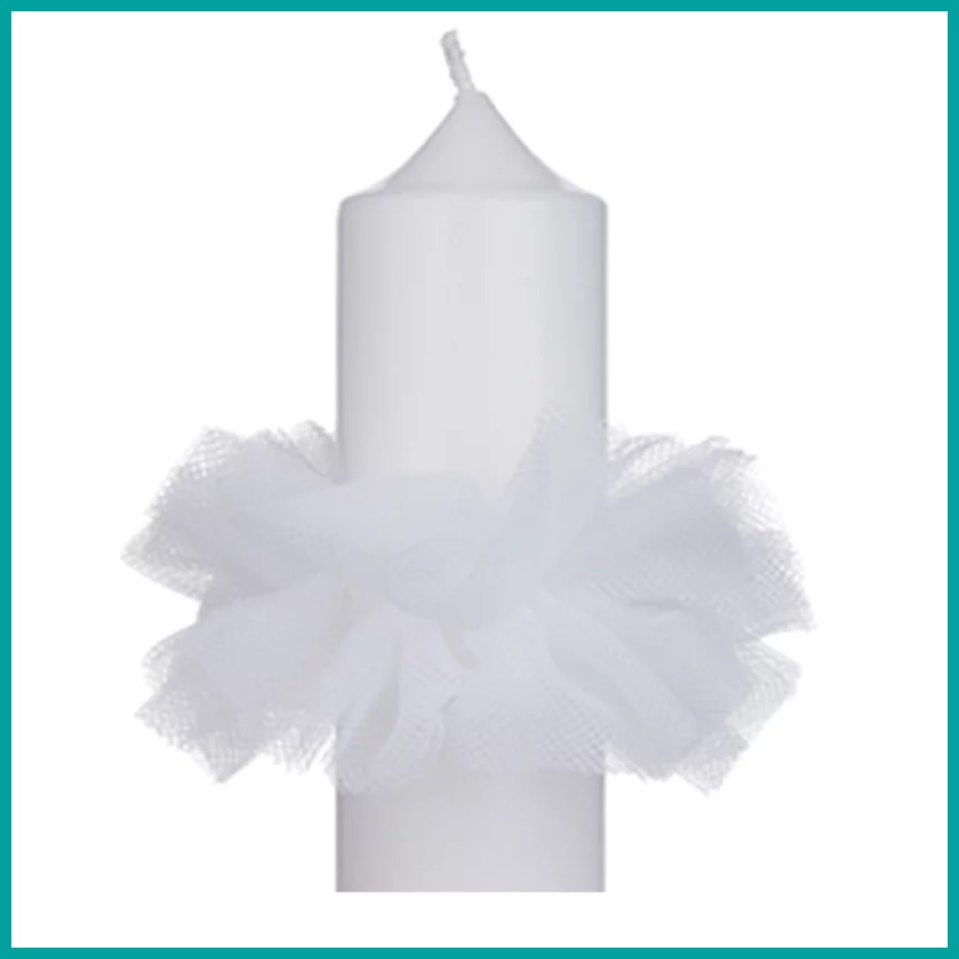 Die weiße Kerzenmaschette aus Tüll ist ein elegantes Accessoire, das Ihre Kerzen in ein zauberhaftes Licht taucht. Mit einem Durchmesser von ca. 4 cm passt sie perfekt auf Taufkerzen, Kommunionkerzen oder Hochzeitskerzen.